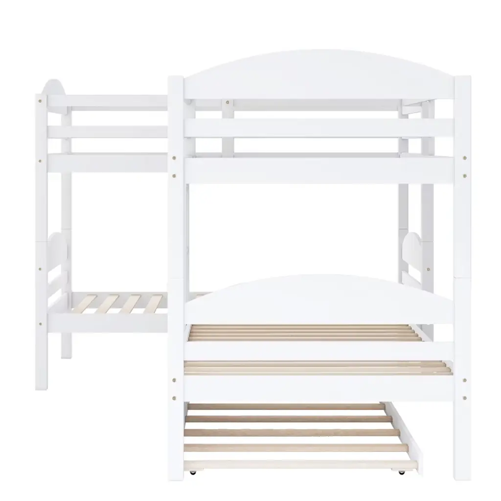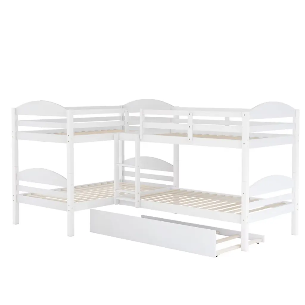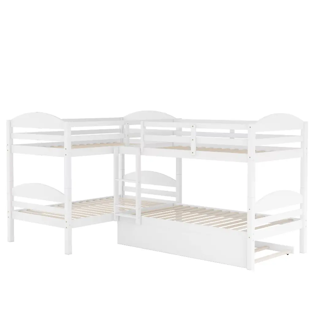 L-shaped Twin Bunk Bed With Trundle For 4 Kids, Pine Wood Twin Size Bunk Bed Frame, Can Be Separated Into Two Beds, White
