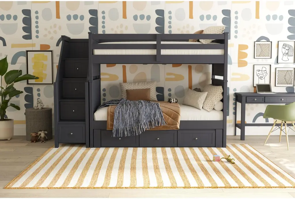 The Luca Blue Twin Over Twin Wood Bunk Bed With Stairway & 3-Drawer Storage Unit is perfect for maximizing space in your child's room. Its contemporary design and solid pine and MDF construction ensure durability and style. The built-in stairs and multiple storage drawers provide convenient and ample storage options.