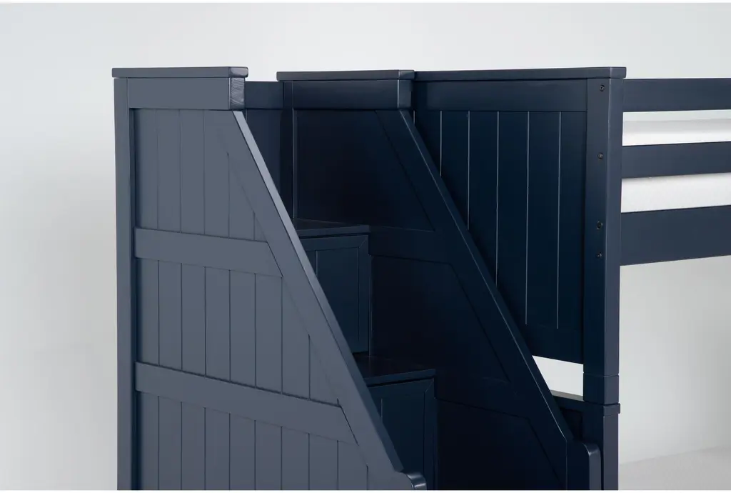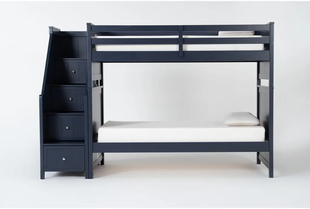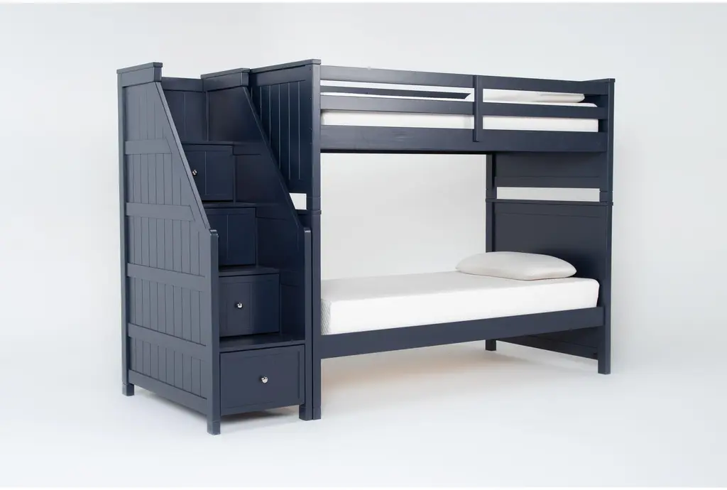 Luca Blue Twin Over Twin Wood Bunk Bed With Stairway | Drawers | Storage