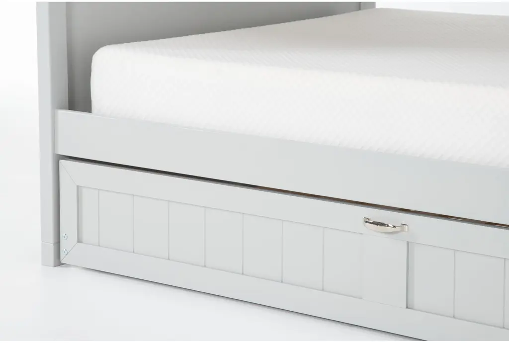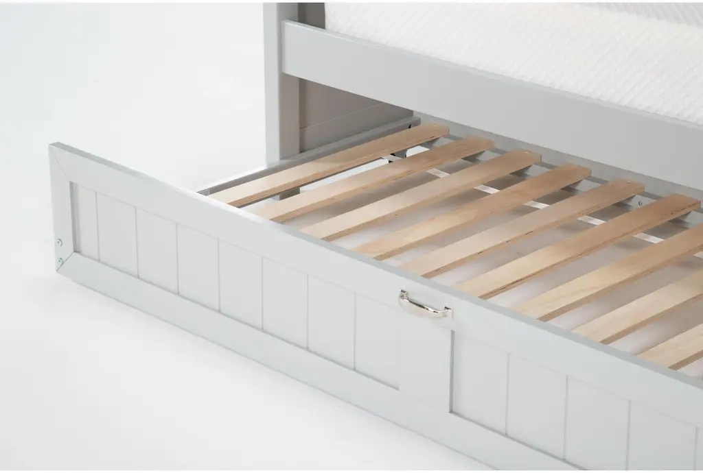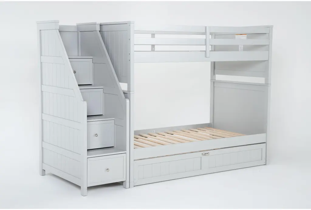 Introducing the Luca Grey Full Over Full Wood Bunk Bed with Stairway & Twin Trundle. This contemporary bunk bed is perfect for kids' rooms, offering ample space and convenient storage solutions. Crafted from solid pine and MDF, it provides durability and functionality in a stylish design.
