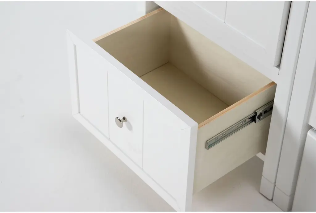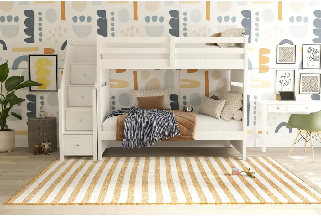 The Luca White Full Over Full Wood Bunk Bed with Stairway and Storage is a perfect solution for maximizing space in a kids' room. This contemporary bunk bed features a sturdy construction and a clean, white finish that complements any decor. Designed for functionality, it includes stairs for easy access to the top bunk and multiple storage drawers to keep the room organized.