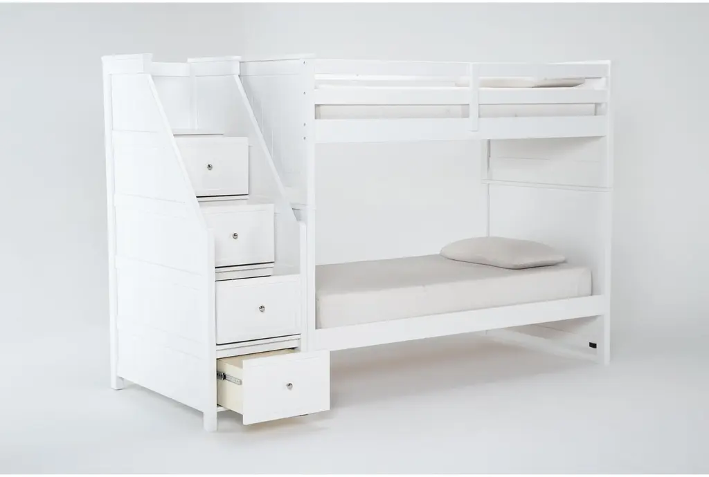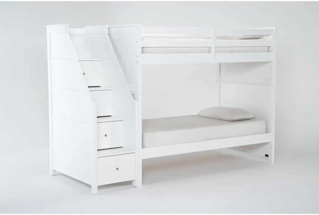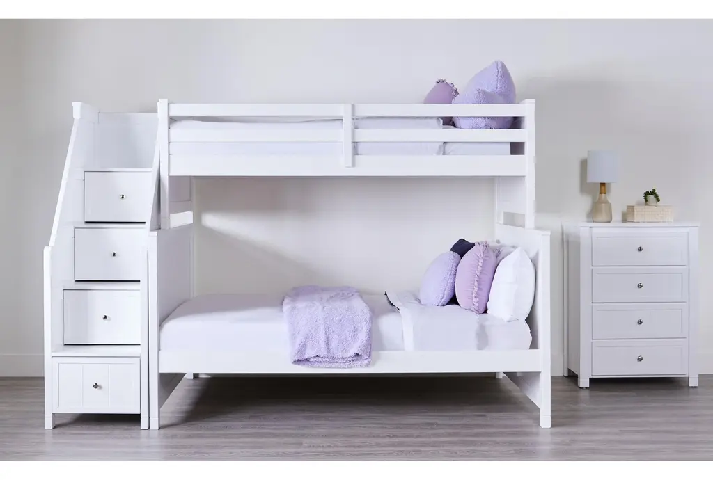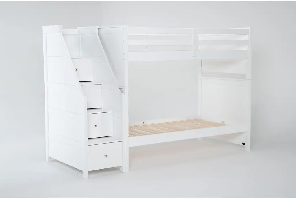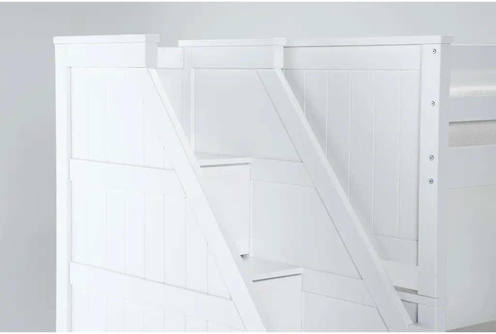 Luca White Full Over Full Wood Bunk Bed With Stairway With Storage | Drawers