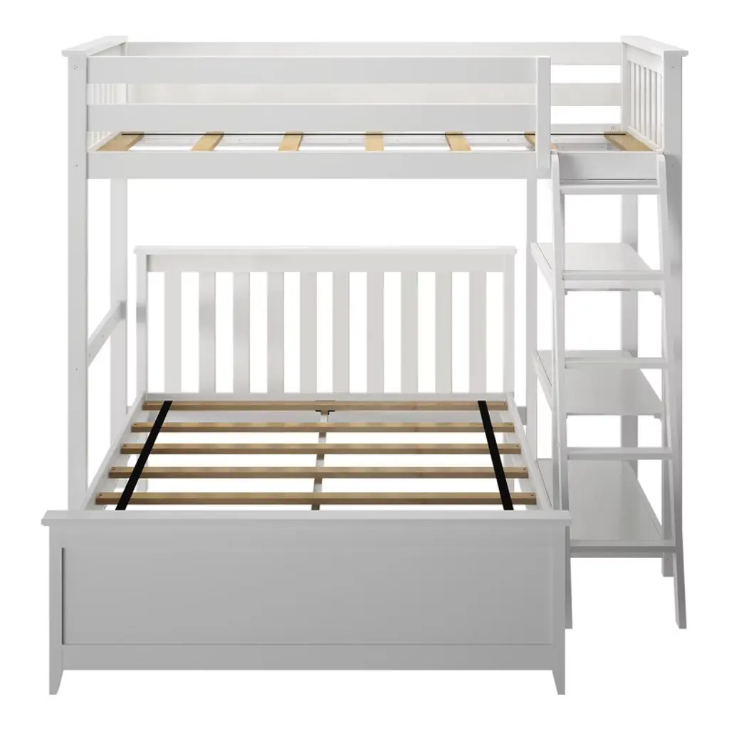 Plenty of room for sleep, study and play? Now that’s a win-win! The Max & Lily Twin Over Full L-Shape Bunk Bed with Bookcase is the perfect combination of functional and fun that both kids and parents love. Top bunk features tall 14” guardrails for extra sleep security up high. For best fit and safety, we recommend using a 5-inch mattress, and not exceeding an 8-inch mattress. Lower bed is not attached to the top bed and can be moved independently. Practical storage shelves give you the space to organize all your toys, books and school essentials. Angled ladder with wide anti-slip steps offers comfortable, easy climbing. Added bonus - ladder and shelves are both reversible upon assembly, so they fit great in any space. All Max & Lily products use a durable, low VOC finish. The slatted head and footboards and flush, color-matched hardware give this bunk bed a clean, modern look. Instructions, upper/lower slat rolls, and required hardware are included. Constructed with solid, knot-free New Zealand pine wood for long-lasting strength and sturdiness. With solid plywood slats and a metal support bar, each sleeping surface can support 400 pounds of resting weight. This bed meets or exceeds Federal safety standards for kids furniture. When it’s time for play, this bunk bed’s space saving design frees up plenty of floor space by stacking two sleeping surfaces. Add a desk (purchase separately) to turn your bed into the ultimate homework and craft zone. 2+ adults make assembly simple and easy. The Twin Over Full L-Shape Bunk Bed with Bookcase from Max & Lily offers exceptional quality and affordability that kids and their parents will enjoy for years to come. Max & Lily is a member of the Maxwood family of brands - the kids furniture experts bringing a tradition of superior quality, safety and fun!