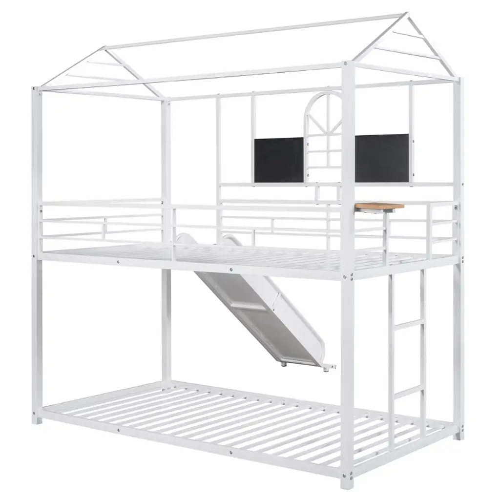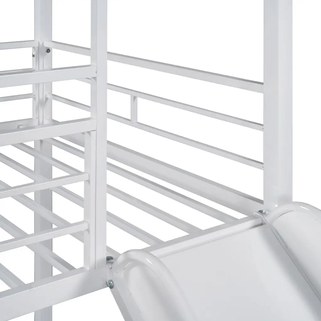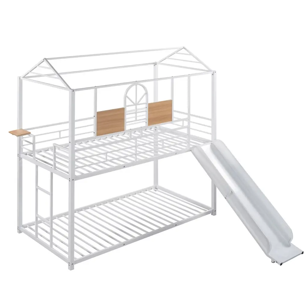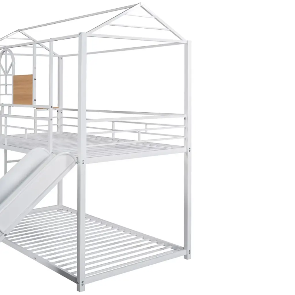 Metal Bunk Bed Twin Over Twin Bunk Bed Frame With Slide, Twin Over House Bed With Guardrails For Kids Bedroom, White