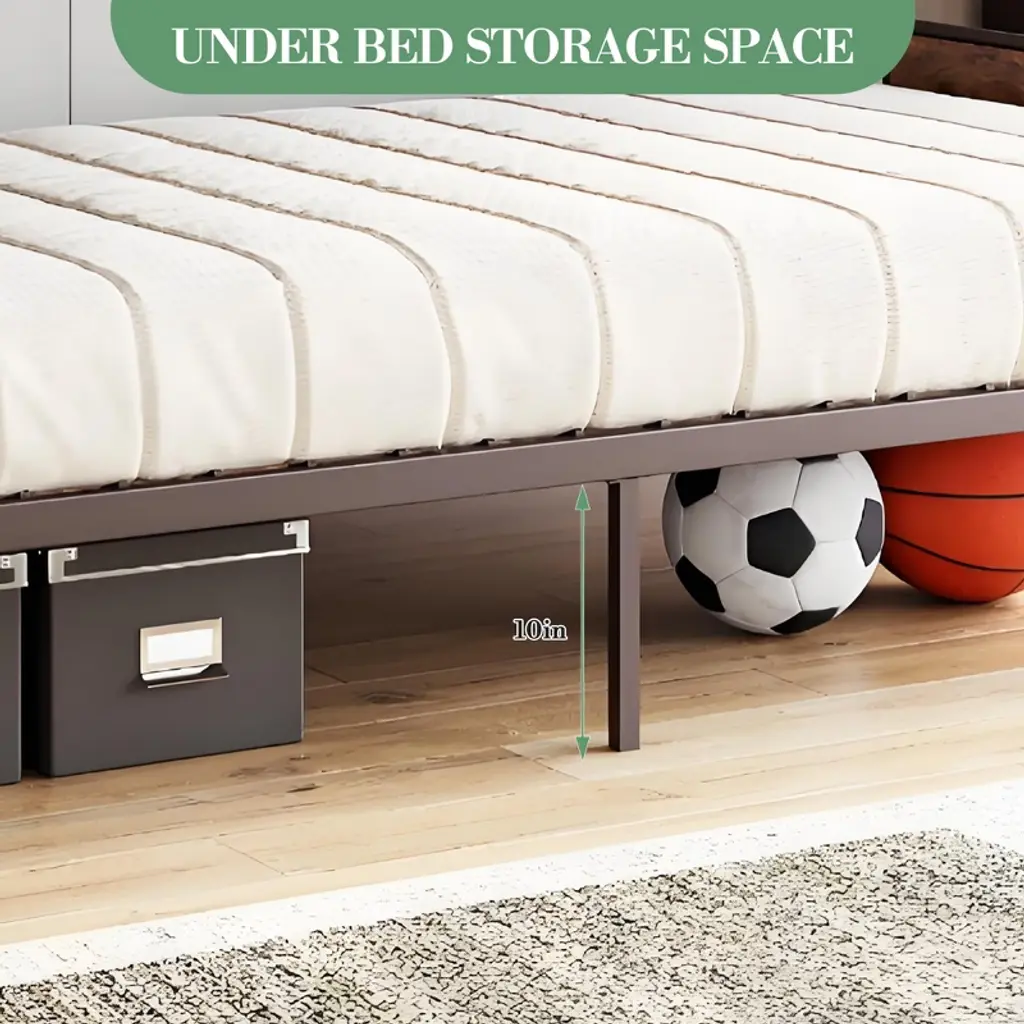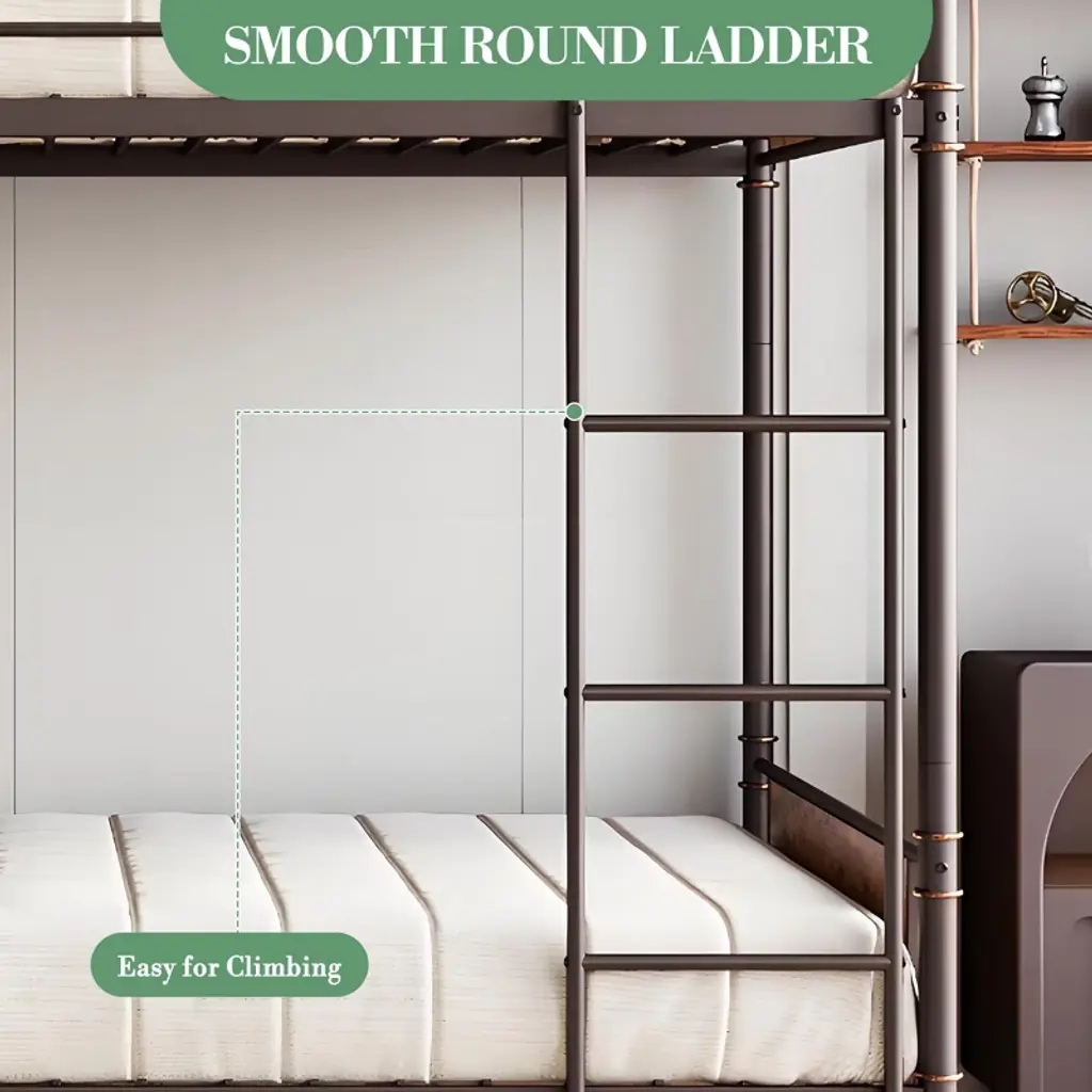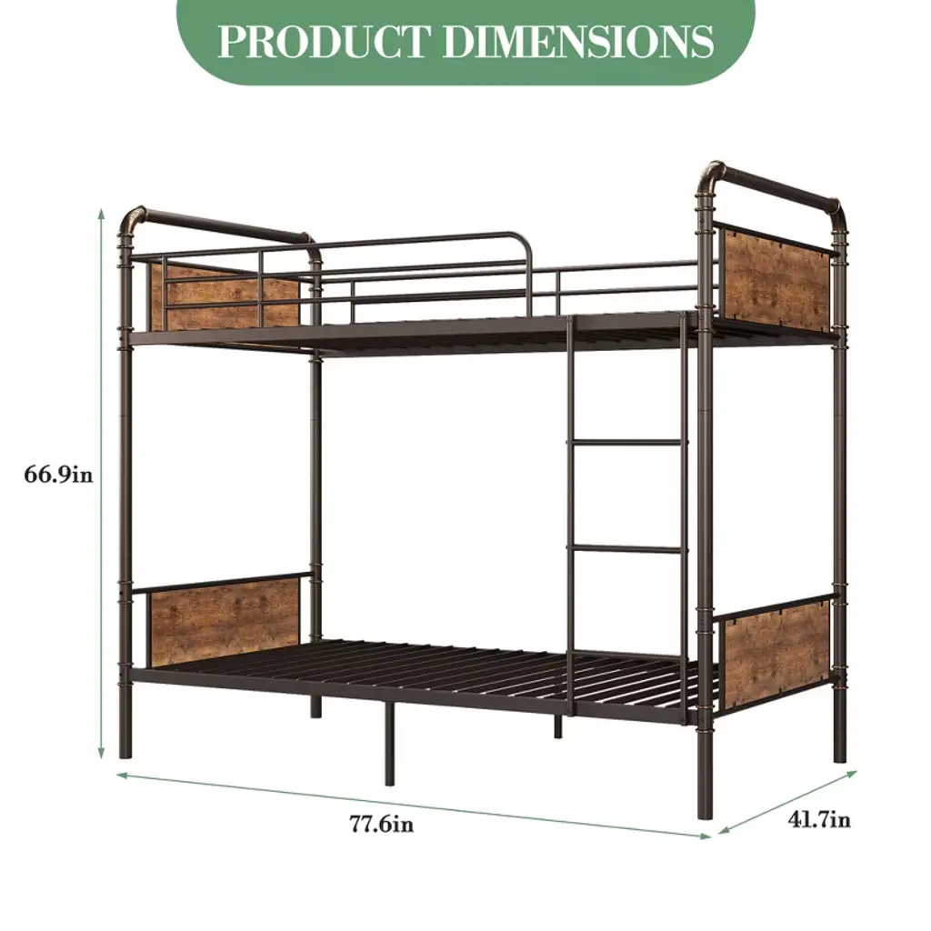The metal bed frame can support any latex, innerspring or memory foam mattress without the added expense of a box spring.Twin bunk bed suitable for children's room, school dormitory, worker dormitory.Specification:Product Dimensions 77.6"L x 41.7"W x 66.9"HUnder-Bed Height: 10 InchHandrail Height: 11.42 InchWeight Capacity: 220 lbsSpecial Feature: No Box Spring Needed, Convertible, Sturdy, Reversible LadderMaterial: Iron +MDFNote:Display items are not included.Before installation, please check if the relevant accessories are complete according to the manual. If there are any omissions, please contact us immediately.Feature:10 inch under-bed space to expend storage capacity.16.5 inch high guardrails and round guard corner to improve safety.Convertible twin bunk beds into 2 individual twin bed without bothering each other.Reversible Ladder to attached on the left or right of the bunk bed, space-saving design.Metal frame and metal slats offer a strong and sturdy mattress support, no shaking or noise.