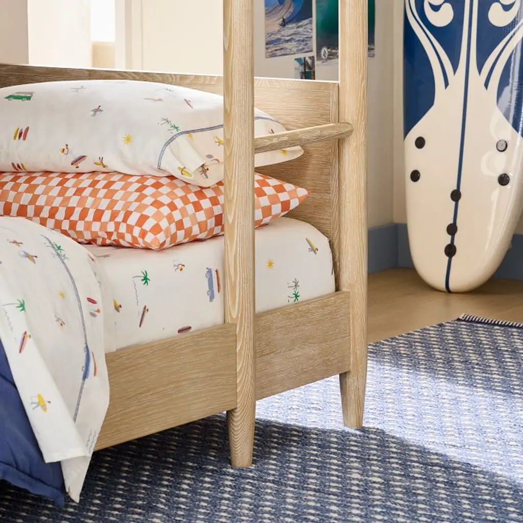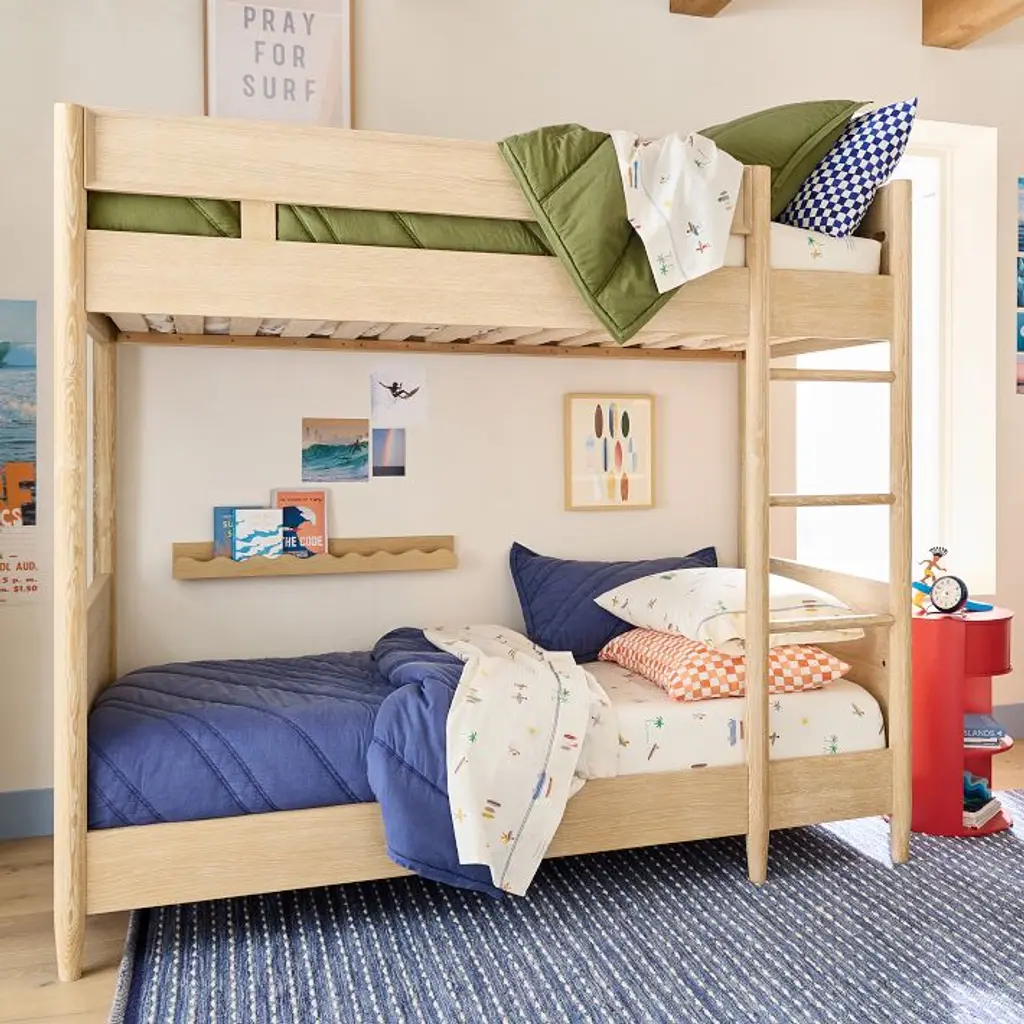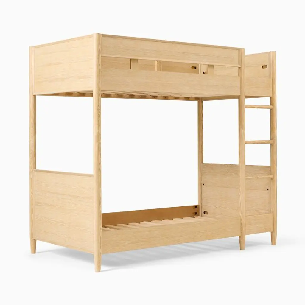 Brought to you in collaboration with Pottery Barn Teen, our GREENGUARD-certified Mid-Century Collection combines timeless style with durable craftsmanship. Each piece is made in a Fair Trade Certified™ facility from sustainably sourced wood that's kiln dried for extra strength, complete with water-based finishes. This double bunk bed maximizes your child's space, with room for a Twin bunk mattress up top and down below. Brought to you in collaboration with Pottery Barn Teen. Kiln-dried solid and engineered wood. Solid pine wood slats (included). Covered in child-safe, water-based finishes on all sides. Made with FSC®-certified wood from responsibly managed forests. Ladder is fixed (on the side pictured). A bunk mattress must be used on the upper bunk; do not use a box spring on either bunk. This bunk bed does not convert into two separate beds. Minimum recommended ceiling height: 8'. GREENGUARD Gold Certified. This low-emitting product has been screened for over 10,000 chemicals and VOCs. Rigorously tested to meet or exceed all required and voluntary safety standards. The Consumer Product Safety Commission recommends that top bunks not be used for children under 6 years of age. Made in a Fair Trade Certified™ facility in Vietnam.