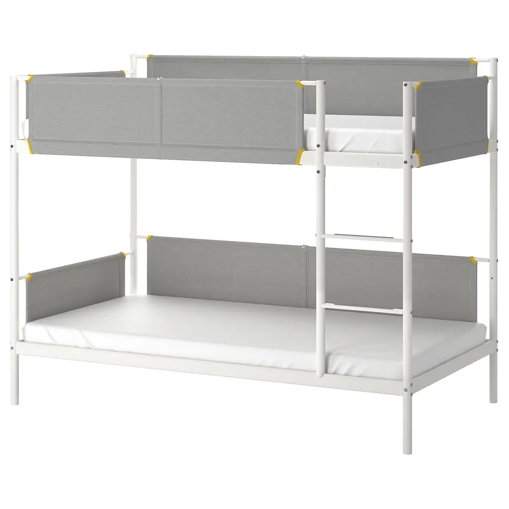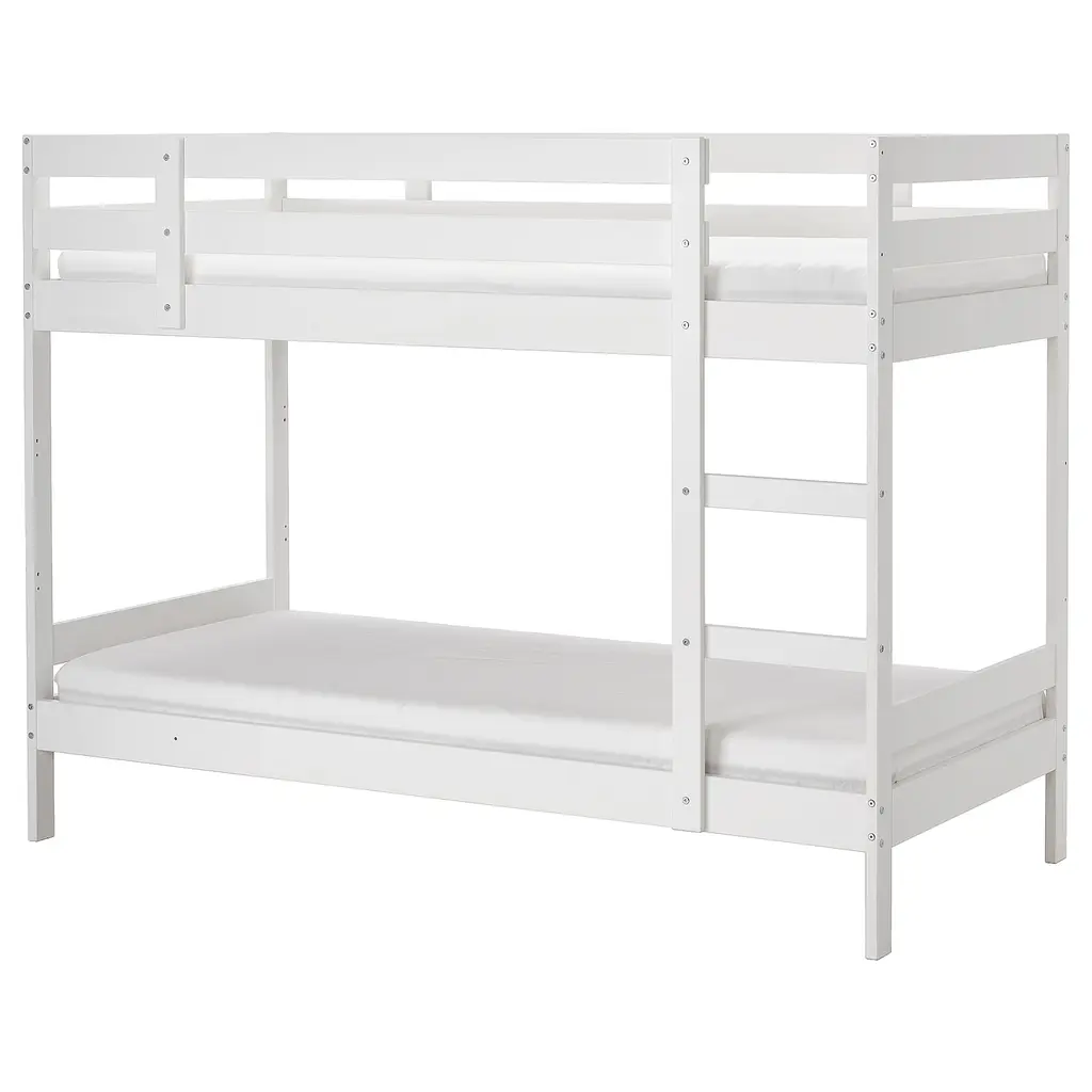 MYDAL Bunk bed frame - white Twin. Made of solid wood, which is a durable and warm natural material. A good solution where space is limited. High beds and the upper bed of bunk or loft beds are not suitable for children under 6 years of age due to the risk of injury from falls.