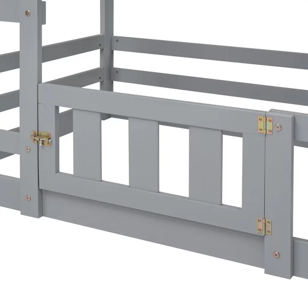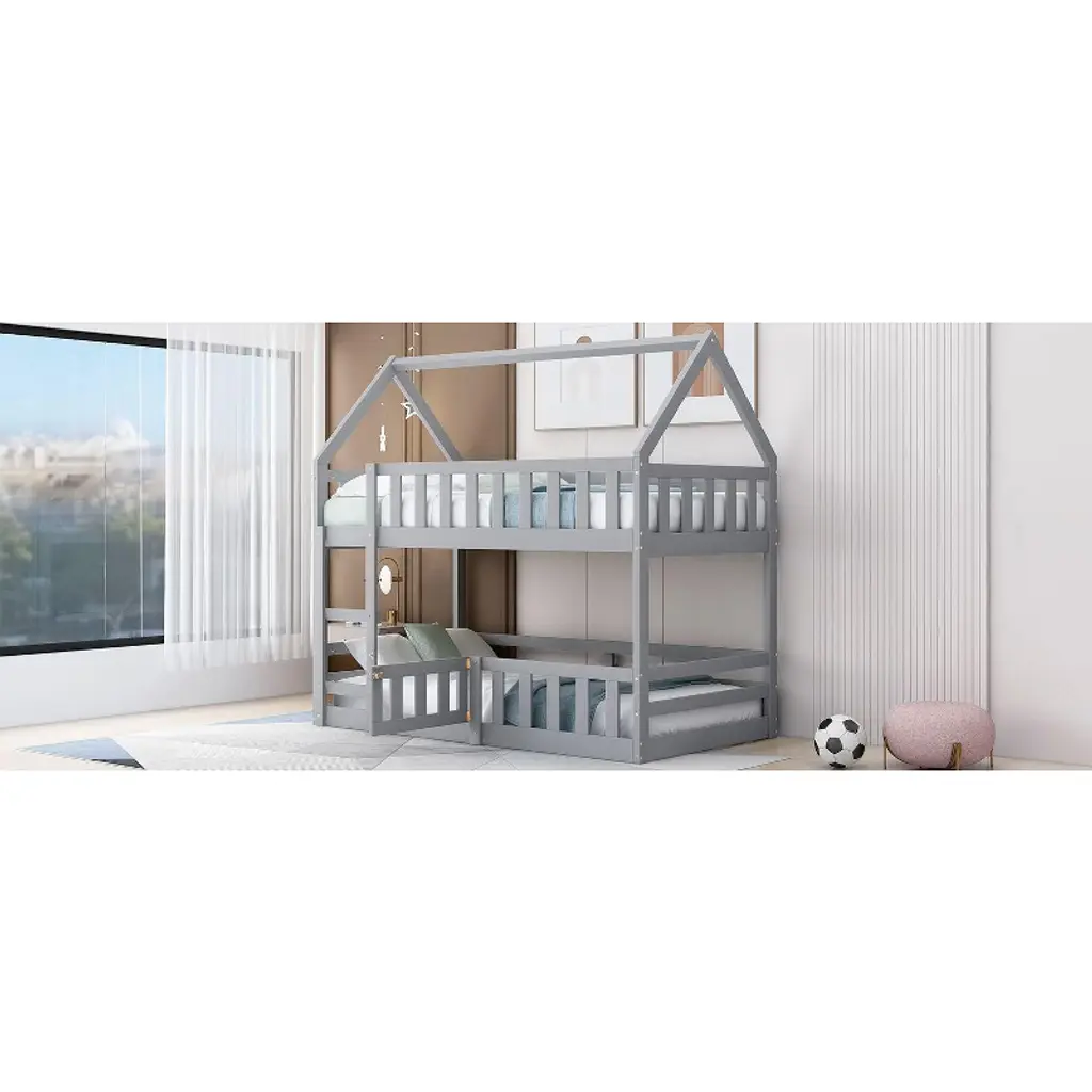 Okak Twin Over Twin House Bunk Bed With Safety Fence & Door & Stairs Floor Bunk Bed Solid Wood For Kids, Girls, Boys Easy Assemble, Gray