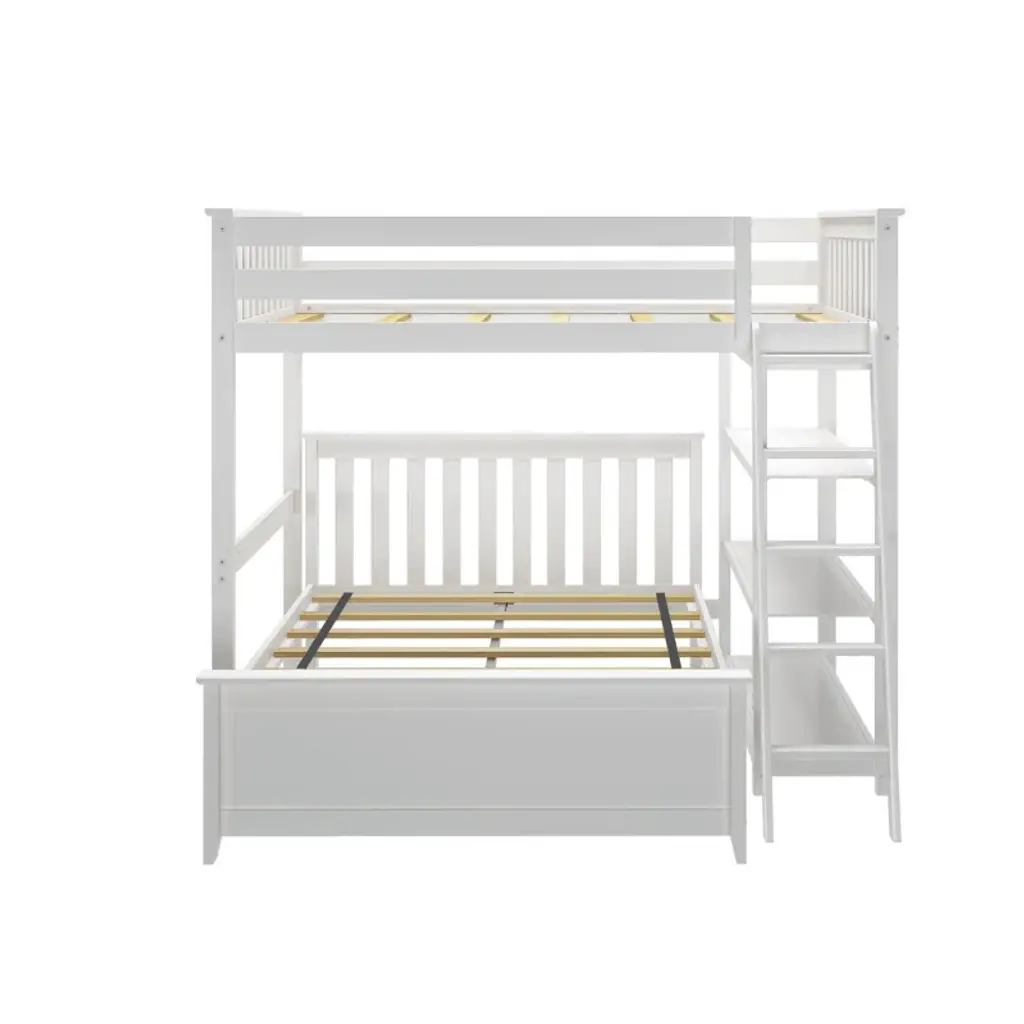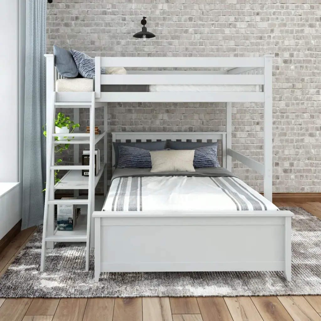 This L-shaped bunk bed includes a full-over-full design that helps you save floor space in your little one's bedroom. It's made from solid wood with a versatile crisp white finish, and it showcases inset paneling and slatted details for a classic look. This bed includes a built-in ladder to easily access the top bunk, while removable guardrails offer added safety. Plus, it comes with a built-in bookshelf for bedtime stories and accent pieces. No box spring is necessary, so simply add the appropriately-sized mattresses of your choice (sold separately).