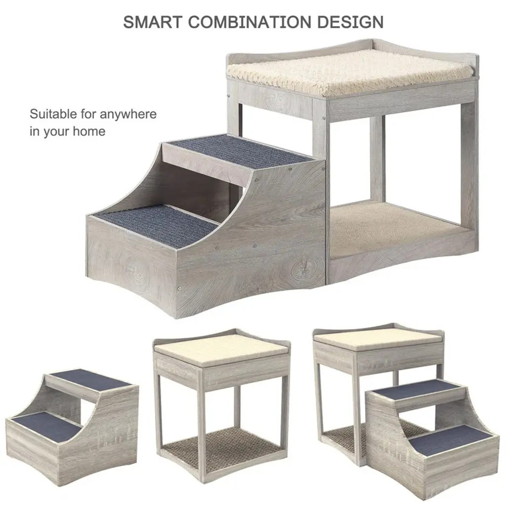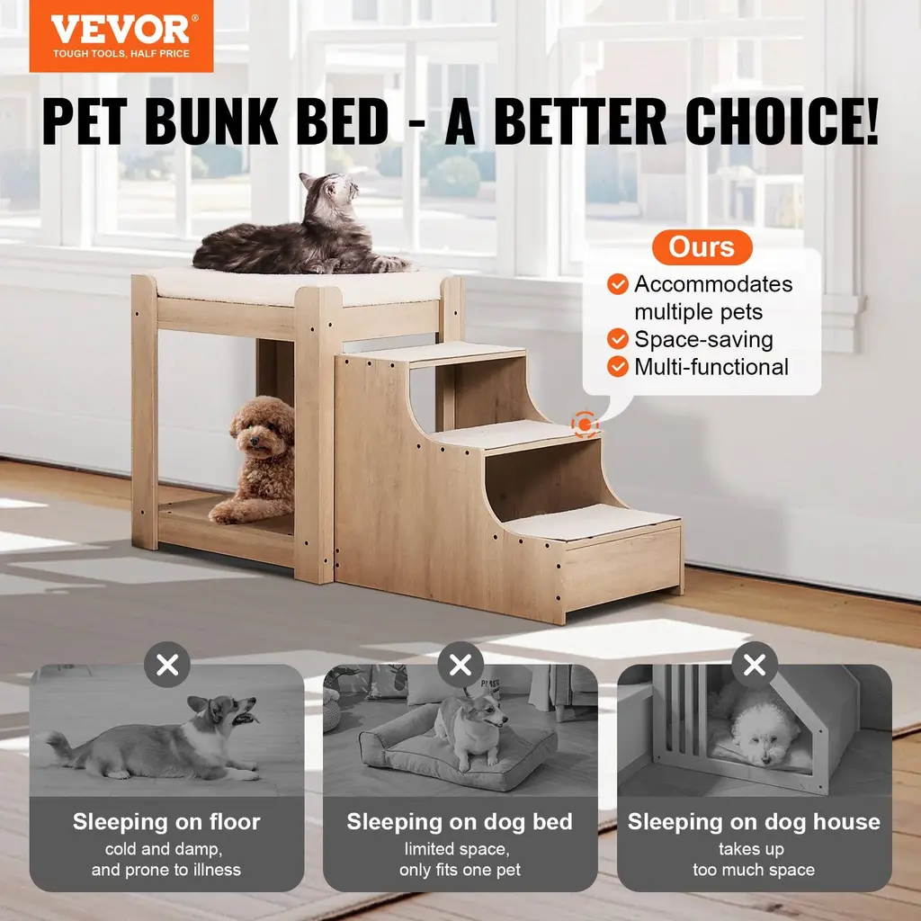 Pet Bunk Bed With Removable Stairs, Dog/cat Window Perch With Storage, Multi-Level Bed Window Perch Dog Bedside Sleeper Couch - No Drawer, Small Size - Wood, Beige