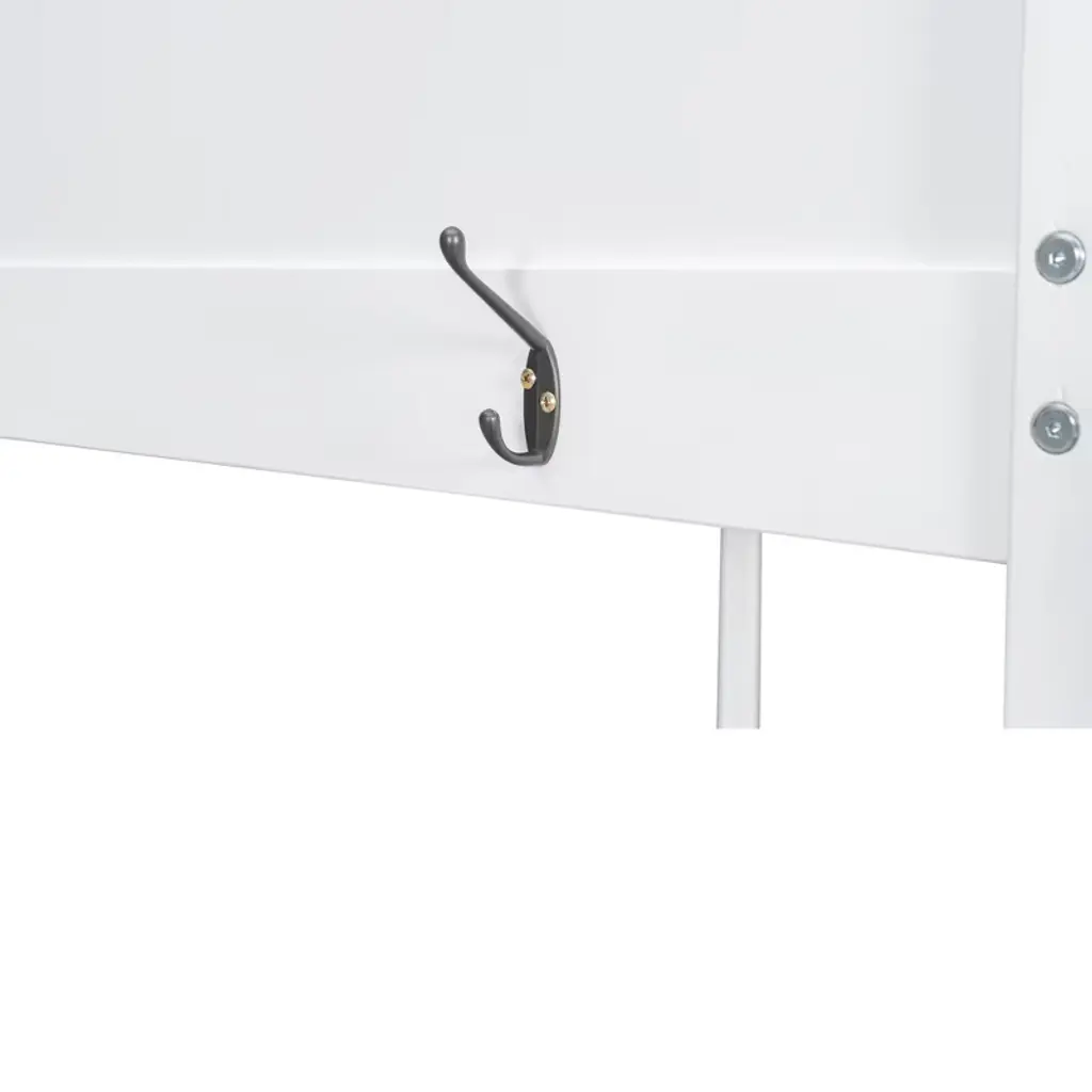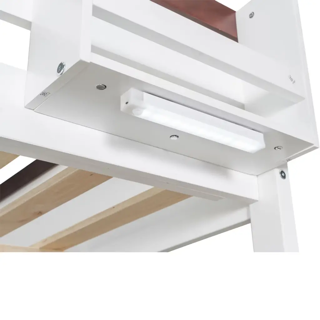 Product Features Queen Bunk Bed with Built-in Shelves & Storage: This space-saving bunk bed combines a workstation with multiple storage solutions — featuring 2 small shelves underneath the elevated bed, plus an additional storage box at the upper bed, creating the perfect study/play area while keeping essentials organized and within reach.Maximizes Small Spaces: The storage box at the end of the upper bed keeps necessities organized and within reach. The lower bed can be used as a rest area, and the two-layer bookshelf at the end of the bed can also be temporarily turned into a work desk to place some daily necessities.LED Light and USB Charging Station: The storage shelf of the lower bed includes a USB charging design, and the storage box of the upper bed features an LED light underneath it, bringing convenience to daily life.Clothes Hooks: In addition, there are 3 metal clothes hooks on the side of the bed, making it convenient to hang your daily wear.Easy to Assemble: Each order comes with a clear and detailed assembly instruction guide, and all necessary tools are provided. Strong packaging ensures safe delivery — all parts included. Warm notice: This bed frame comes in 2 boxes. Description Are you looking for a way to maximize your bedroom space without sacrificing style? Our queen size bunk bed is the perfect solution! Combining functionality with an elegant appearance, this loft bed is designed to elevate your room both in style and utility. Featuring two spacious shelves and a storage box, this bunk bed provides the ideal setup for students, professionals, or anyone in need of a multi-functional space. The shelf is large enough to accommodate your laptop, books, or even a small workspace for crafts or hobbies. Whether you're working from home, studying, or simply need a quiet place to relax, this desk will help you stay organized and productive. Description & Dimensions Material: Pine Wood + MDFSize: QueenNumbers of Package: 2Spring Box: No needAssembly Required: YesOverall Product Dimension: 82.7''L x 63.6''W x 63.2''HBed Dimension: 80'' x 60''Total Height: 63.2''Recommended Mattress Thickness of Upper/Lower Bed: 6'' / 8–10''Overall Product Weight: 171lbsEach Bed Weight Capacity: 650lbsStorage Box Weight Capacity: 26lbs