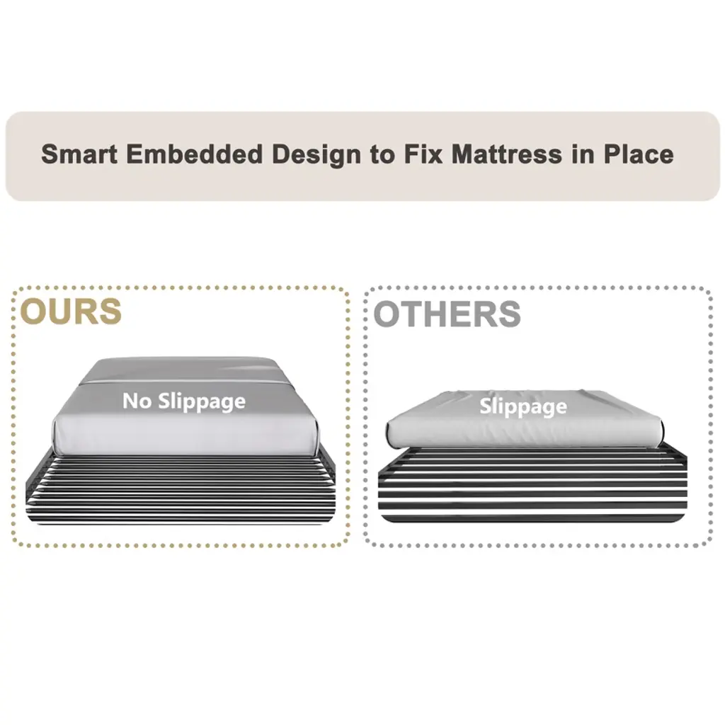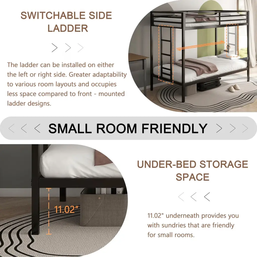 Classic Twin Over Twin Design: Matte square metal frame blends durability with timeless style, ideal for kids, teens, and adults in bedrooms, dorms, rentals, or institutions. A perfect space saving design for small room. Space-Saving: Our Twin Twin bunk bed is a great choice for families with many children! 10.6 inches underneath provide you with seasonal clothes or toys, friendly for small rooms. Heavy-Duty Square Tube Frame: Built to last with robust construction; supports up to 350 lbs on the top bunk and 400 lbs on the bottom bunk. Safety First Features: Reinforced full-length guardrails on the upper bunk and a secure ladder with wide, comfortable steps for safe climbing. Noise Free for Immersive Sleep: Metal slats fixed firmly with plastic buckle,minimize noise from moving& turning over, provides an immersive sleep experience for workers or juniors. Reversible Ladder Placement: Ladder can be installed on either side of the frame to best suit your room layout and personal preferences. No Box Spring Required: 20-22 strong metal slats on both bunks provide excellent mattress support and prevent sagging. Quick and Easy Assembly: Designed for fast, hassle-free setup by two people in just about one hour. Mattress Compatibility: Fits standard twin mattresses (74"¨C75" L x 37.5"¨C38.5" W); recommended thickness between 4"¨C6" for safety and comfort.