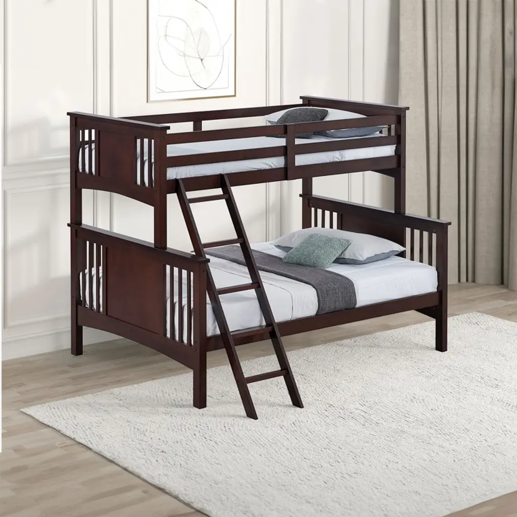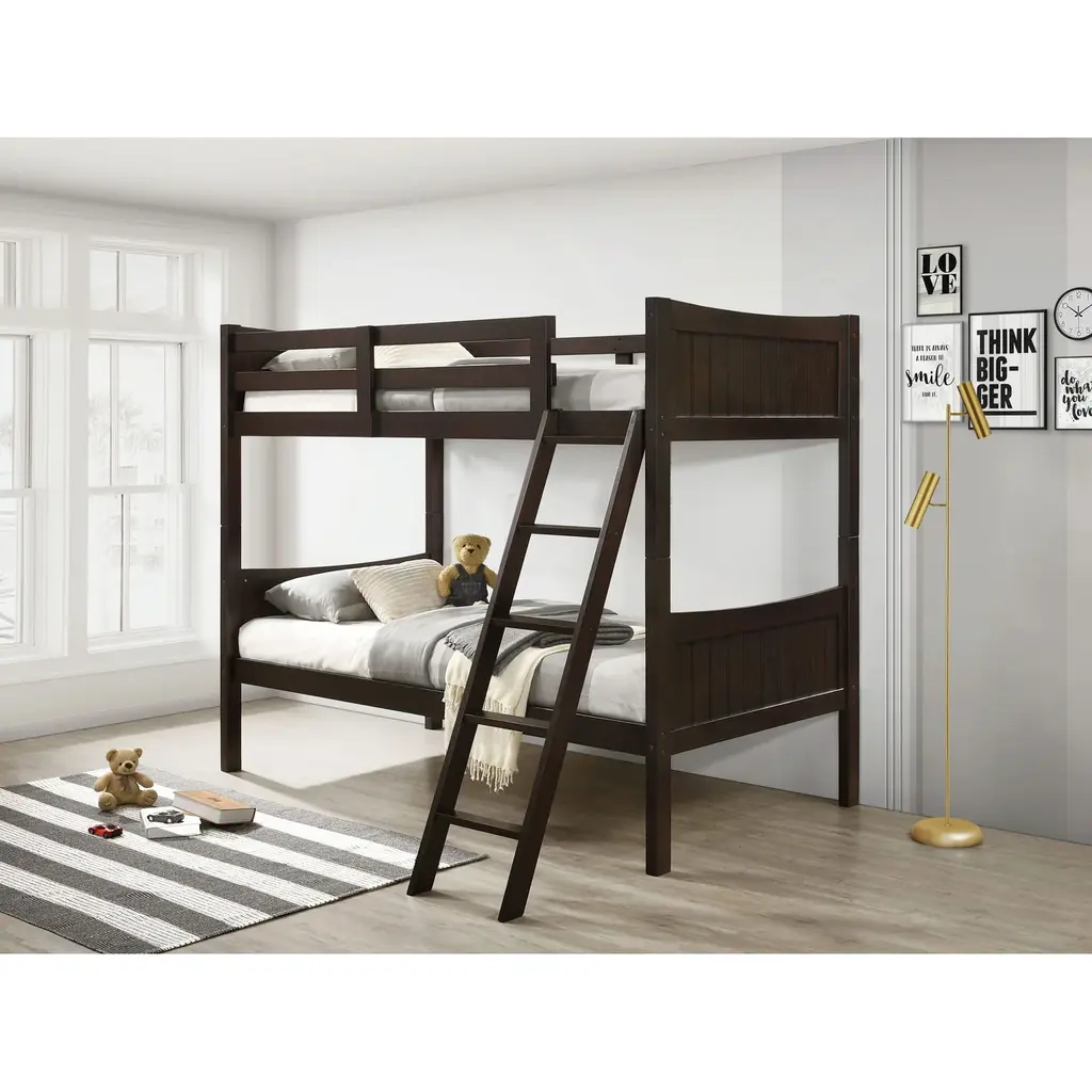 Elevate your space with the Sami Bunk Bed. Crafted from solid wood in your choice of Espresso or Gray finish, this Twin-over-Twin bunk includes a sturdy stepladder and is finished on all sides for a polished look from every angle. No box spring is required, and the versatile design allows it to be configured as two separate twin beds. A stylish and space-saving solution for shared rooms or sleepovers.