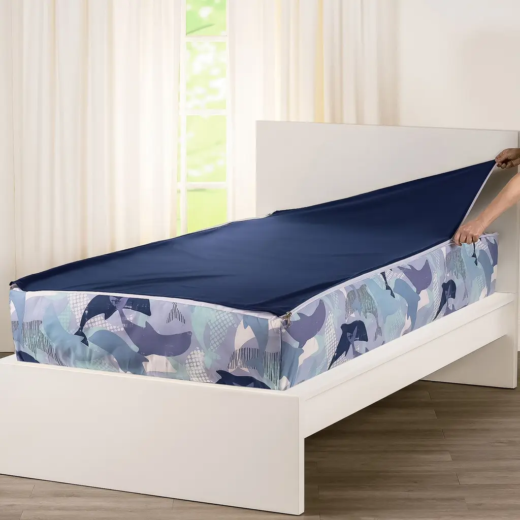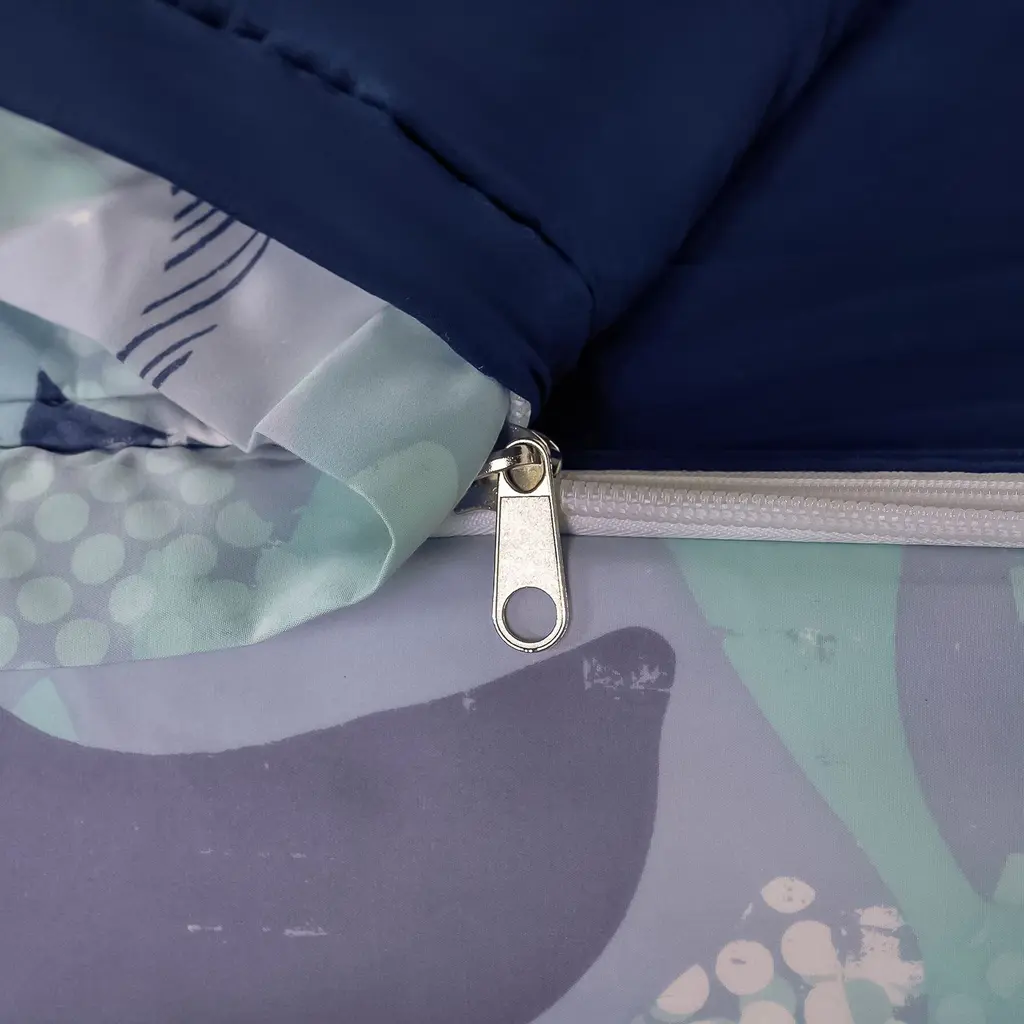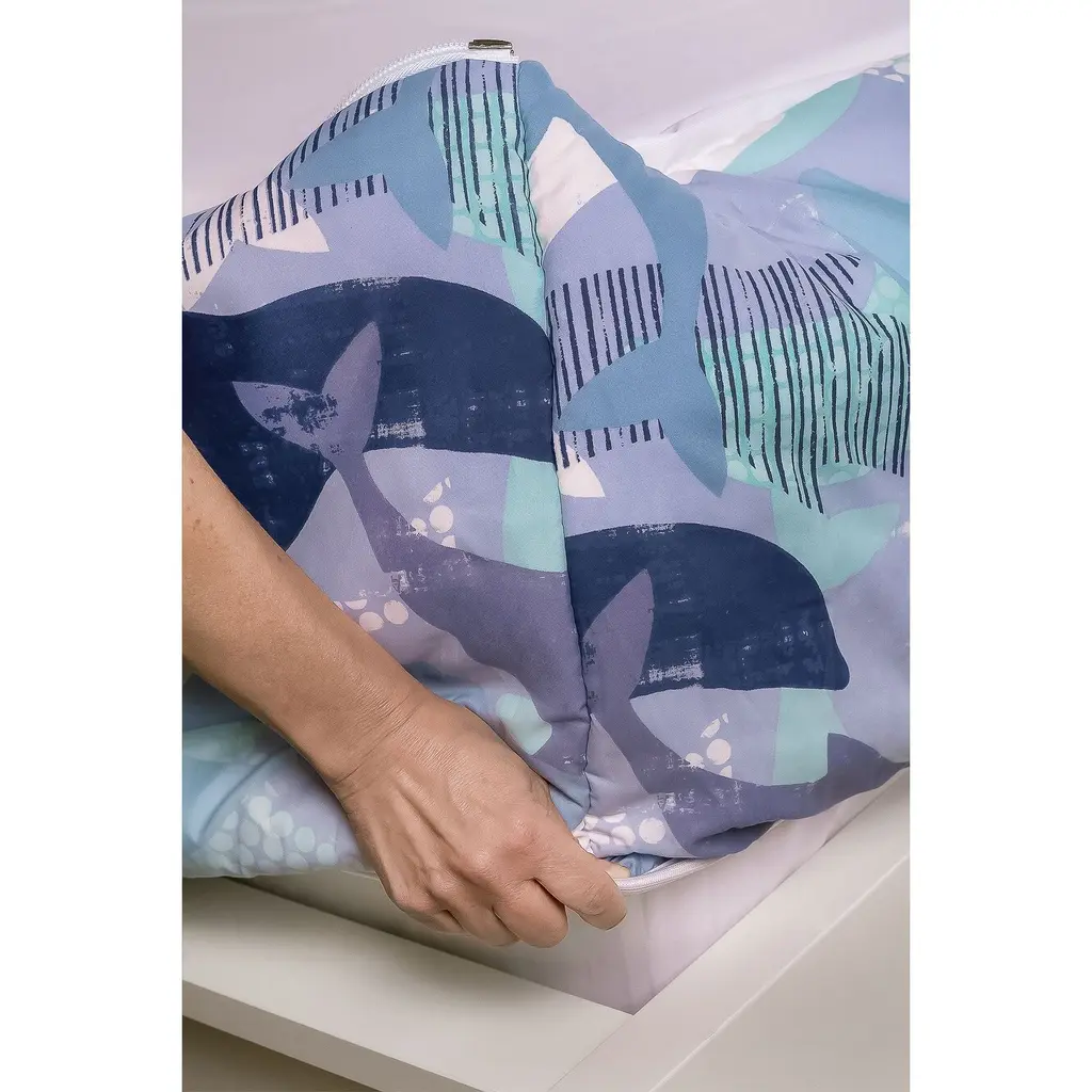 Bring the underwater world to your child's bedroom with the Diving Dolphins Bunkie Deluxe from Siscovers. This all-in-one zipper bedding set includes a snuggly comforter, a heavy-duty elastic fitted sheet, and a built-in mattress protector to keep your child cozy and comfortable all year round. The detachable comforter and sheet make laundry day a breeze, while the envelope-style pillowcases complete the look and keep pillows safely tucked away. Available in Twin and Full sizes, this versatile bedding set is easy to use and looks great on any type of bed.Features:
