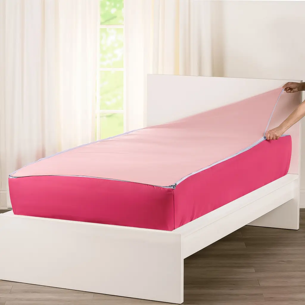 Transform your child's bed into a cozy oasis with the Hot Pink Bunkie Deluxe from Siscovers. This innovative bedding set is an all-in-one solution that includes a removable, medium-weight comforter perfect for any season, a fitted sheet with a heavy-duty elastic bottom that fits securely over the mattress, and a built-in mattress protector to guard against spills and accidents. The easy-to-use zipper that runs along the perimeter of the bed makes it effortless to keep the bed neat and tidy. Additionally, the set comes complete with matching pillowcases that keep your pillows tucked away safely inside. Available in Twin and Full sizes, this versatile set looks great on bunk beds, platform beds, and panel beds alike.Features:Dimensions:
