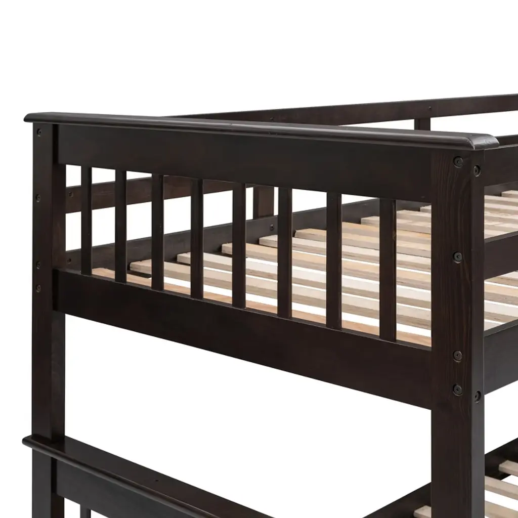 If you need extra sleeping space or your family love sleepovers, this Stairway Twin-Over-Full Bunk Bed with Drawer is perfect for your home. Four open shelves located beneath the attached staircase provide ample storage for your family' toys and bedding. High-quality, solid pine legs and a strong, durable frame ensures stability and durability for long-term use, and can be separated into one twin,one full-size bed. Slat kit included so box springs are not required. This bunk bed is designed with a clean silhouette and a hue of elegance. It suits all styles of home decoration, and completes the look of any bedroom. Weight & Dimensions Overall Product Dimension 91.73"L x 54.33"W x 61.4"H Detail Product Dimension Please refer to the Size image Number of Package 3 Package Dimension Please refer to the Specification Overall Product Weight 199LBS Package Weight Please refer to the Specification Weight Capacity Upper bed: 200LBS Bottom bed: 250LBS Recommended Mattress Thickness Upper bed: 6" Bottom bed: 8" Recommended Age > 6 Years Old Specification Product Type Bunk Bed Size Twin-Over-Full Color White/Gray/Espresso Material Plywood+MDF+Pinewood Box Spring Required No Number of Slats Upper bed: 14 Bottom bed:14 Assembly Required Yes Country of Origin Vietnam