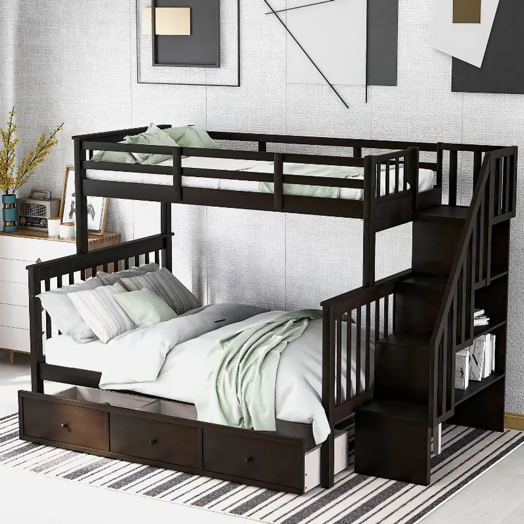 If you need extra sleeping space or your family love sleepovers, this Stairway Twin-Over-Full Bunk Bed with Drawer is perfect for your home. Four open shelves located beneath the attached staircase provide ample storage for your family' toys and bedding. High-quality, solid pine legs and a strong, durable frame ensures stability and durability for long-term use, and can be separated into one twin,one full-size bed. Slat kit included so box springs are not required. This bunk bed is designed with a clean silhouette and a hue of elegance. It suits all styles of home decoration, and completes the look of any bedroom. Weight & Dimensions Overall Product Dimension 91.73"L x 54.33"W x 61.4"H Detail Product Dimension Please refer to the Size image Number of Package 3 Package Dimension Please refer to the Specification Overall Product Weight 199LBS Package Weight Please refer to the Specification Weight Capacity Upper bed: 200LBS Bottom bed: 250LBS Recommended Mattress Thickness Upper bed: 6" Bottom bed: 8" Recommended Age > 6 Years Old Specification Product Type Bunk Bed Size Twin-Over-Full Color White/Gray/Espresso Material Plywood+MDF+Pinewood Box Spring Required No Number of Slats Upper bed: 14 Bottom bed:14 Assembly Required Yes Country of Origin Vietnam