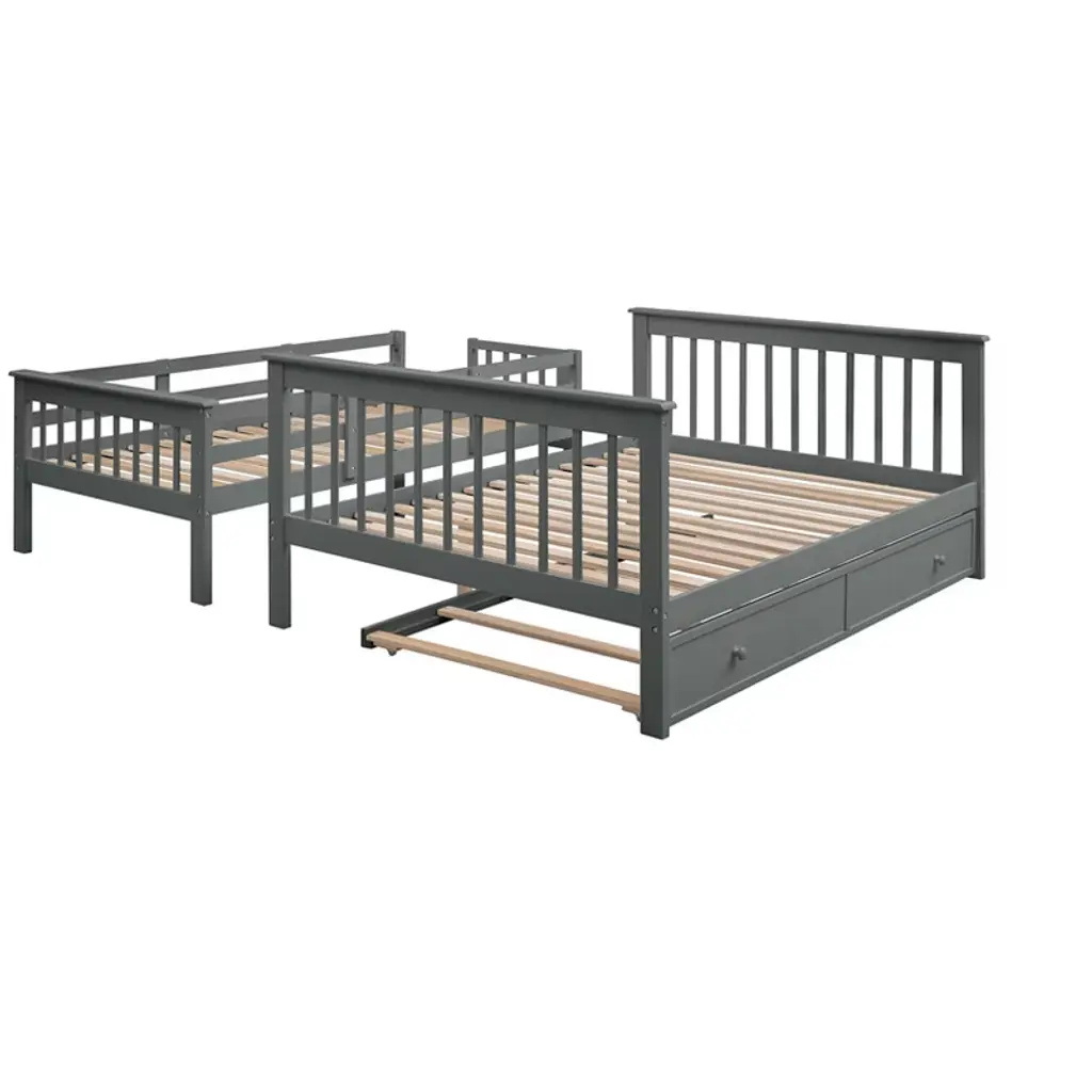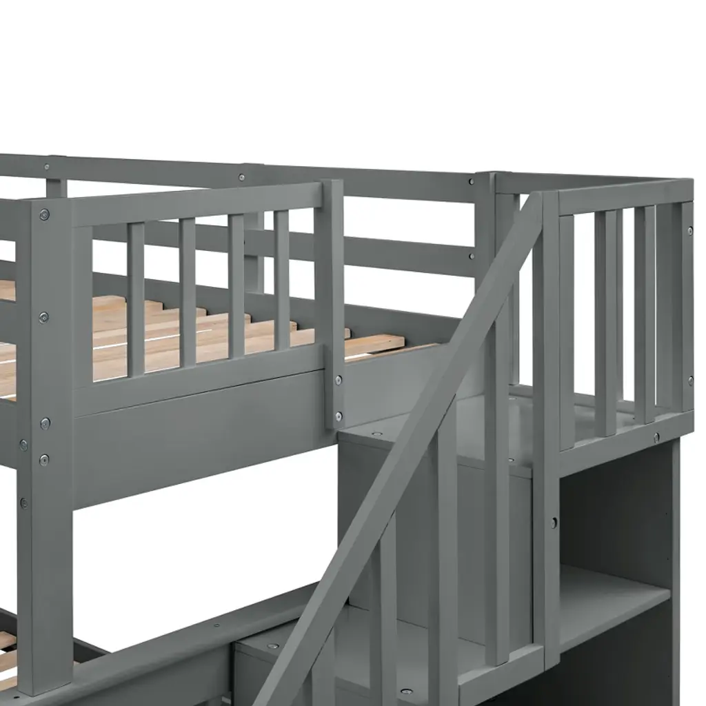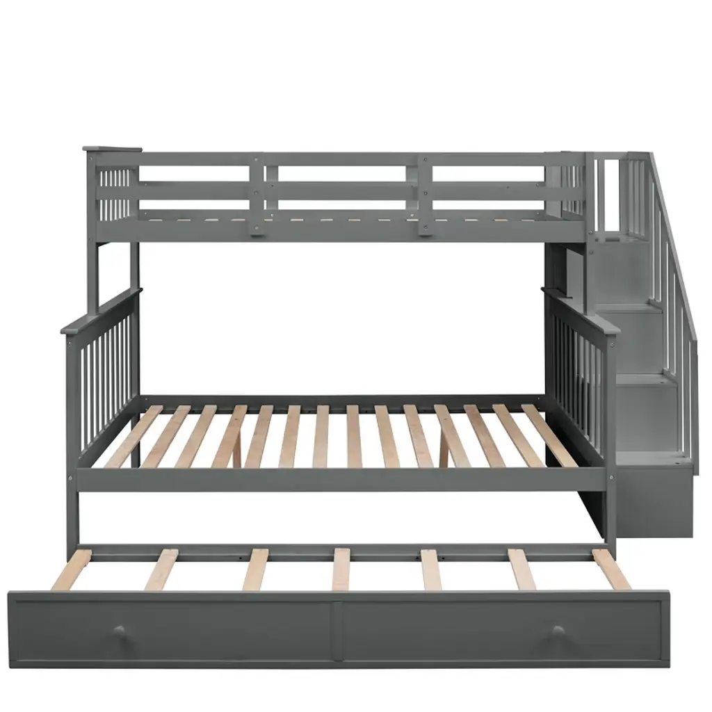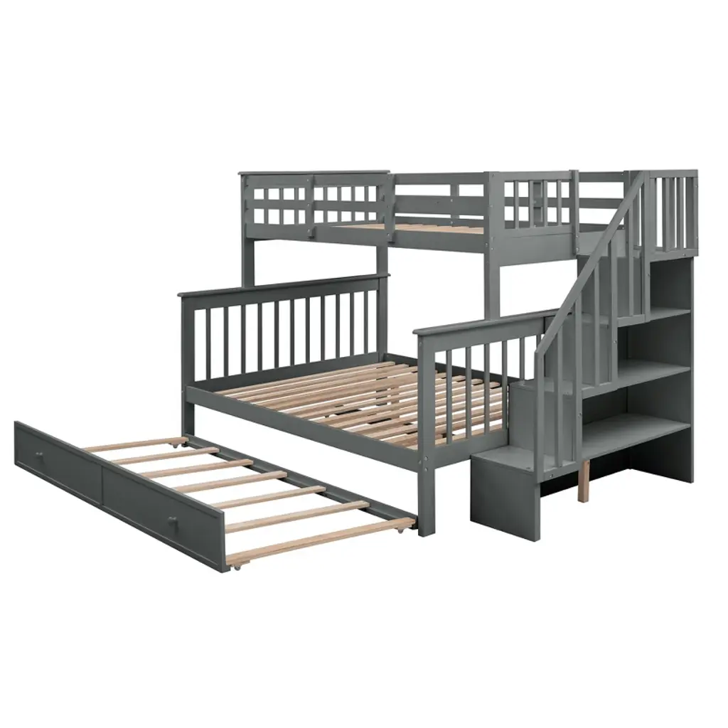Stairway Twin Over Full Bunk Bed With Trundle For Kids, Bunk Bed Frame With Storage Stairs And Guard Rail, Gray