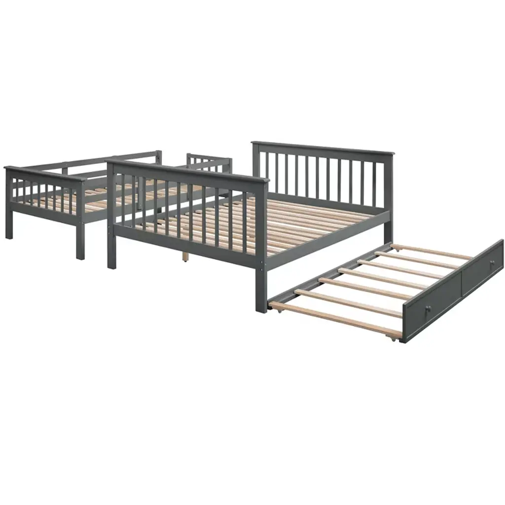 If you need extra sleeping space or your family love sleepovers, this Stairway Twin-Over-Full Bunk Bed with Twin size Trundle is perfect for your home. Three open shelves located beneath the attached staircase provide ample storage for your family's toys and bedding. High-quality, solid pine legs and a strong, durable frame ensures stability and durability for long-term use. Slat kit included so box springs are not required. This bunk bed is designed with a clean silhouette and a hue of elegance. It suits all styles of home decoration, and completes the look of any bedroom.Product Detail:- Product Type:Bunk Bed- Size:Twin over Full- Overall Product Dimension:93.7"L x 58.1"W x 62.2"H- Overall Product Weight:226.72 LBS- Detail Dimension: Please refer to the Size picture- Weight Capacity: Upper bed: 400 LBS / Bottom bed: 600 LBS / Trundle bed: 250 LBS- Material: Plywood+Pinewood+MDF- Recommended Mattress Thickness: 6" (The mattress is not included)- Number of Packages: 3 (Packages shipped separately may not arrive at the same time, please be patient.)- Assembly Required:YesWhat's in the box:- Bed * 1- Tools included- Instruction manual