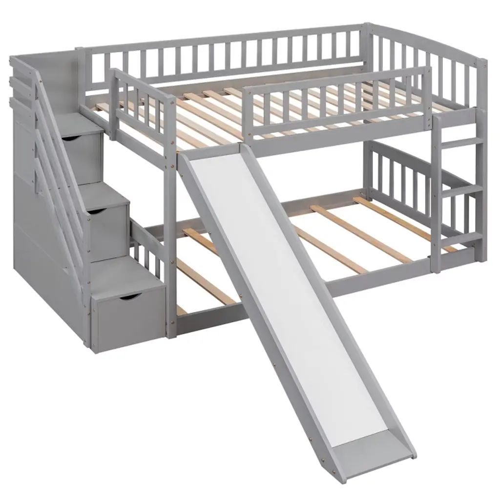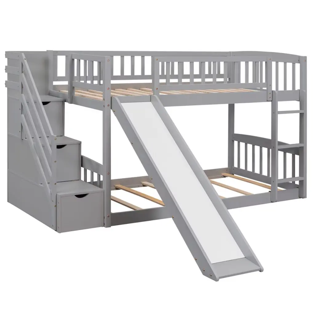 If you need extra sleeping space or you love sleepovers, this Stairway Twin-Over-Twin Bunk Bed with Drawers and Slide is perfect for your home. The build-in ladder and staircase provide easy access to the top bed, and the two drawers located beneath the attached staircase provide ample storage for your toys and bedding. For added extra fun, slide is included and can be put either left or right. The 11.9" tall guardrails to keep your safe on the top bunk. High-quality, solid pine legs and a strong, durable frame ensures stability and durability for long-term use. Slat kit included so box springs are not required. This bunk bed is designed with a clean silhouette and a hue of elegance. It suits all styles of home decoration, and completes the look of any bedroom. Weight & Dimensions Overall Product Dimension 94.4"L x 89.7"W x 50.1"H Detail Product Dimension Please refer to the Size image Number of Package 2 Package Dimension Please refer to the Specification Overall Product Weight 184.2 LBS Package Weight Please refer to the Specification Weight Capacity Upper bed: 300LBS Bottom bed: 300LBS Recommended Mattress Thickness Upper bed: 6" Bottom bed: 8" Recommended Age > 6 years old Specifications Product Type Bunk Bed Size Twin-Over-Twin Color White/Gray Product material Plywood+MDF+Pinewood Number of slats Upper bed:14 Lower bed:7 Level of Assembly Partial assembly Stairs/drawers be installed on both sides Yes Box Spring Required No Mattress Included No Suggested Number of People 2 Additional Tools Required All Tools Included/Screwdriver Avoid power tools Yes Country of Origin Vietnam Notes: Manual measurement has been used,there may be some reasonable error.All the pictures are taken by actual samples, slight chromatic aberration may occur due to lighting or display.