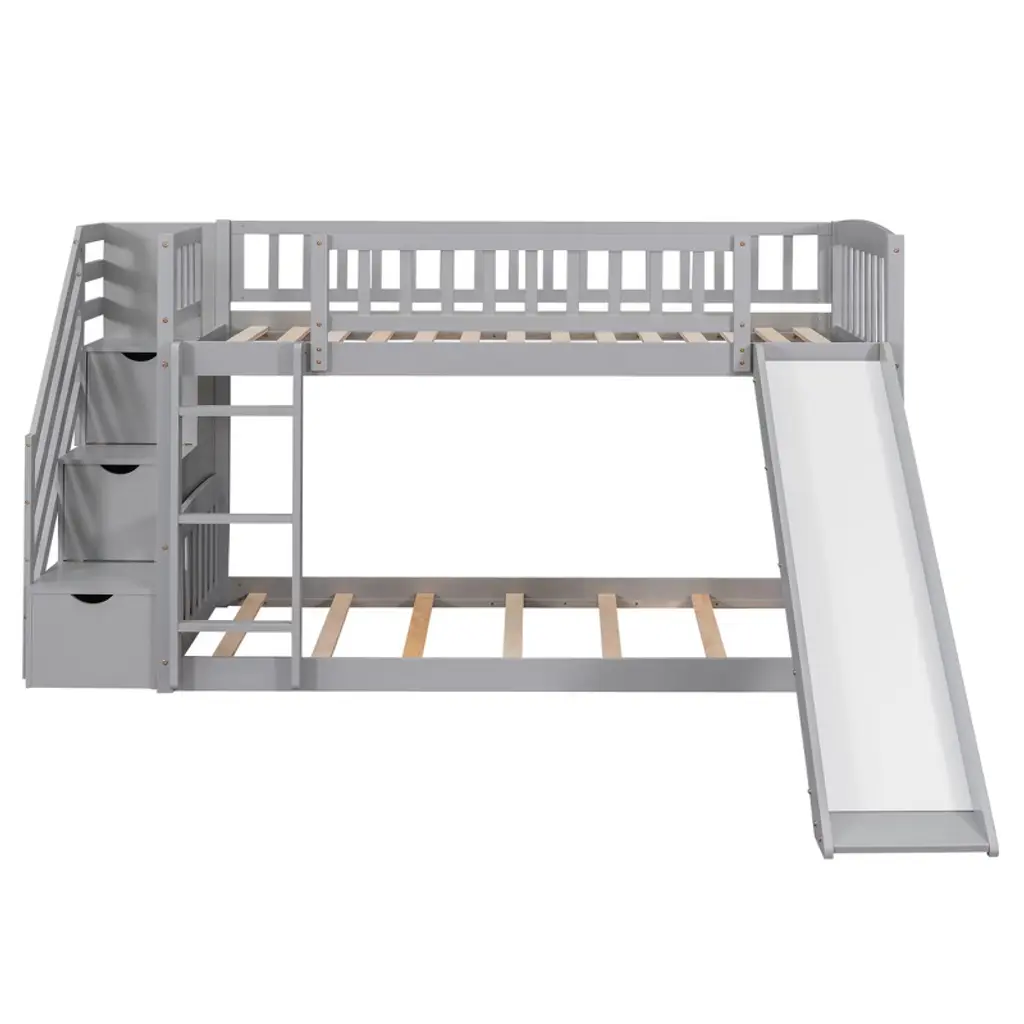 Stairway Twin Over Twin Bunk Bed With Two Drawers And Slide, Gray
