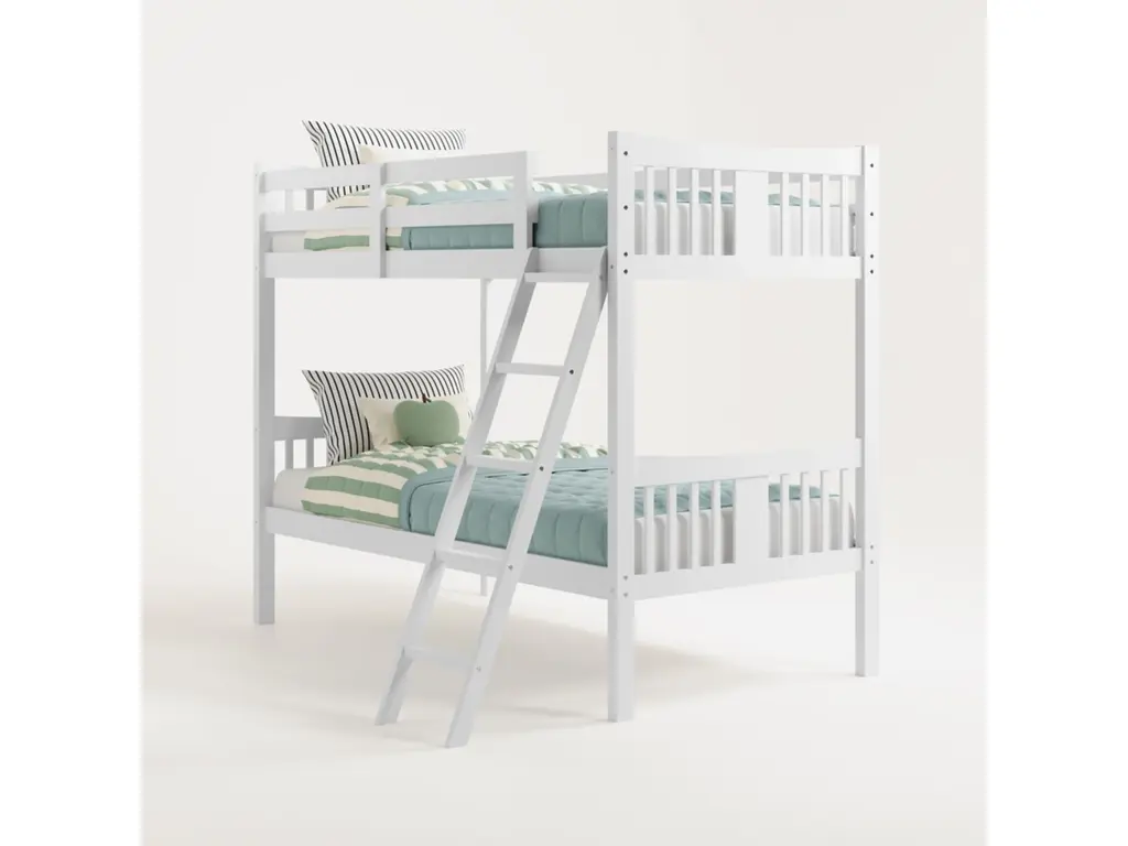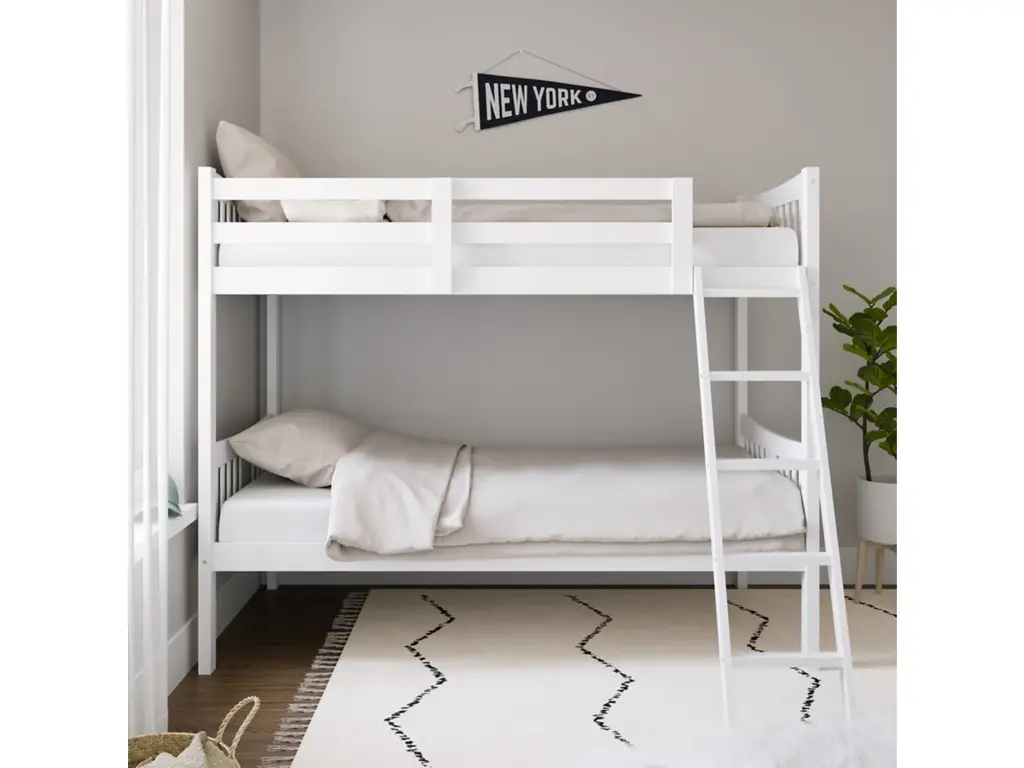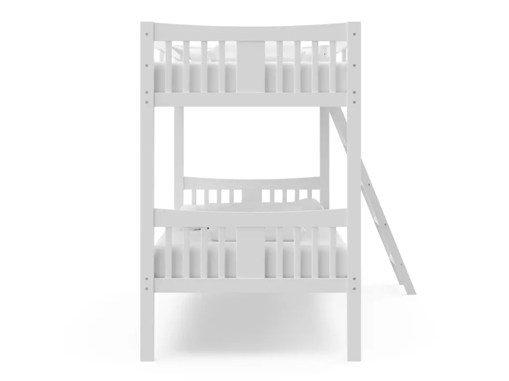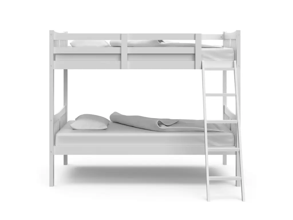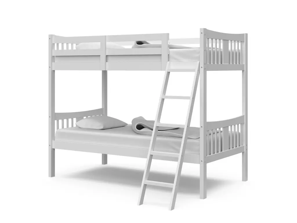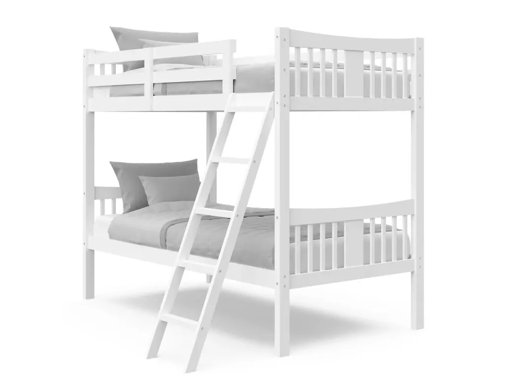The Storkcraft Caribou Solid Hardwood Twin Bunk Bed is an award-winning, iconic family-favourite. Its strong & sturdy construction, full-length safety guardrails, durable 5-step ladder, and unique fastening systems make the Storkcraft Caribou the perfect addition to any kids room. For added versatility, the Caribou can be configured into 2 separate twin-size beds. The Caribou is GREENGUARD Gold Certified — Certified products are screened for more than 10,000 chemicals and VOCs known to pollute indoor air. Storkcraft is the proud recipient of the Parent Tested Parent Approved (PTPA) Seal of Approval for nursery and children’s bedroom furniture, and the 2018-2023 Women's Choice Award for 9 out of 10 Recommended Baby & Kids Furniture. Backed by a 1-year limited manufacturer’s warranty. Assembly required. Mattress sold separately. Maximum weight of top bunk: 225 pounds. Warning: Bunk bed mattress should not exceed 7 inches in thickness.
