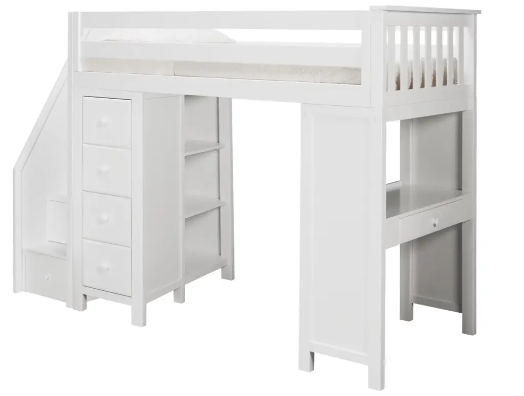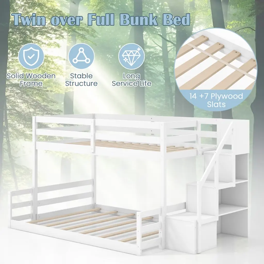 Give your children the gift of a cozy and comfortable sanctuary with our stylish bunk bed! This twin over full bunk bed showcases a low-profile design that makes it suitable for rooms with low ceilings or younger children. The stairway design is not only safer for kids to climb but also provides classified storage space for a variety of items. Moreover, the full-length guardrails are securely mounted on the upper bunk, ensuring a safe sleeping environment. Built from solid wood frame and rugged plywood slats, this floor bunk bed offers durability and high strength. All in all, the bunk bed with storage stairs is ideal for those looking to combine elegance with practicality in a bedroom furnishing.FeaturesThe bunk bed consists of a twin size bed and a full size bed Child-friendly low-profile bed frame for easily get in and out of Twin over full bunk bed combines stable structure with long service lifeSpecifications:Color: White Material: Pine Wood, Plywood, Engineered Wood Product Dimensions: 94.5" x 56.5" x 50.5"(W x D x H) Dimensions of Upper Bed: 94.5" x 42" (L x W) Dimensions of Large Compartment: 23.5" x 13.5" x 12.5" (L x W x H) Dimensions of Medium Compartment: 23.5" x 13.5" x 11.5"(L x W x H) Dimensions of Small Compartment: 11.5" x 13.5" x 11" (L x W x H) Dimensions of Stairs: 14" x 14.5" (L x W) Height of Stairs: 13", 12" Height of Guardrails: 12.5" Height Between Beds: 31" Net Weight: 155 lbs Recommended Mattress Thickness: 6" (not included) Weight Capacity of Upper Bed: 200 lbs Weight Capacity of Lower Bed: 250 lbs Weight Capacity of Stairs: 200 lbs Package Includes: 1 x Bunk Bed 1 x Instruction