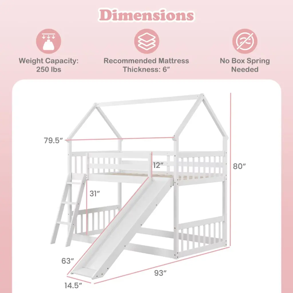 Transform your child's bedroom into a delightful playground! This twin over twin bunk bed features a fun slide, encouraging active play and making bedtime an adventure. The charming house-style frame adds a whimsical touch to any room decoration. Built from solid wood and equipped with 14 rugged plywood slats, this bunk bed is built to last. Besides, the reversible slide and ladder design adds an element of excitement to bedtime while also providing easy access to the top bunk.Prioritize your child's safety with full-length guardrails. This low floor bunk bed frame offers an ample high under-bed space, perfect for storage, sleeping or creating a cozy play area.FeaturesDIY your own house bed with light strips, ribbons and curtains Fun & smooth slide is designed to add an element of excitement to kids 3-step integrated ladder can be positioned on either side of the bedSpecifications:Color: White Material: Pine Wood, Plywood, Engineered Wood Overall Dimensions: 79.5" x 93" x 80" (W x D x H) Dimensions of Slide: 63" x 14.5" (L x W) Height of Guardrails: 12" Height of Under-bed Space: 31" Recommended Mattress Thickness: 6" Weight Capacity: 250 lbs Net Weight: 113 lbs Package Includes: 1 x House Bed 1 x Instruction