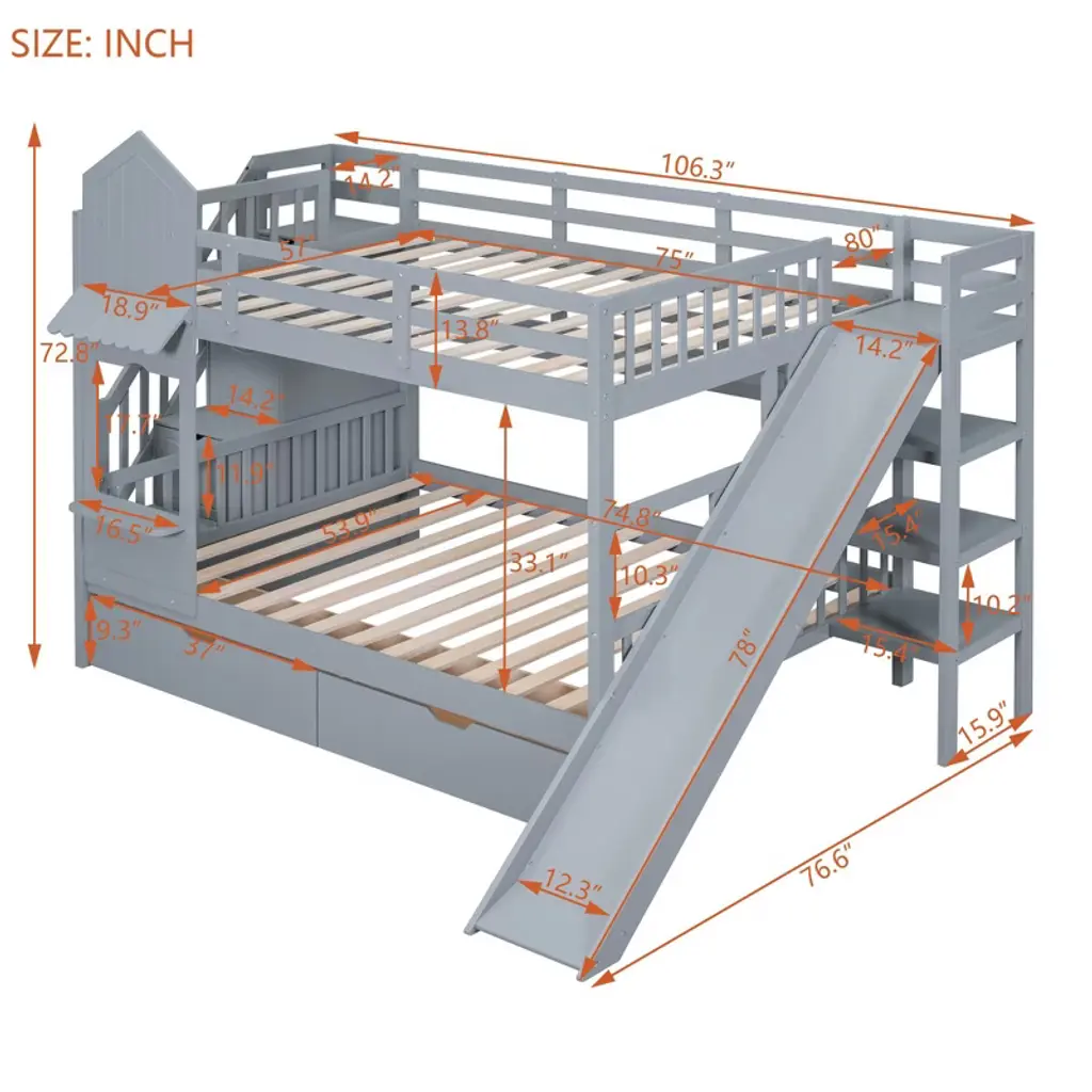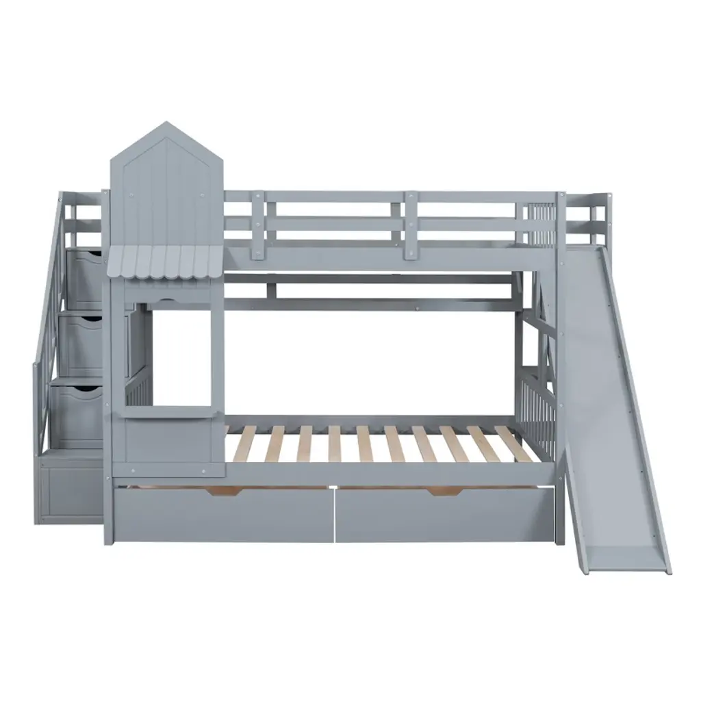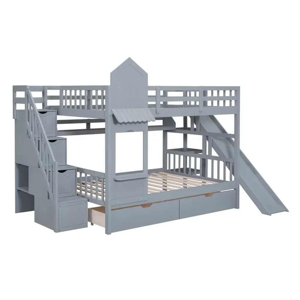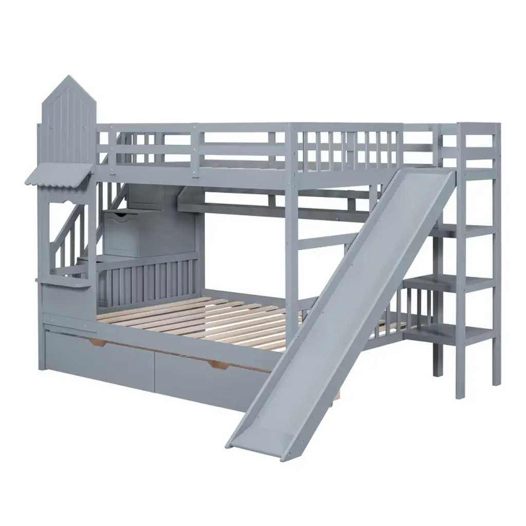 The Misty Moon Full-over-full Castle Style Bunk Bed With 2 Drawers 3 Shelves And Slide - Gray