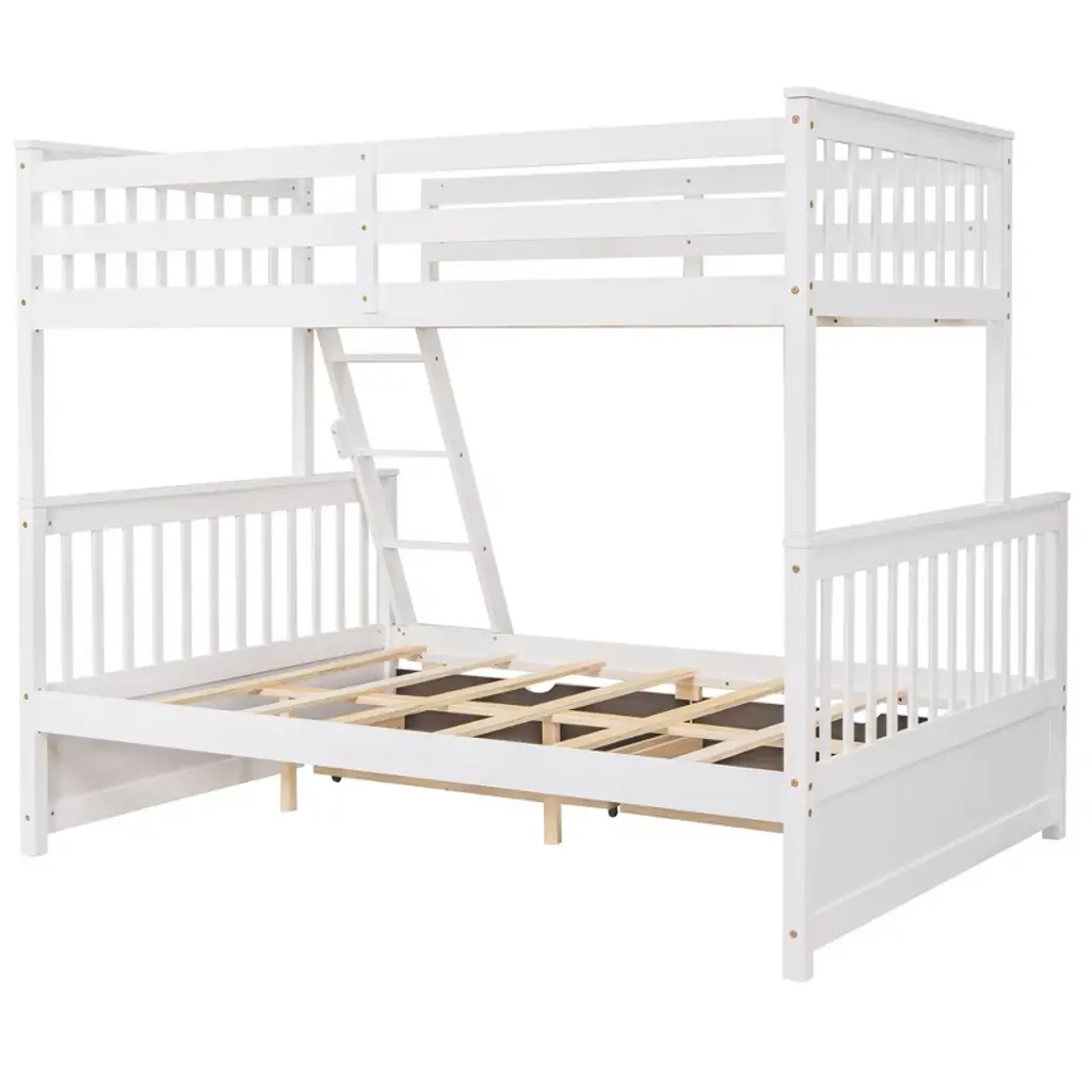 If you need extra sleeping space or your family love sleepovers, this Twin-Over-Full Bunk Bed with Storage is perfect for your home. A pair of drawers under the bottom bed provide ample storage for your family' toys and bedding. High-quality, solid pine legs and a strong, durable frame ensures stability and durability for long-term use, and can be separated into one twin and one full-size bed. Slat kit included so box springs are not required. This bunk bed is designed with a clean silhouette and a hue of elegance. It suits all styles of home decoration, and completes the look of any bedroom. Weight & Dimensions Overall Product Dimension 79.53"L x 57"W x 67"H Detail Product Dimension Please refer to the Size image Number of Package 2 Package Dimension Please refer to the Specification Overall Product Weight 137.5LBS Package Weight Please refer to the Specification Weight Capacity Upper bed: 300LBS Bottom bed: 350LBS Recommended Mattress Thickness Upper bed: 6" Bottom bed: 8" Recommended Age > 6 years old Specifications Product Type Bunk Bed Size Twin-Over-Full Color Gray/White/Espresso/Walnut Material Plywood+MDF+Pinewood Box Spring Required No Number of Slats Upper bed: 7 Bottom bed: 7 Assembly Required Yes Country of Origin Vietnam Notes Manual measurement has been used,there may be some reasonable error. All the pictures are taken by actual samples, slight chromatic aberration may occur due to lighting or display.