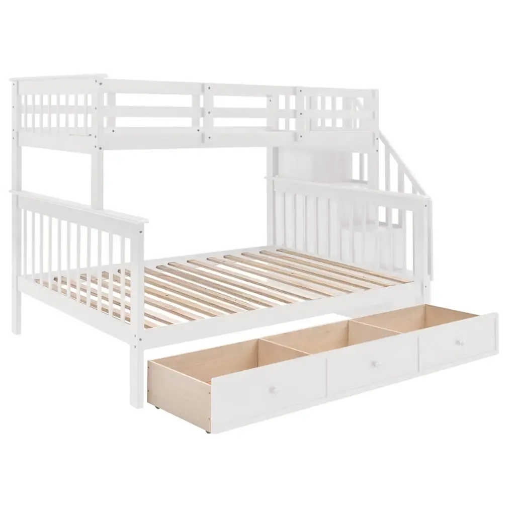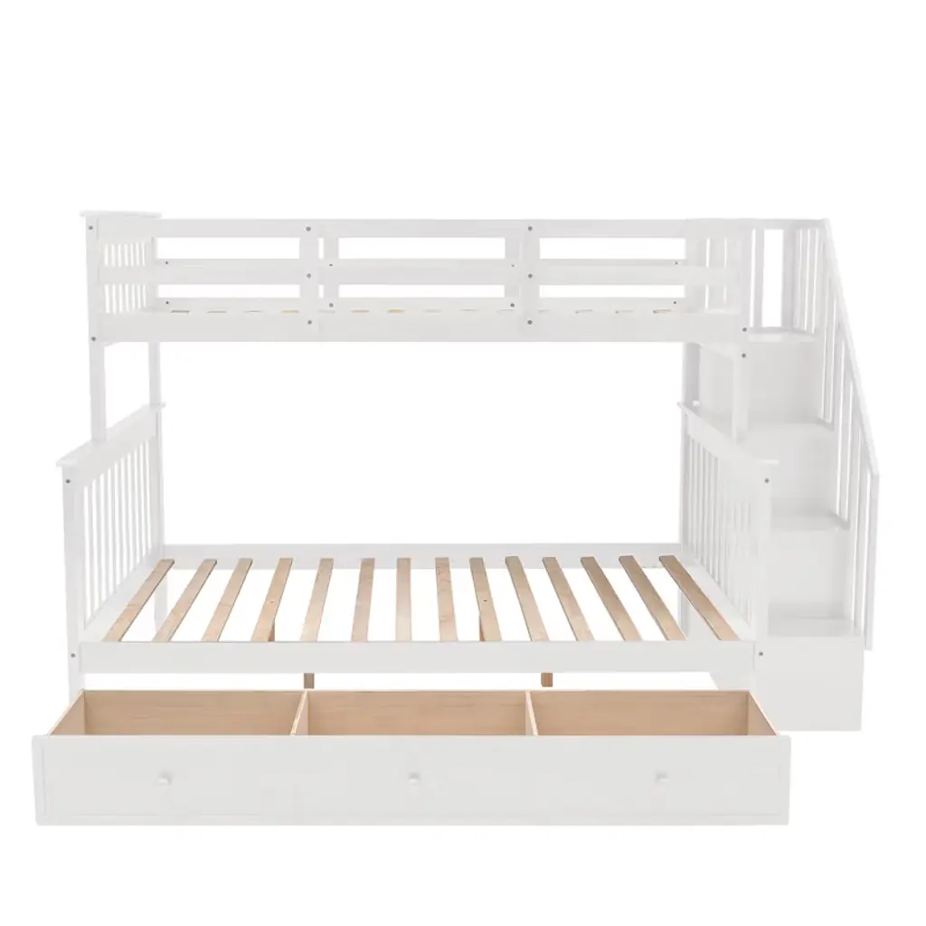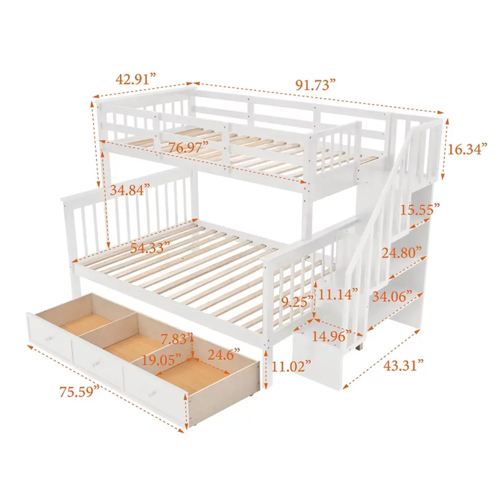 Product Features [Maximized storage space] Four compartments of different sizes hide underneath the stairs of this bunk bed and are perfect for you to store quilts, bed sheets and other necessities. On top of that, you can store books and toys, making room-tidying a breeze. Functional and aesthetic, this bunk bed will enhance any bedroom.[Versatility galore] This bunk bed features one twin size upper bunk, one full size bottom bunk for accommodating your family or any overnight sleepers. It can also be divided into two individual beds for even more convenience, depending on how you want to organize your space.[Solid, safe staircase] With a four-step set of stairs, this bunk bed provides easy and safe access for getting in and out of the top bunk. Also, given the width of the stairs they also double as very functional storage and help you change the quilts and bed sheets effortlessly when compared with traditional laddered bunks.[Designed for your family's safety] The upper bunk features a full-length guardrail, while the bottom bunk is designed to include both a headboard and footboard. Along with the handrail, this bunk bed ensures top-notch security for your family thanks to solid legs, made of solid pine for added strength and durability.Dimensions: Upper bunk - 76.97" x 42.91" (L x W). Bottom bunk - 76.97" x 54.33" (L x W). Distance between upper and bottom bunk - 34.84". Mattress not included.Weight Capacity: Upper bunk - 200lbs. Bottom bunk - 250lbs. Some assembly is required, although we have provided clear instructions and tools. Description If you need extra sleeping space or your family love sleepovers, this Stairway Twin-Over-Full Bunk Bed with Drawer is perfect for your home. Four open shelves located beneath the attached staircase provide ample storage for your family's toys and bedding. High-quality, solid pine legs and a strong, durable frame ensures stability and durability for long-term use, and can be separated into one twin, one full-size bed. Slat kit included so box springs are not required. This bunk bed is designed with a clean silhouette and a hue of elegance. It suits all styles of home decoration, and completes the look of any bedroom. Weight & Dimensions Overall Product Dimension: 91.73"L x 54.33"W x 61.4"HDetail Product Dimension: Please refer to the Size imageNumber of Package: 3Package Dimension: Please refer to the SpecificationOverall Product Weight: 199LBSPackage Weight: Please refer to the SpecificationWeight Capacity: Upper bed: 200LBS, Bottom bed: 250LBSRecommended Mattress Thickness: Upper bed: 6", Bottom bed: 8"Recommended Age: > 6 Years Old Specification Product Type: Bunk BedSize: Twin-Over-FullMaterial: Plywood + MDF + PinewoodBox Spring Required: NoNumber of Slats: Upper bed: 14, Bottom bed: 14Assembly Required: Yes