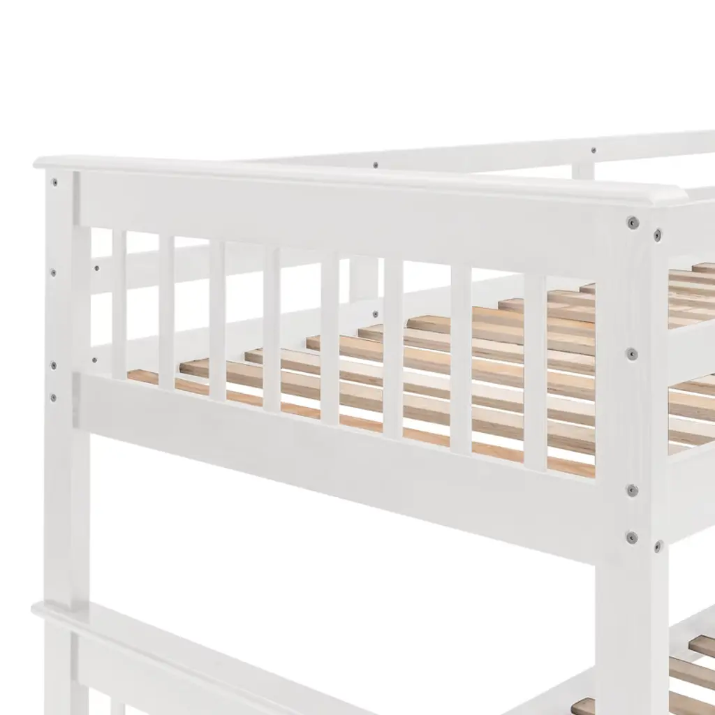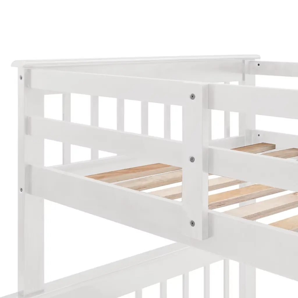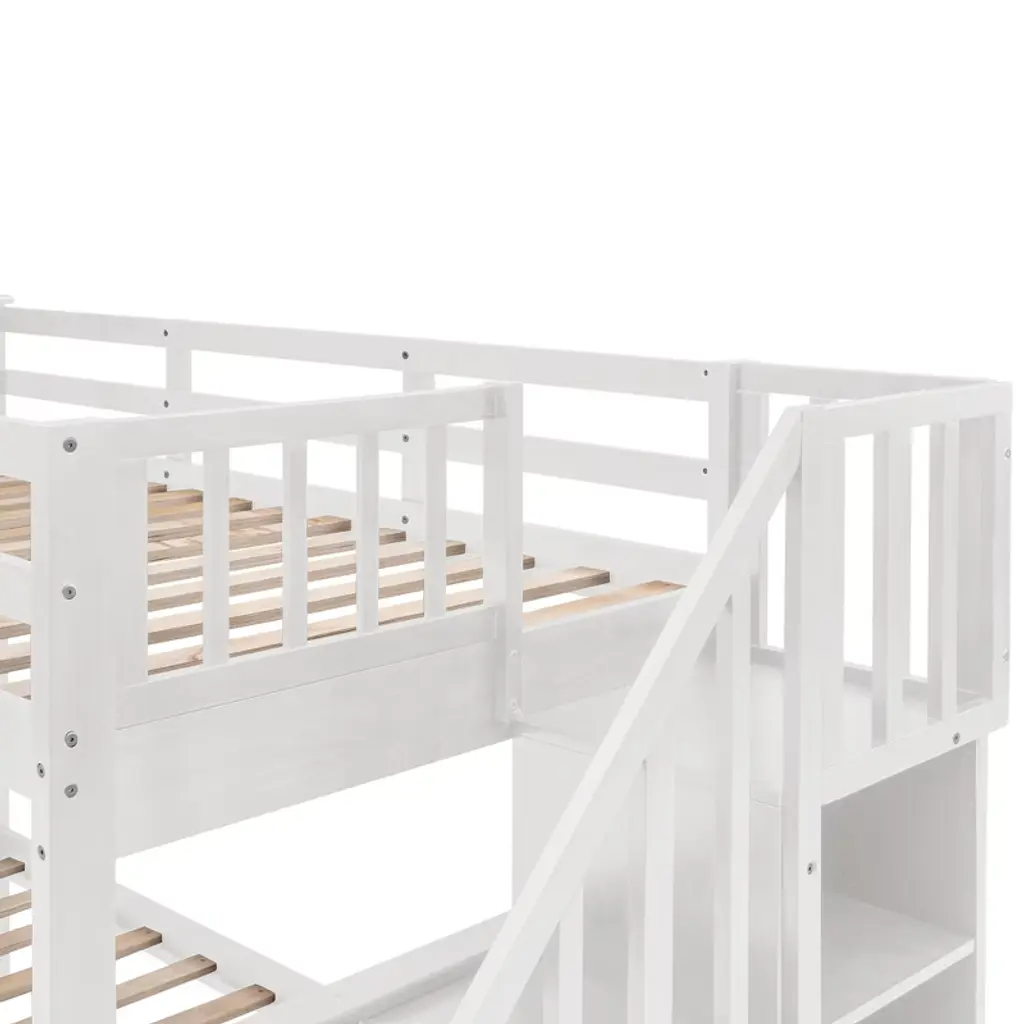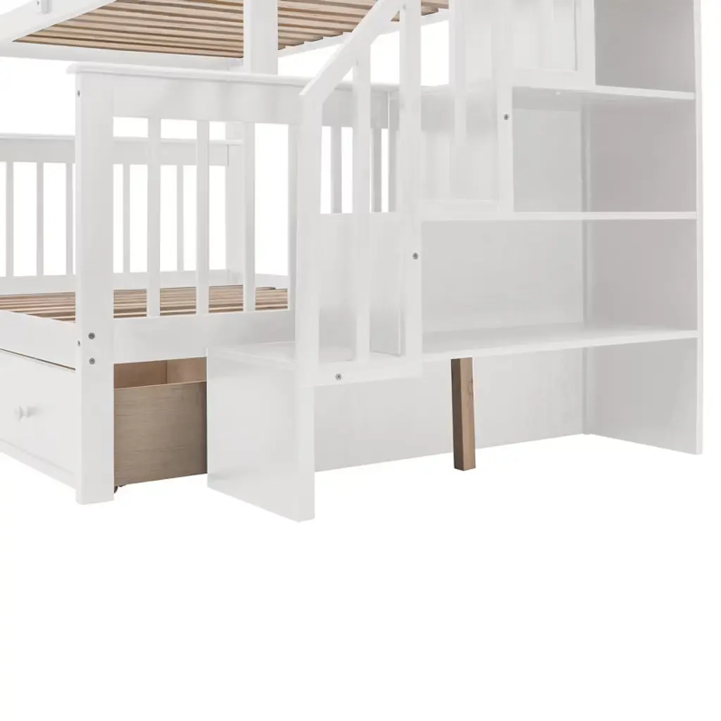 Product Features [Maximized storage space] Four compartments of different sizes hide underneath the stairs of this bunk bed and are perfect for you to store quilts, bed sheets and other necessities. On top of that, you can store books and toys, making room-tidying a breeze. Functional and aesthetic, this bunk bed will enhance any bedroom.[Versatility galore] This bunk bed features one twin size upper bunk, one full size bottom bunk for accommodating your family or any overnight sleepers. It can also be divided into two individual beds for even more convenience, depending on how you want to organize your space.[Solid, safe staircase] With a four-step set of stairs, this bunk bed provides easy and safe access for getting in and out of the top bunk. Also, given the width of the stairs they also double as very functional storage and help you change the quilts and bed sheets effortlessly when compared with traditional laddered bunks.[Designed for your family's safety] The upper bunk features a full-length guardrail, while the bottom bunk is designed to include both a headboard and footboard. Along with the handrail, this bunk bed ensures top-notch security for your family thanks to solid legs, made of solid pine for added strength and durability.Dimensions: Upper bunk - 76.97" x 42.91" (L x W). Bottom bunk - 76.97" x 54.33" (L x W). Distance between upper and bottom bunk - 34.84". Mattress not included.Weight Capacity: Upper bunk - 200lbs. Bottom bunk - 250lbs. Some assembly is required, although we have provided clear instructions and tools. Description If you need extra sleeping space or your family love sleepovers, this Stairway Twin-Over-Full Bunk Bed with Drawer is perfect for your home. Four open shelves located beneath the attached staircase provide ample storage for your family's toys and bedding. High-quality, solid pine legs and a strong, durable frame ensures stability and durability for long-term use, and can be separated into one twin, one full-size bed. Slat kit included so box springs are not required. This bunk bed is designed with a clean silhouette and a hue of elegance. It suits all styles of home decoration, and completes the look of any bedroom. Weight & Dimensions Overall Product Dimension: 91.73"L x 54.33"W x 61.4"HDetail Product Dimension: Please refer to the Size imageNumber of Package: 3Package Dimension: Please refer to the SpecificationOverall Product Weight: 199LBSPackage Weight: Please refer to the SpecificationWeight Capacity: Upper bed: 200LBS, Bottom bed: 250LBSRecommended Mattress Thickness: Upper bed: 6", Bottom bed: 8"Recommended Age: > 6 Years Old Specification Product Type: Bunk BedSize: Twin-Over-FullMaterial: Plywood + MDF + PinewoodBox Spring Required: NoNumber of Slats: Upper bed: 14, Bottom bed: 14Assembly Required: Yes
