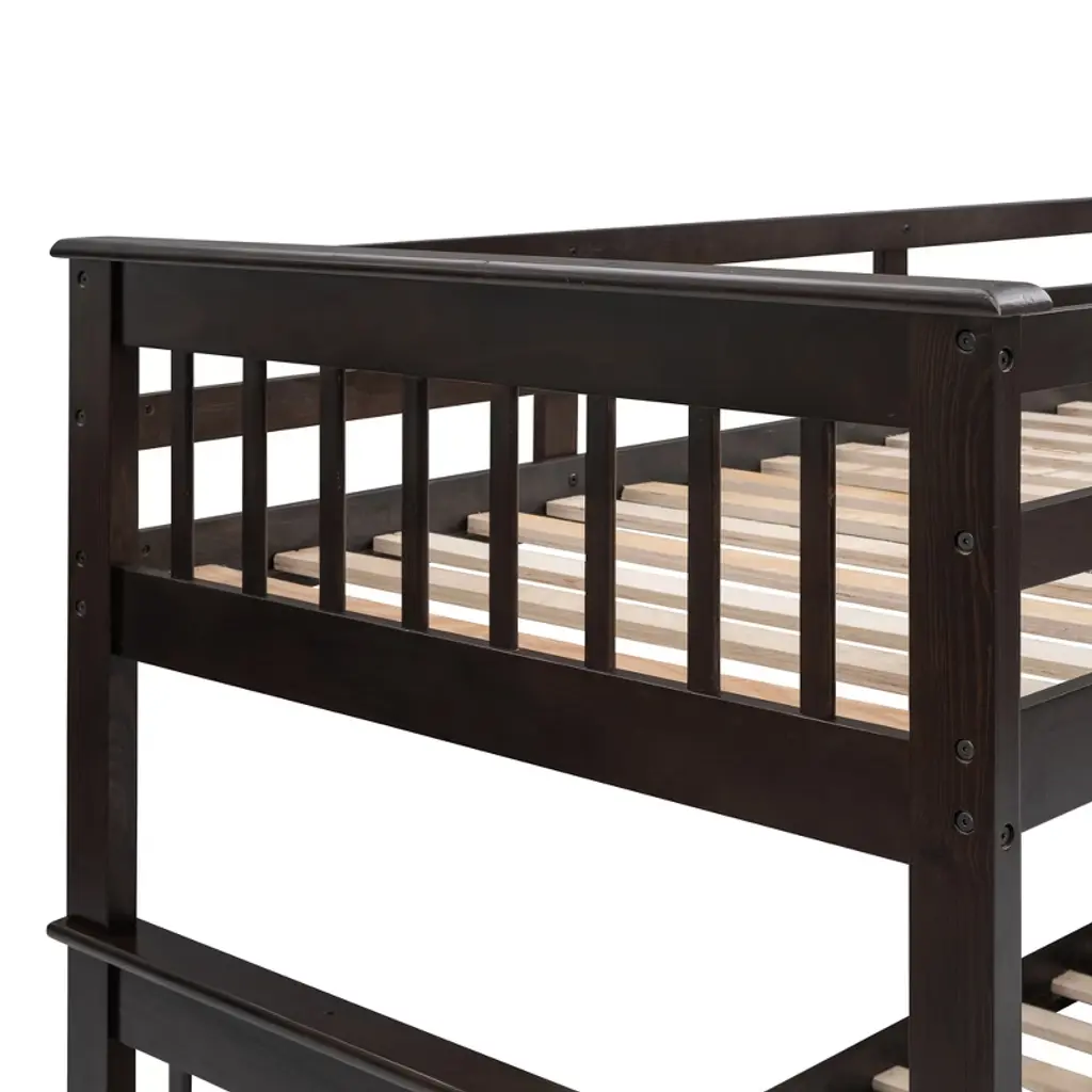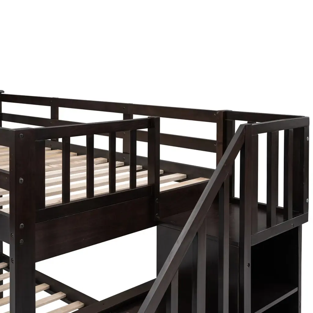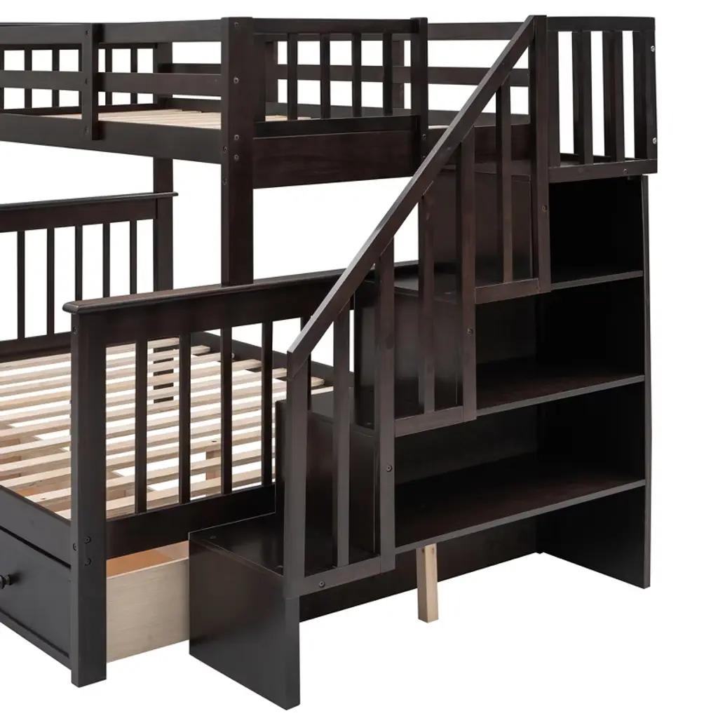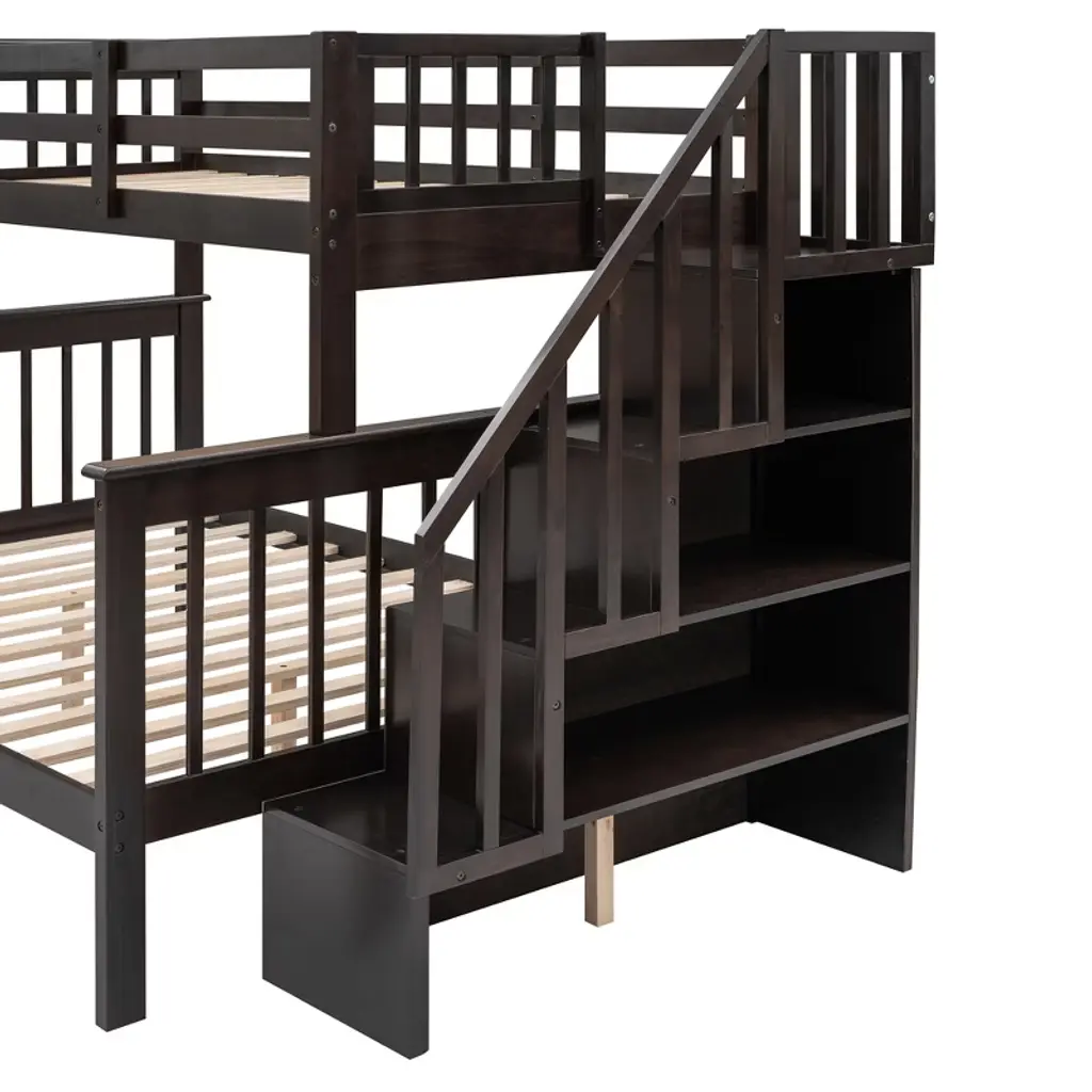 Product Features [Maximized storage space] Four compartments of different sizes hide underneath the stairs of this bunk bed and are perfect for you to store quilts, bed sheets and other necessities. On top of that, you can store books and toys, making room-tidying a breeze. Functional and aesthetic, this bunk bed will enhance any bedroom.[Versatility galore] This bunk bed features one twin size upper bunk, one full size bottom bunk for accommodating your family or any overnight sleepers. It can also be divided into two individual beds for even more convenience, depending on how you want to organize your space.[Solid, safe staircase] With a four-step set of stairs, this bunk bed provides easy and safe access for getting in and out of the top bunk. Also, given the width of the stairs they also double as very functional storage and help you change the quilts and bed sheets effortlessly when compared with traditional laddered bunks.[Designed for your family's safety] The upper bunk features a full-length guardrail, while the bottom bunk is designed to include both a headboard and footboard. Along with the handrail, this bunk bed ensures top-notch security for your family thanks to solid legs, made of solid pine for added strength and durability.Dimensions: Upper bunk - 76.97" x 42.91" (L x W). Bottom bunk - 76.97" x 54.33" (L x W). Distance between upper and bottom bunk - 34.84". Mattress not included.Weight Capacity: Upper bunk - 200lbs. Bottom bunk - 250lbs. Some assembly is required, although we have provided clear instructions and tools. Description If you need extra sleeping space or your family love sleepovers, this Stairway Twin-Over-Full Bunk Bed with Drawer is perfect for your home. Four open shelves located beneath the attached staircase provide ample storage for your family's toys and bedding. High-quality, solid pine legs and a strong, durable frame ensures stability and durability for long-term use, and can be separated into one twin, one full-size bed. Slat kit included so box springs are not required. This bunk bed is designed with a clean silhouette and a hue of elegance. It suits all styles of home decoration, and completes the look of any bedroom. Weight & Dimensions Overall Product Dimension: 91.73"L x 54.33"W x 61.4"HDetail Product Dimension: Please refer to the Size imageNumber of Package: 3Package Dimension: Please refer to the SpecificationOverall Product Weight: 199LBSPackage Weight: Please refer to the SpecificationWeight Capacity: Upper bed: 200LBS, Bottom bed: 250LBSRecommended Mattress Thickness: Upper bed: 6", Bottom bed: 8"Recommended Age: > 6 Years Old Specification Product Type: Bunk BedSize: Twin-Over-FullMaterial: Plywood + MDF + PinewoodBox Spring Required: NoNumber of Slats: Upper bed: 14, Bottom bed: 14Assembly Required: Yes