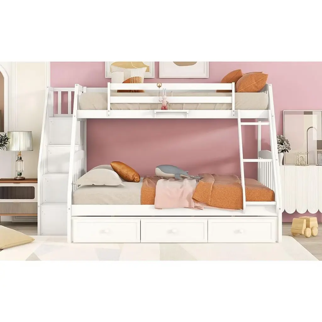 Twin-Over-Full Bunk Bed with Drawers,Ladder and Storage Staircase, White If you need extra sleeping space or your family love sleepovers, this Twin-Over-Full Bunk Bed with Drawers,Ladder and Storage Staircase is perfect for your home.Triple drawers under the bottom bed provide ample storage for your family' toys. Shelves in the staircase can be good place for books and decor. Ladder and staircase can be installed on both sides. There is a rack on the upper bedside which you can put small objects. High-quality, solid pine legs and a strong, durable frame ensures stability and durability for long-term use, and can be separated into one twin and one full-size bed. Slat kit included so box springs are not required. This bunk bed is designed with a clean silhouette and a hue of elegance. It suits all styles of home decoration, and completes the look of any bedroom. Weight & Dimensions Overall Product Dimension 93.4"L x 59"W x 60.65"H Detail Product Dimension Please refer to the Size image Number of Package 3 Package Dimension Please refer to the Specification Overall Product Weight 225LBS Package Weight Please refer to the Specification Weight Capacity Upper bed: 400LBS Bottom bed: 600LBS Recommended Mattress Thickness Upper bed: 4-6" Bottom bed: 3-4" Recommended Age > 6 years old Specifications Product Type Bunk Bed Size Twin-Over-Full Color Gray/White/Espresso Material Plywood+MDF+Pinewood Box Spring Required No Number of Slats Upper bed: 14 Bottom bed: 14 Assembly Required Yes Country of Origin Vietnam Notes Manual measurement has been used,there may be some reasonable error.All the pictures are taken by actual samples, slight chromatic aberration may occur due to lighting or display.