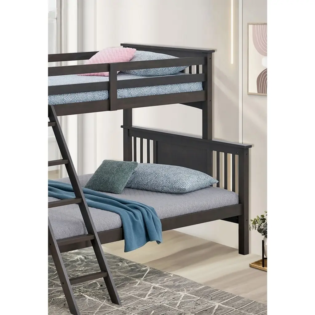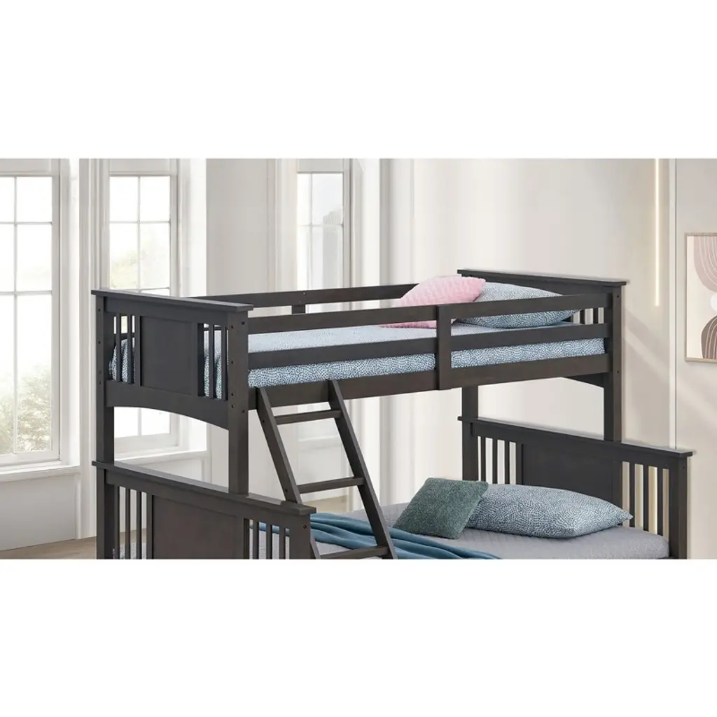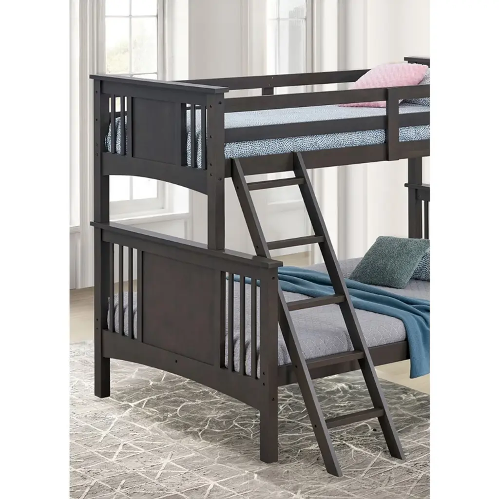 Product Features Transition StyleSolid Wood, Engineered woodPatented Insert & Lock JointAngled Ladder1pc Bunk Bed Only Product Dimension Bunk Bed: 72.5"W X 80"D X 65.5"H Product Description A Spring Creek bunk bed, specifically a twin over full bunk bed, with a grey finish. It features an angled ladder for front access and is constructed with solid hardwood and engineered wood. The bed also incorporates a patented insert and lock joint for secure assembly. . Listing Include: 1pc Bunk Bed Only. MATTRESS: NOT INCLUDED. Simple Assembly Required.