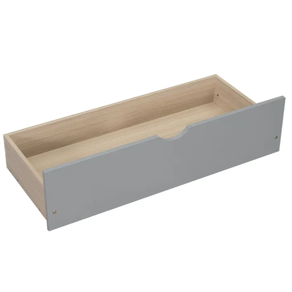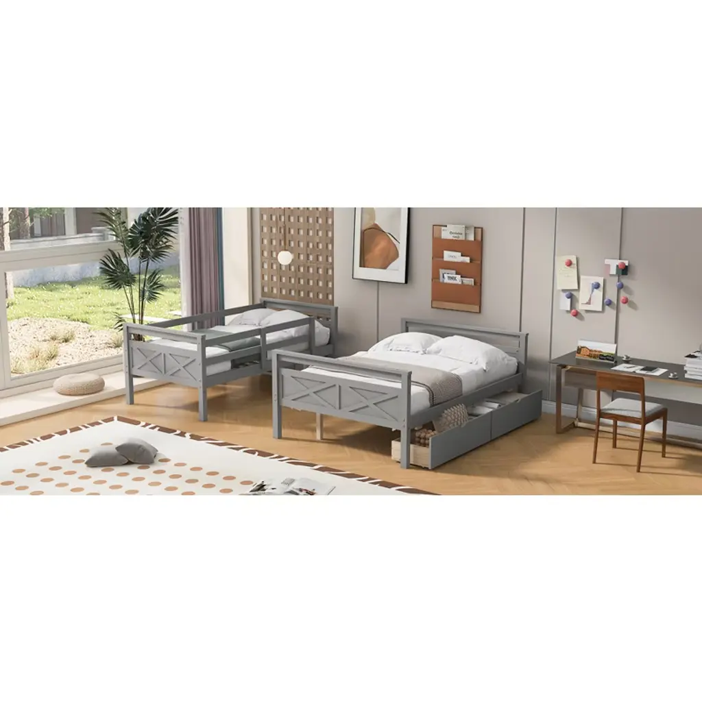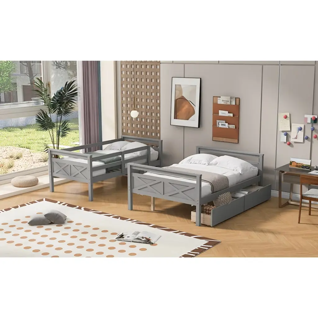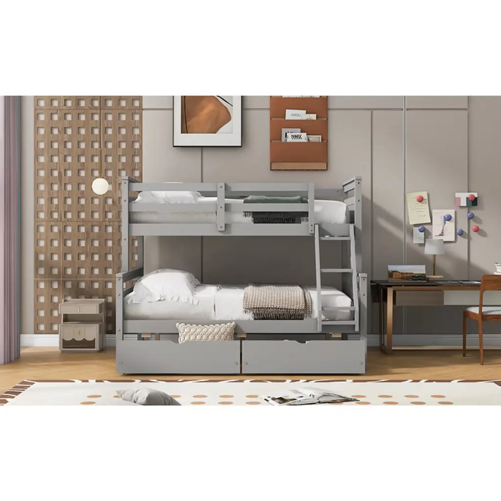 Product Features [Storage Drawers] There are 2 drawers underneath the bed, offering convenient storage space for daily necessities.[Safety Guaranteed] Solid wood slats blend naturally into the already sturdy frame to give added ground-up support that provides stability. The bunk bed features guard rails for added safety, and is accessible via the sturdy, slanted staircase.[2 Bunk Beds in 1] This set works perfectly as a stacked twin-over-full unit, or divided into 2 separate platform beds. You can choose the combination method based on your own needs.[Sturdy Construction] Made of high-quality solid pine wood and MDF with reliable construction, this bunk bed frame can last for long-time use and ensure strong stability and durability.[Easy Assembly] All parts, tools and instructions are shipped straight to your door in one efficiently packed box for simple set-up. Description This twin-over-full bunk bed is available in two different sizes of beds within one product. Making full use of limited space, this bunk bed will brighten up your room and save more room to play. In order to add safety, the ladder is attached to the bed and full-length guardrails are attached to the top bed, and the inclined ladder is easier to climb compared with upright ladder. Specification Material: Pine wood + MDFSize: Twin over FullFunction: Twin-over-fullDecoration: With two under-bed drawersNumbers of package: 2Spring box: No needAssembly Required: Yes Dimensions Overall Product Dimension: 79.3''L x 57.1''W x 61.3''HPackage Dimension: Please refer to the SpecificationUpper Bed: 39.3'' x 76''Down Bed: 54.5'' x 76''Total Height: 63''Number of Slats: 14 pcsOverall Product Weight: 170 lbsWeight Capability (Upper/Down): 300 lbs / 350 lbsRecommended Mattress Thickness: 6–8''