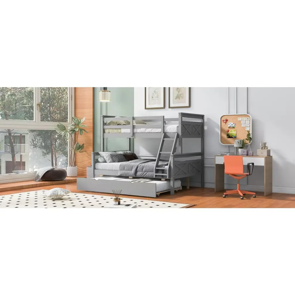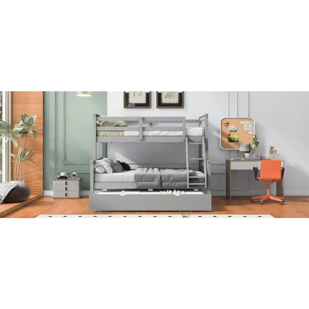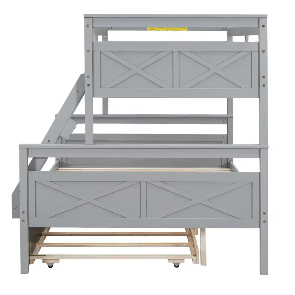 Product Features Sturdy Construction – Made of high-quality solid pine wood and MDF with reliable construction, this bunk bed frame ensures long-lasting use and strong stability and durability.Versatile Usage – This set works perfectly as a stacked twin-over-full unit or can be divided into 2 separate platform beds. Choose the combination that best fits your space and needs.Safety Guaranteed – Solid slats provide added ground-up support for enhanced stability. The bunk bed includes full-length guardrails for safety and features a sturdy, slanted staircase for easy access to the top bunk.Twin Size Trundle – The trundle bed helps you make effective use of room space and is perfect for hosting guests overnight.Easy Assembly – All parts, tools, and clear instructions are shipped together in one efficiently packed box for simple setup. Description This twin-over-full bunk bed offers three beds in two sizes within one product, giving you multiple sleeping options. Designed to maximize limited space, this bunk bed will brighten up your room while saving more floor space for play or storage. For added safety, the bed includes an attached ladder and full-length guardrails on the top bunk. The inclined ladder design makes climbing easier and safer compared to vertical ladders. Specification Material: Pine Wood + MDFSize: Twin / FullDecoration: With TrundleNumbers of Package: 2Spring Box: No needAssembly Required: Yes Dimensions Overall Product Dimension: 79.3''L x 57.1''W x 61.3''HPackage Dimension: Please refer to the SpecificationUpper Bed Dimension: 39.3'' x 76''Down Bed Dimension: 54.5'' x 76''Trundle Dimension: 39.2'' x 70.7''Total Height: 61.3''Number of Upper/Down Slats: 14 pcsNumber of Trundle Slats: 7 pcsRecommended Mattress Thickness (Upper/Down/Trundle): 6–8'' / 6–8'' / 6''Overall Product Weight: 167 lbsBed Weight Capacity (Upper/Down/Trundle): 300 lbs / 350 lbs / 300 lbs