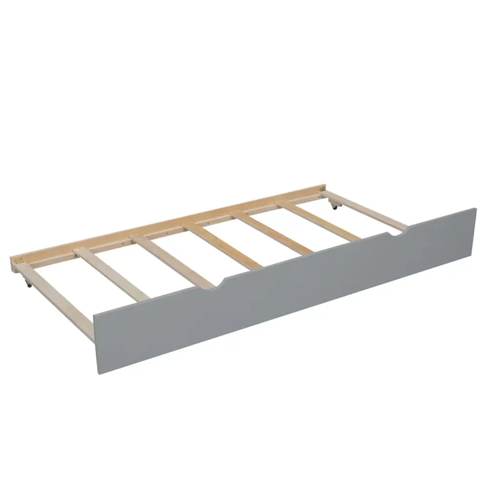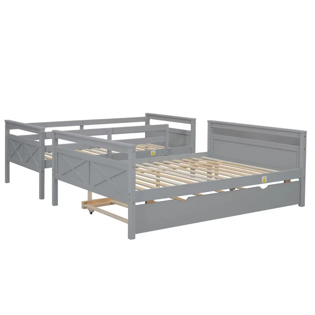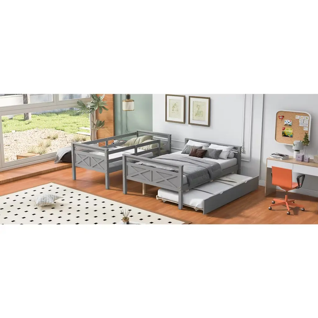 Product Features Sturdy Construction – Made of high-quality solid pine wood and MDF with reliable construction, this bunk bed frame ensures long-lasting use and strong stability and durability.Versatile Usage – This set works perfectly as a stacked twin-over-full unit or can be divided into 2 separate platform beds. Choose the combination that best fits your space and needs.Safety Guaranteed – Solid slats provide added ground-up support for enhanced stability. The bunk bed includes full-length guardrails for safety and features a sturdy, slanted staircase for easy access to the top bunk.Twin Size Trundle – The trundle bed helps you make effective use of room space and is perfect for hosting guests overnight.Easy Assembly – All parts, tools, and clear instructions are shipped together in one efficiently packed box for simple setup. Description This twin-over-full bunk bed offers three beds in two sizes within one product, giving you multiple sleeping options. Designed to maximize limited space, this bunk bed will brighten up your room while saving more floor space for play or storage. For added safety, the bed includes an attached ladder and full-length guardrails on the top bunk. The inclined ladder design makes climbing easier and safer compared to vertical ladders. Specification Material: Pine Wood + MDFSize: Twin / FullDecoration: With TrundleNumbers of Package: 2Spring Box: No needAssembly Required: Yes Dimensions Overall Product Dimension: 79.3''L x 57.1''W x 61.3''HPackage Dimension: Please refer to the SpecificationUpper Bed Dimension: 39.3'' x 76''Down Bed Dimension: 54.5'' x 76''Trundle Dimension: 39.2'' x 70.7''Total Height: 61.3''Number of Upper/Down Slats: 14 pcsNumber of Trundle Slats: 7 pcsRecommended Mattress Thickness (Upper/Down/Trundle): 6–8'' / 6–8'' / 6''Overall Product Weight: 167 lbsBed Weight Capacity (Upper/Down/Trundle): 300 lbs / 350 lbs / 300 lbs