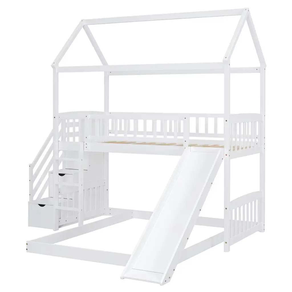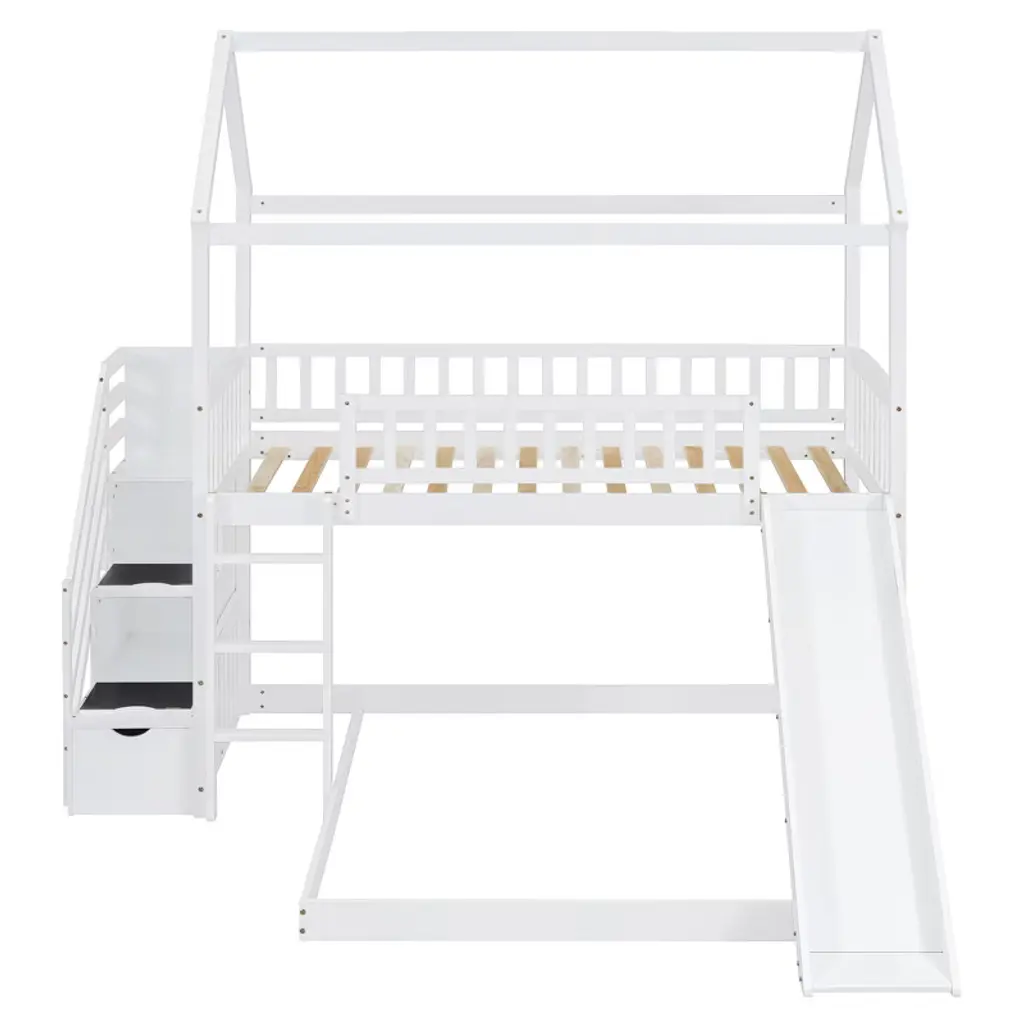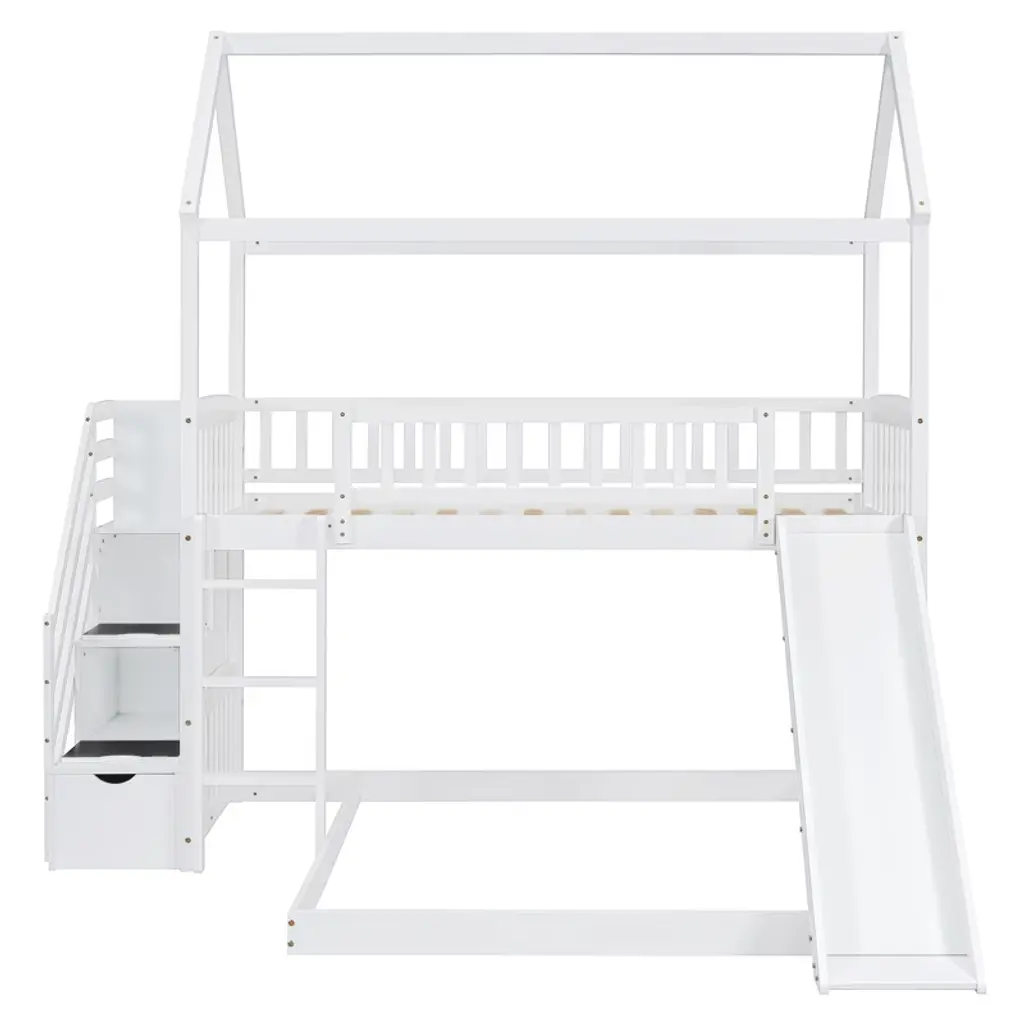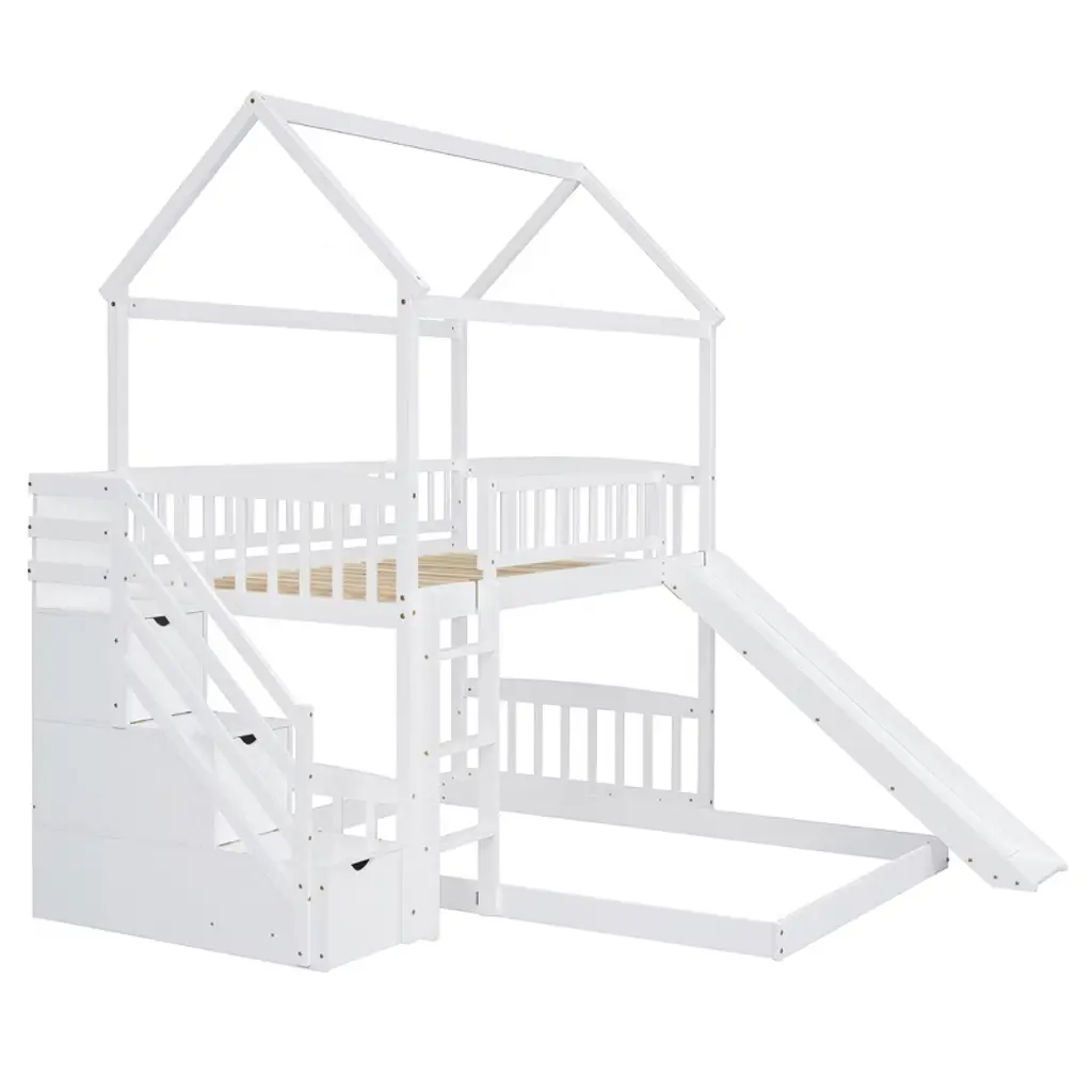 Product Features Maximized Space Saving: This bunk bed has a twin size bed on the top and a full size bed on the bottom, which can accommodate two people. It combines brackets, storage steps, and slides into one, saving space to the greatest extent. The two drawers located beneath the attached staircase provide ample storage for your clothing and bedding.Friendly Design: Crafted with a whimsical playhouse design, comes with slide and storage steps, this bunk bed offers you a comfortable and exhilarating experience during both sleep and playtime that will let your imaginations run wild. Perfect for hours of entertainment and relaxation, the playhouse design makes this bunk the perfect centerpiece for your bedroom.Designed with Safety in Mind: The bed frame is constructed from selected solid pine wood and MDF and iron alloy bolts which keeps the whole bed sturdy and wobble free. The upper bunk has high rails to ensure secure and worry-free nights. The strengthened frame is capable of holding up to 250lbs on the top bunk and 300lbs on the bottom bunk. The bunk features my slats to help increase the longevity of your mattresses, no box spring is needed.Two Assembly Methods: Our storage steps and slide can be installed on the left or right side of the bed or both on the left or right side. You can choose the installation method according to your preferences or room layout.Dimensions: Overall Product Dimension: 77.4" x 41.6" x 84.4" (L x W x H), this product comes in 3 separate packages. Mattress not included. Some assembly is required, although we have provided clear instructions and tools. Description If you are choosing a multifunctional bunk bed, this will be your best choice. This Twin over Full bunk bed can provide two people to rest. It has storage steps on the side and two drawers for storing items. You can put your clothing and odds and ends in it. There is a slide that can slide down directly from the upper bed, combining entertainment and practicality. Solid pine legs and a strong, durable frame ensures stability and durability for long-term use. Slat kit included so box springs are not required. This bunk bed is designed with a clean silhouette and a hue of elegance. It suits all styles of home decoration, and completes the look of any bedroom. Weight & Dimensions Overall Product Dimension: 77.4"L x 41.6"W x 84.4"HDetail Product Dimension: Please refer to the Size imageNumber of Package: 3Package Dimension: Please refer to the SpecificationOverall Product Weight: 190 LBSWeight Capacity: Upper bed: 250 LBS, Bottom bed: 300 LBSRecommended Mattress Thickness: Upper bed: 4–6", Bottom bed: 8"Recommended Age: > 6 years old Specification Product Type: Bunk BedSize: Twin over FullProduct Material: Plywood + MDF + PinewoodBox Spring Required: No
