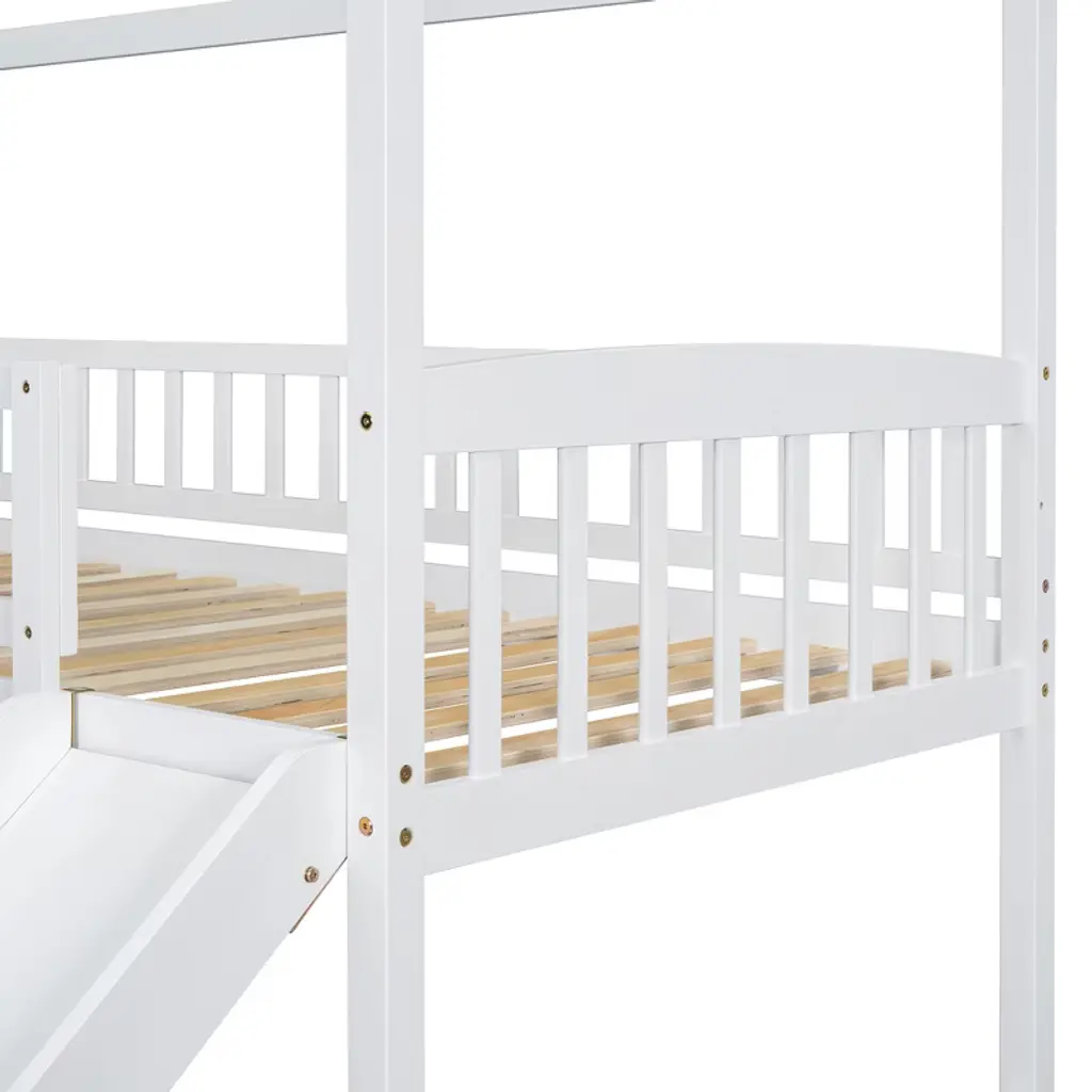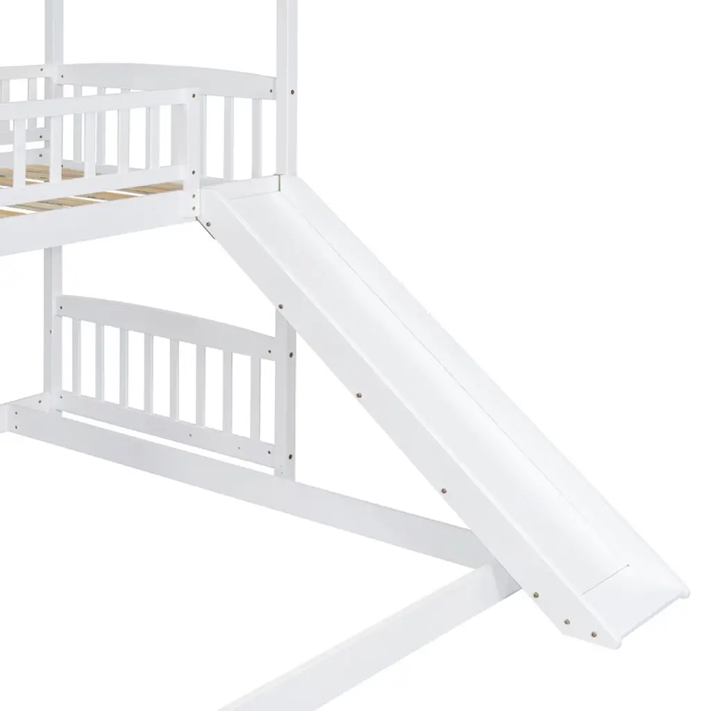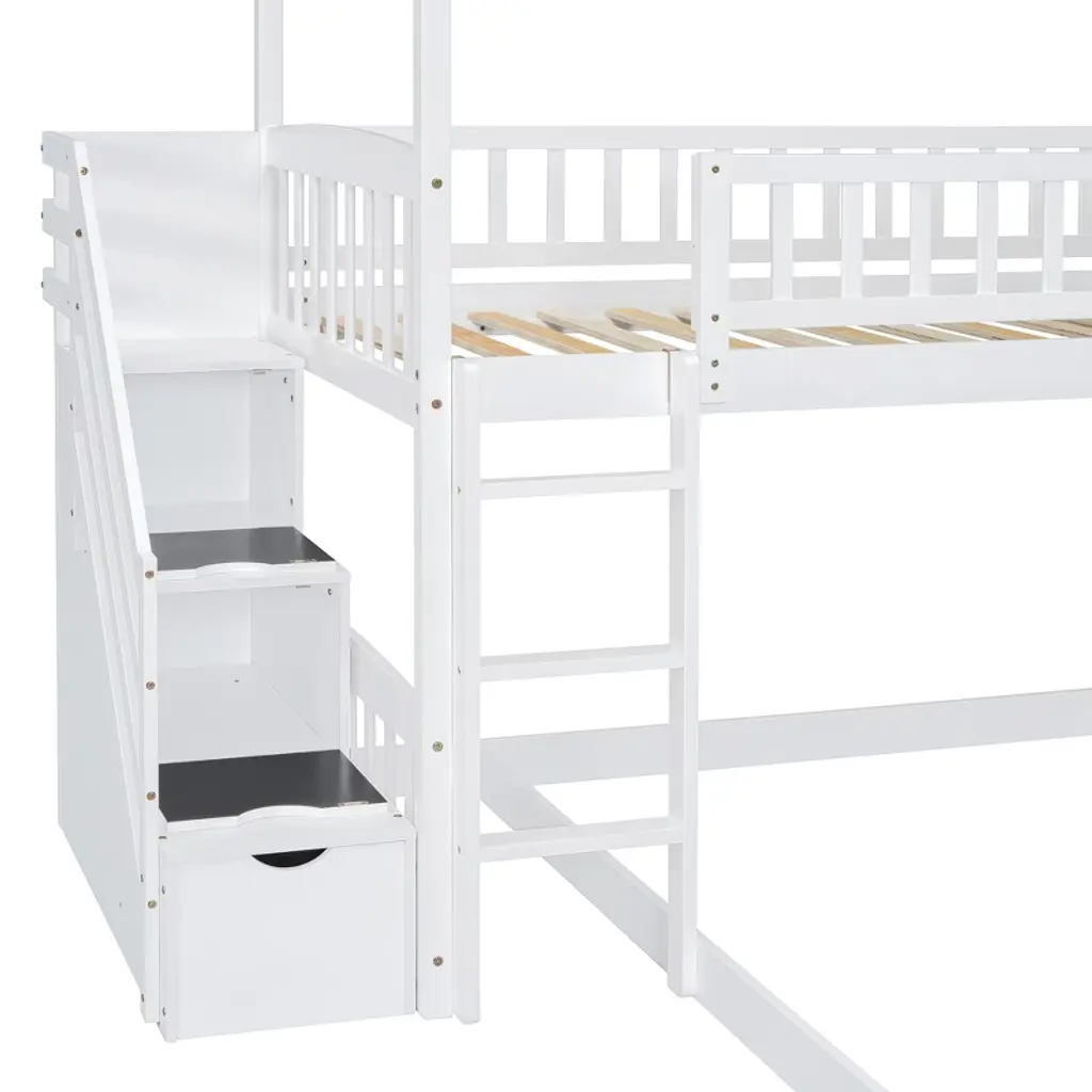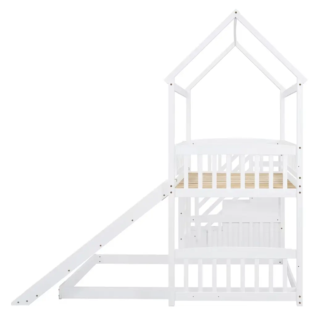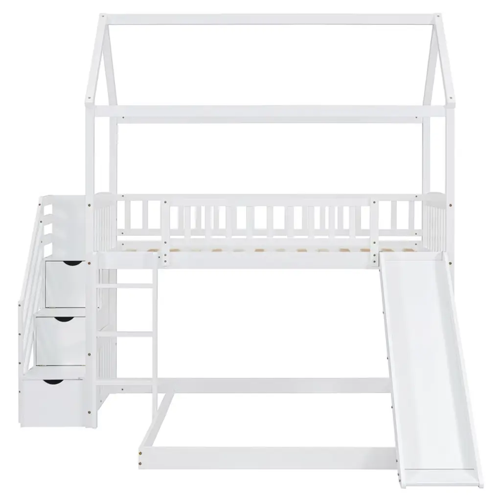 Product Features Maximized Space Saving: This bunk bed has a twin size bed on the top and a full size bed on the bottom, which can accommodate two people. It combines brackets, storage steps, and slides into one, saving space to the greatest extent. The two drawers located beneath the attached staircase provide ample storage for your clothing and bedding.Friendly Design: Crafted with a whimsical playhouse design, comes with slide and storage steps, this bunk bed offers you a comfortable and exhilarating experience during both sleep and playtime that will let your imaginations run wild. Perfect for hours of entertainment and relaxation, the playhouse design makes this bunk the perfect centerpiece for your bedroom.Designed with Safety in Mind: The bed frame is constructed from selected solid pine wood and MDF and iron alloy bolts which keeps the whole bed sturdy and wobble free. The upper bunk has high rails to ensure secure and worry-free nights. The strengthened frame is capable of holding up to 250lbs on the top bunk and 300lbs on the bottom bunk. The bunk features my slats to help increase the longevity of your mattresses, no box spring is needed.Two Assembly Methods: Our storage steps and slide can be installed on the left or right side of the bed or both on the left or right side. You can choose the installation method according to your preferences or room layout.Dimensions: Overall Product Dimension: 77.4" x 41.6" x 84.4" (L x W x H), this product comes in 3 separate packages. Mattress not included. Some assembly is required, although we have provided clear instructions and tools. Description If you are choosing a multifunctional bunk bed, this will be your best choice. This Twin over Full bunk bed can provide two people to rest. It has storage steps on the side and two drawers for storing items. You can put your clothing and odds and ends in it. There is a slide that can slide down directly from the upper bed, combining entertainment and practicality. Solid pine legs and a strong, durable frame ensures stability and durability for long-term use. Slat kit included so box springs are not required. This bunk bed is designed with a clean silhouette and a hue of elegance. It suits all styles of home decoration, and completes the look of any bedroom. Weight & Dimensions Overall Product Dimension: 77.4"L x 41.6"W x 84.4"HDetail Product Dimension: Please refer to the Size imageNumber of Package: 3Package Dimension: Please refer to the SpecificationOverall Product Weight: 190 LBSWeight Capacity: Upper bed: 250 LBS, Bottom bed: 300 LBSRecommended Mattress Thickness: Upper bed: 4–6", Bottom bed: 8"Recommended Age: > 6 years old Specification Product Type: Bunk BedSize: Twin over FullProduct Material: Plywood + MDF + PinewoodBox Spring Required: No