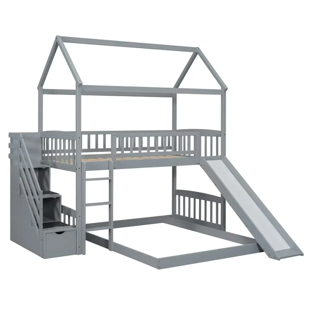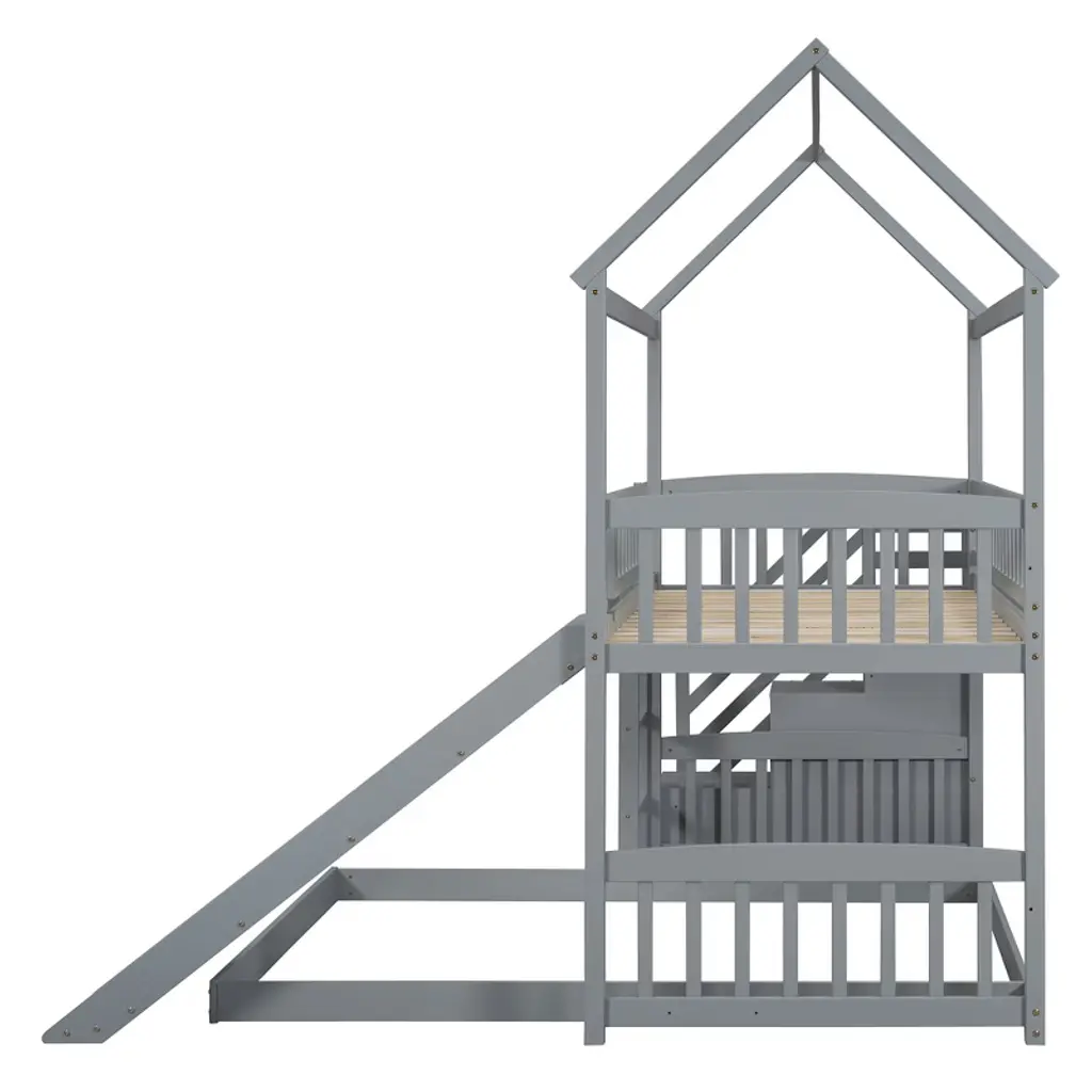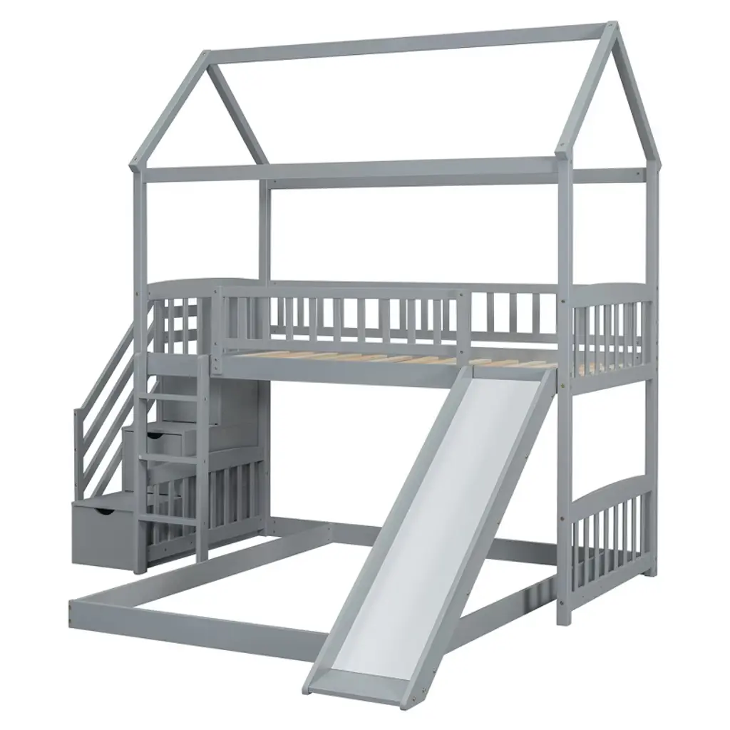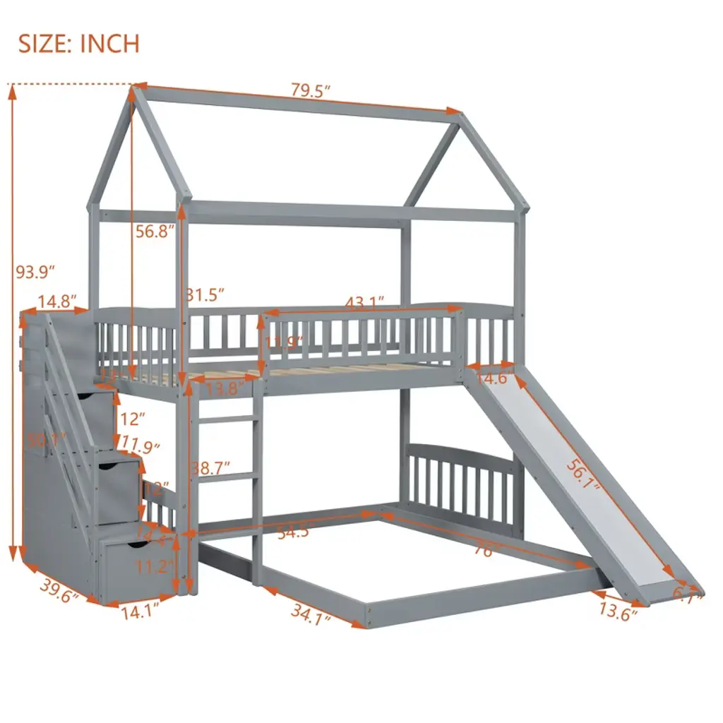 Product Features Maximized Space Saving: This bunk bed has a twin size bed on the top and a full size bed on the bottom, which can accommodate two people. It combines brackets, storage steps, and slides into one, saving space to the greatest extent. The two drawers located beneath the attached staircase provide ample storage for your clothing and bedding.Friendly Design: Crafted with a whimsical playhouse design, comes with slide and storage steps, this bunk bed offers you a comfortable and exhilarating experience during both sleep and playtime that will let your imaginations run wild. Perfect for hours of entertainment and relaxation, the playhouse design makes this bunk the perfect centerpiece for your bedroom.Designed with Safety in Mind: The bed frame is constructed from selected solid pine wood and MDF and iron alloy bolts which keeps the whole bed sturdy and wobble free. The upper bunk has high rails to ensure secure and worry-free nights. The strengthened frame is capable of holding up to 250lbs on the top bunk and 300lbs on the bottom bunk. The bunk features my slats to help increase the longevity of your mattresses, no box spring is needed.Two Assembly Methods: Our storage steps and slide can be installed on the left or right side of the bed or both on the left or right side. You can choose the installation method according to your preferences or room layout.Dimensions: Overall Product Dimension: 77.4" x 41.6" x 84.4" (L x W x H), this product comes in 3 separate packages. Mattress not included. Some assembly is required, although we have provided clear instructions and tools. Description If you are choosing a multifunctional bunk bed, this will be your best choice. This Twin over Full bunk bed can provide two people to rest. It has storage steps on the side and two drawers for storing items. You can put your clothing and odds and ends in it. There is a slide that can slide down directly from the upper bed, combining entertainment and practicality. Solid pine legs and a strong, durable frame ensures stability and durability for long-term use. Slat kit included so box springs are not required. This bunk bed is designed with a clean silhouette and a hue of elegance. It suits all styles of home decoration, and completes the look of any bedroom. Weight & Dimensions Overall Product Dimension: 77.4"L x 41.6"W x 84.4"HDetail Product Dimension: Please refer to the Size imageNumber of Package: 3Package Dimension: Please refer to the SpecificationOverall Product Weight: 190 LBSWeight Capacity: Upper bed: 250 LBS, Bottom bed: 300 LBSRecommended Mattress Thickness: Upper bed: 4–6", Bottom bed: 8"Recommended Age: > 6 years old Specification Product Type: Bunk BedSize: Twin over FullProduct Material: Plywood + MDF + PinewoodBox Spring Required: No