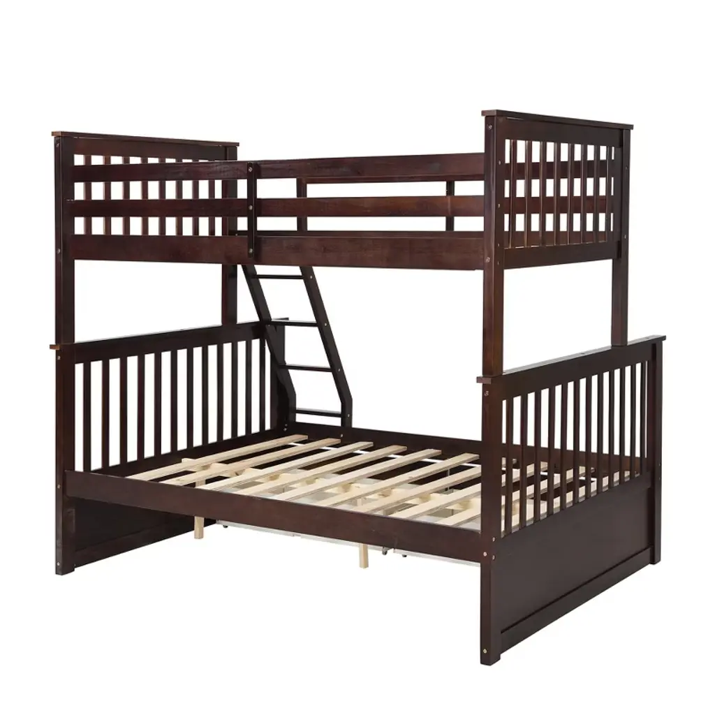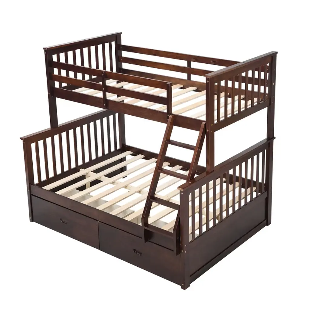 Product Features [Versatility galore] This bunk bed features one twin size upper bed and one full size bottom bed for accommodating your family or any overnight sleepers. It can also be divided into two individual beds for even more convenience, depending on how you want to organize your space. No spring box needed.[Bunk Bed with Drawers] This bunk bed is the ultimate space-saving solution for accommodating spontaneous sleepovers or maximizing room space. What sets it apart are the two drawers cleverly tucked beneath, offering convenient storage for clothes and bedtime essentials.[Solid Construction] The bed structure is crafted from high-quality solid pine wood and a strong, durable frame so that the bed is sturdy and durable.[Top-Notch Safety Features] Safety is paramount, especially for families. The upper bunk is thoughtfully designed with a full-length guardrail to prevent any accidents during the night. The bottom bunk is equipped with both a headboard and footboard for added security. A sturdy handrail adds an extra layer of safety to the top bunk.[ Easy Assembly and Versatile Use] While assembly is required, the included instructions guide you through the process.