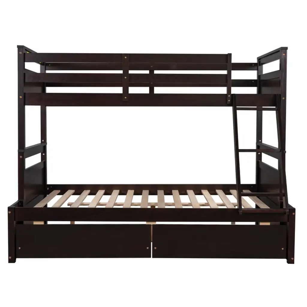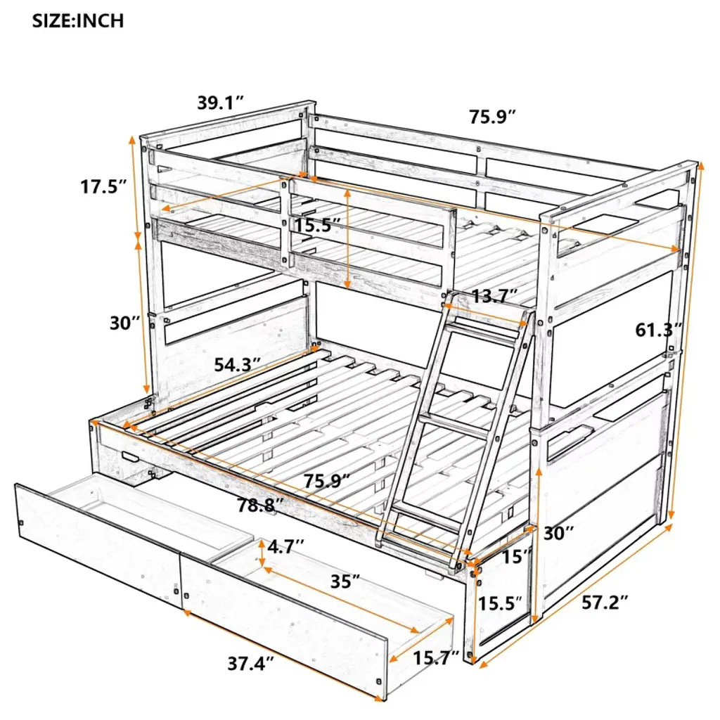 If you need extra sleeping space or your family love sleepovers, this Twin-Over-Full Bunk Bed with Storage is perfect for your home. A pair of drawers under the bottom bed provide ample storage for your family' toys and bedding. High-quality, solid pine legs and a strong, durable frame ensures stability and durability for long-term use, and can be separated into one twin and one full-size bed. Slat kit included so box springs are not required. This bunk bed is designed with a clean silhouette and a hue of elegance. It suits all styles of home decoration, and completes the look of any bedroom. Weight & Dimensions Overall Product Dimension 78.8"L x 57.2"W x61.3"H Detail Product Dimension Please refer to the Size image Number of Package 2 Package Dimension Please refer to the Specification Overall Product Weight 169LBS Package Weight Please refer to the Specification Weight Capacity Upper bed: 175LBS Bottom bed:300LBS Recommended age > 6 years old Recommended Mattress Thickness Upper bed: 6" Bottom bed:5" Specification Product Type Bunk Bed Size Twin-Over-Full Color White/Gray/Espresso Material Plywood+MDF+Pinewood Box Spring Required No Number of Slats Upper bed:14 Bottom bed:14 Assembly Required Yes Country of Origin Vietnam Notes: Manual measurement has been used,there may be some reasonable error.All the pictures are taken by actual samples, slight chromatic aberration may occur due to lighting or display.