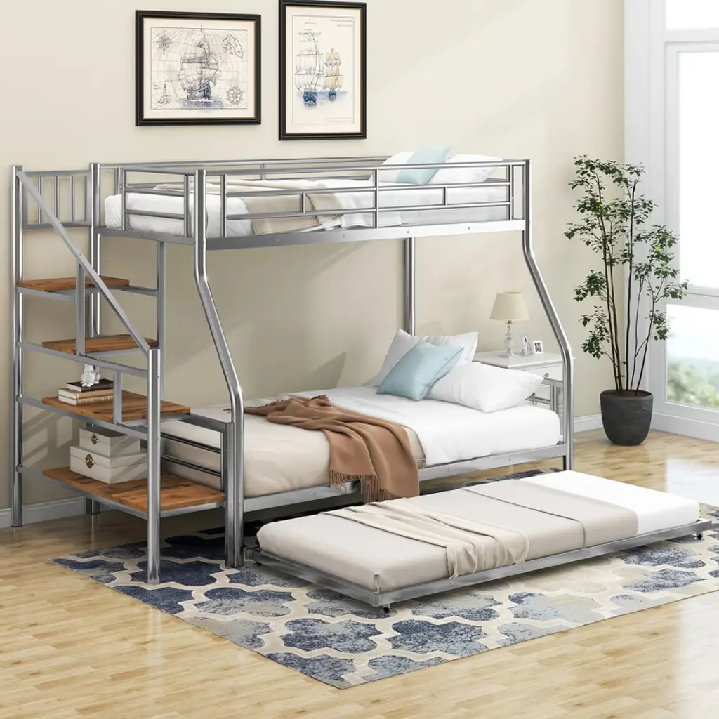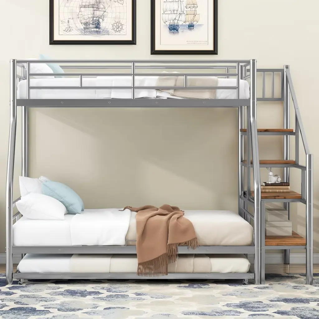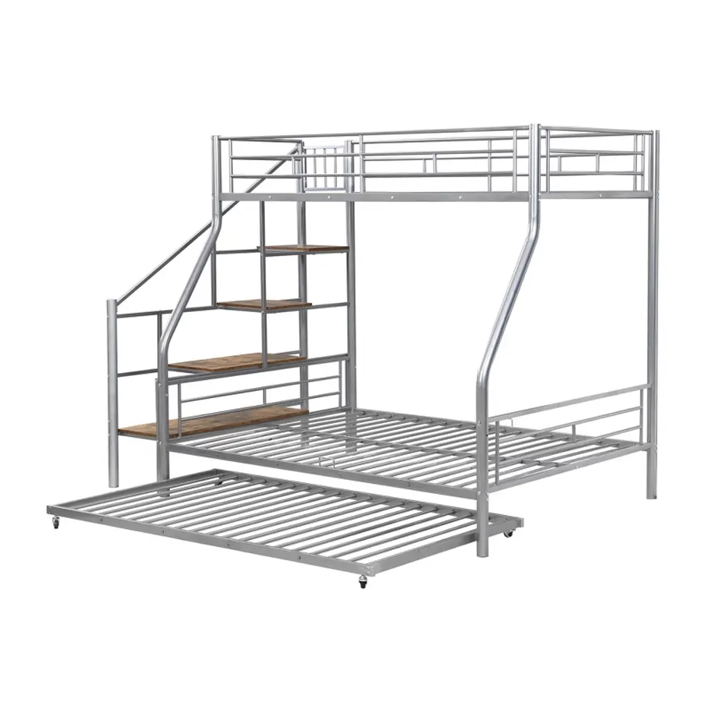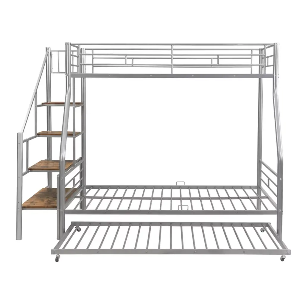 Twin Over Full Bunk Bed With Trundle And Stairs, Heavy Duty Bunk Bed With Storage Staircase For Bedroom Dorm, Silver