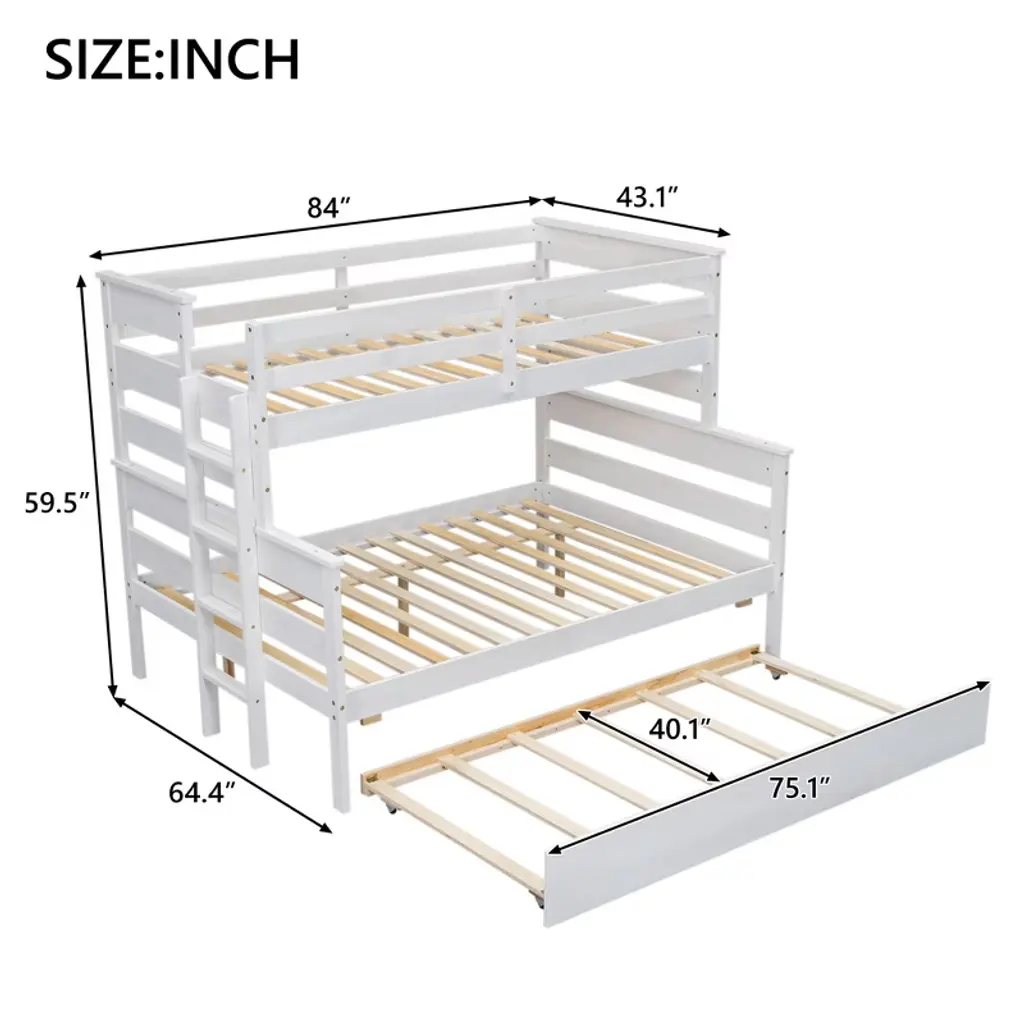 The bunk bed with a trundle is a perfect space-saving solution to you. Simple and interesting appearance gives your creativity free reign and you can decorate this bed with your kids, giving full play to kids' imagination. Crafted from Pine Wood+MDF, the bed features sturdy frame and safety guaranteed. This bed contains 3 beds, which is the best choice for space storage lovers or families with limited room space.Product Detail:- Product Type:Bunk Bed- Size:Twin over Full- Overall Product Dimension:84"L x 64.4"W x 59.5"H- Overall Product Weight:195 LBS- Detail Dimension: Please refer to the Size picture- Weight Capacity: (Upper/Down/Trundle): 250 LBS/400 LBS/250 LBS- Material: Pine Wood+MDF- Recommended Mattress Thickness: (Upper/Down/Trundle): 6-8''/8-10''/6'' (The mattress is not included)- Number of Packages: 2 (Packages shipped separately may not arrive at the same time, please be patient.)- Assembly Required:YesWhat's in the box:- Bed * 1- Tools included- Instruction manual