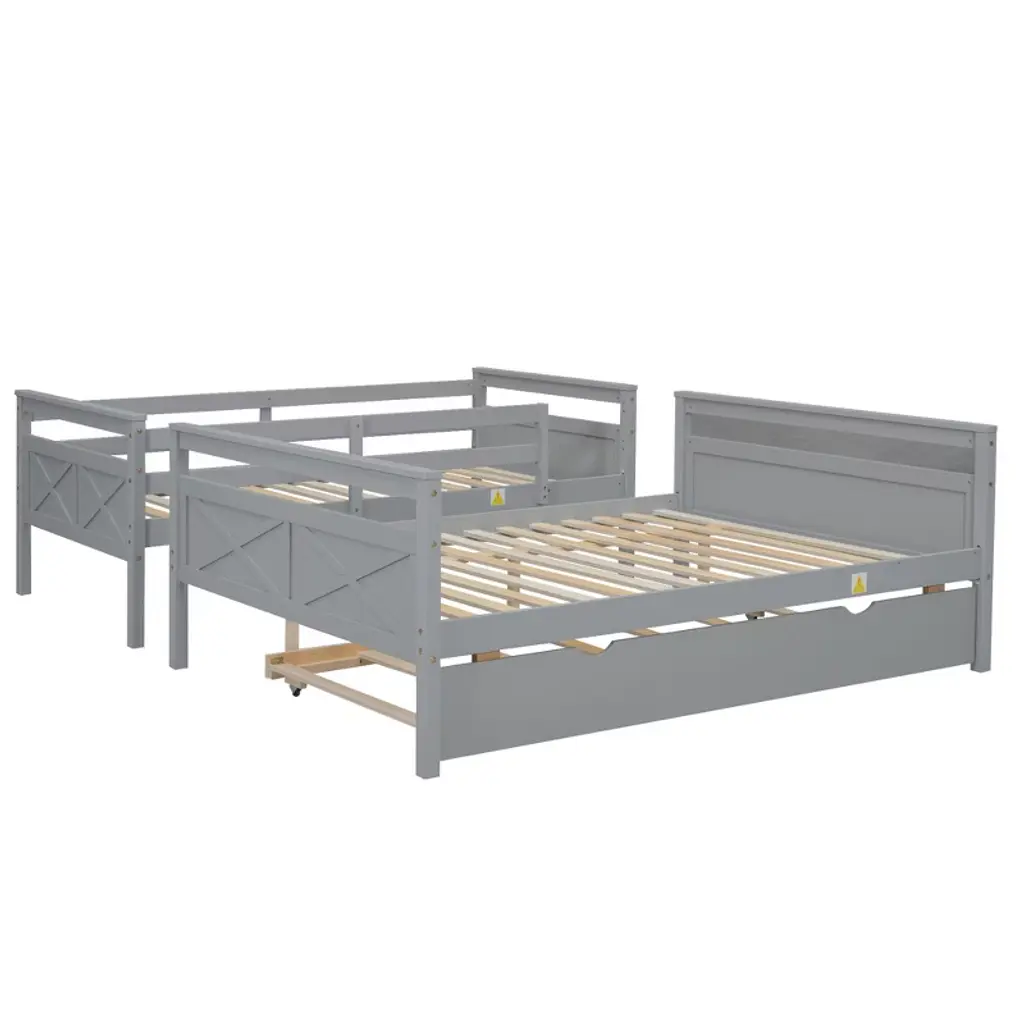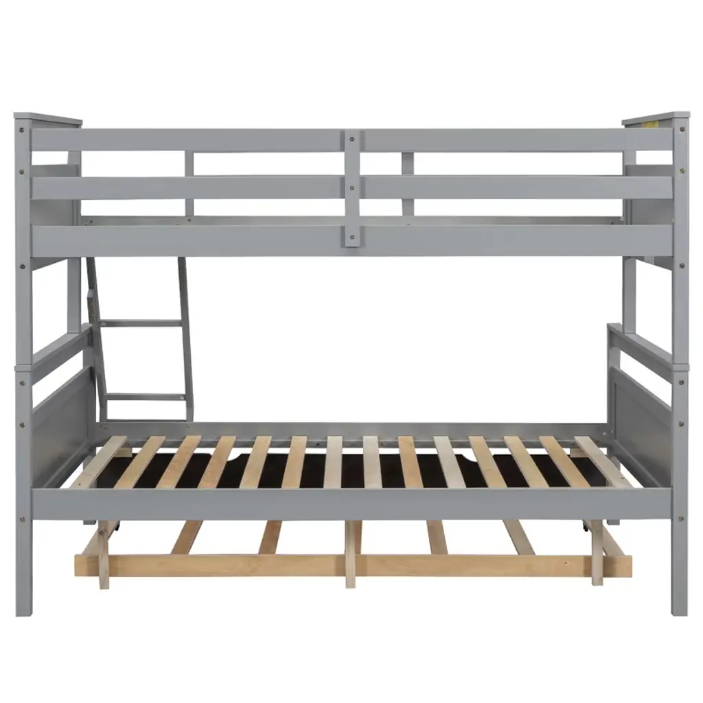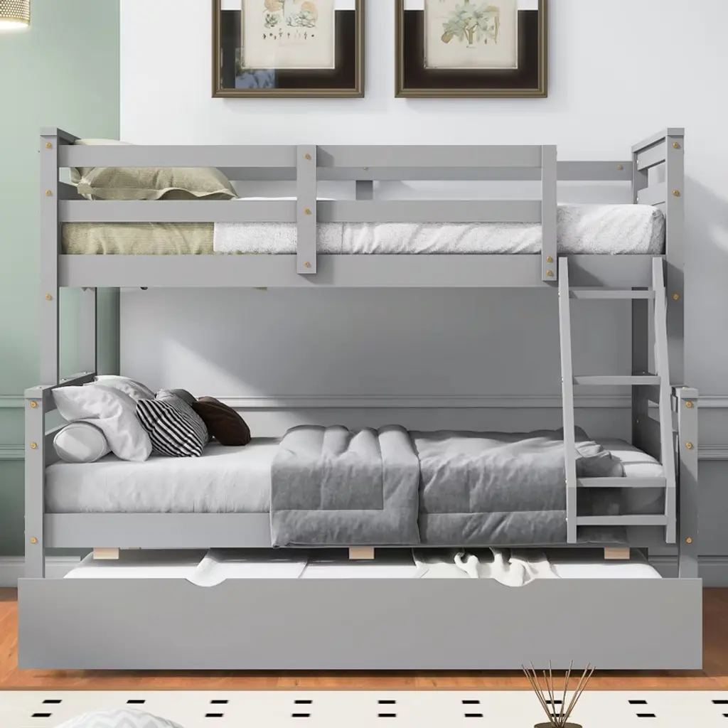 Twin Over Full Bunk Beds With Trundle, Solid Wood Bunk Bed Frame With For Kids Teens Adults, Can Be Convertible To 2 Beds, Gray
