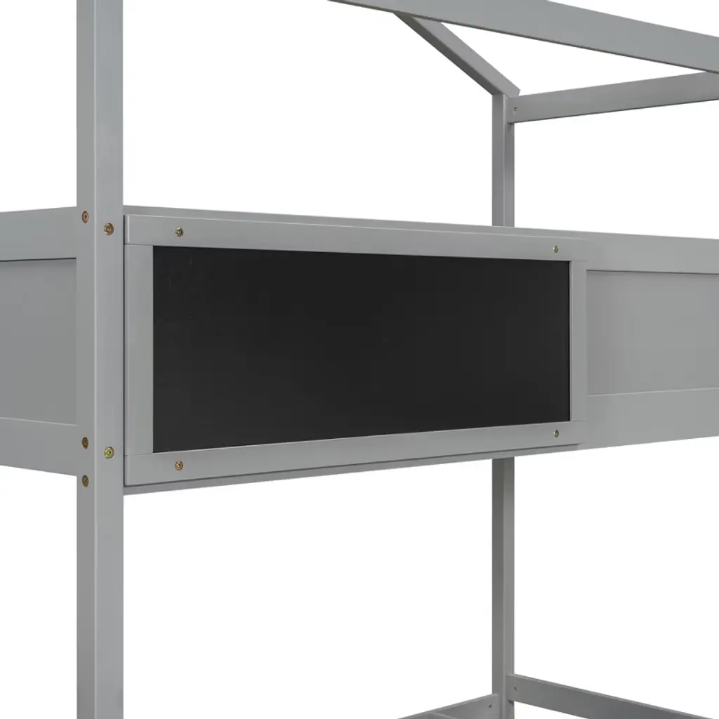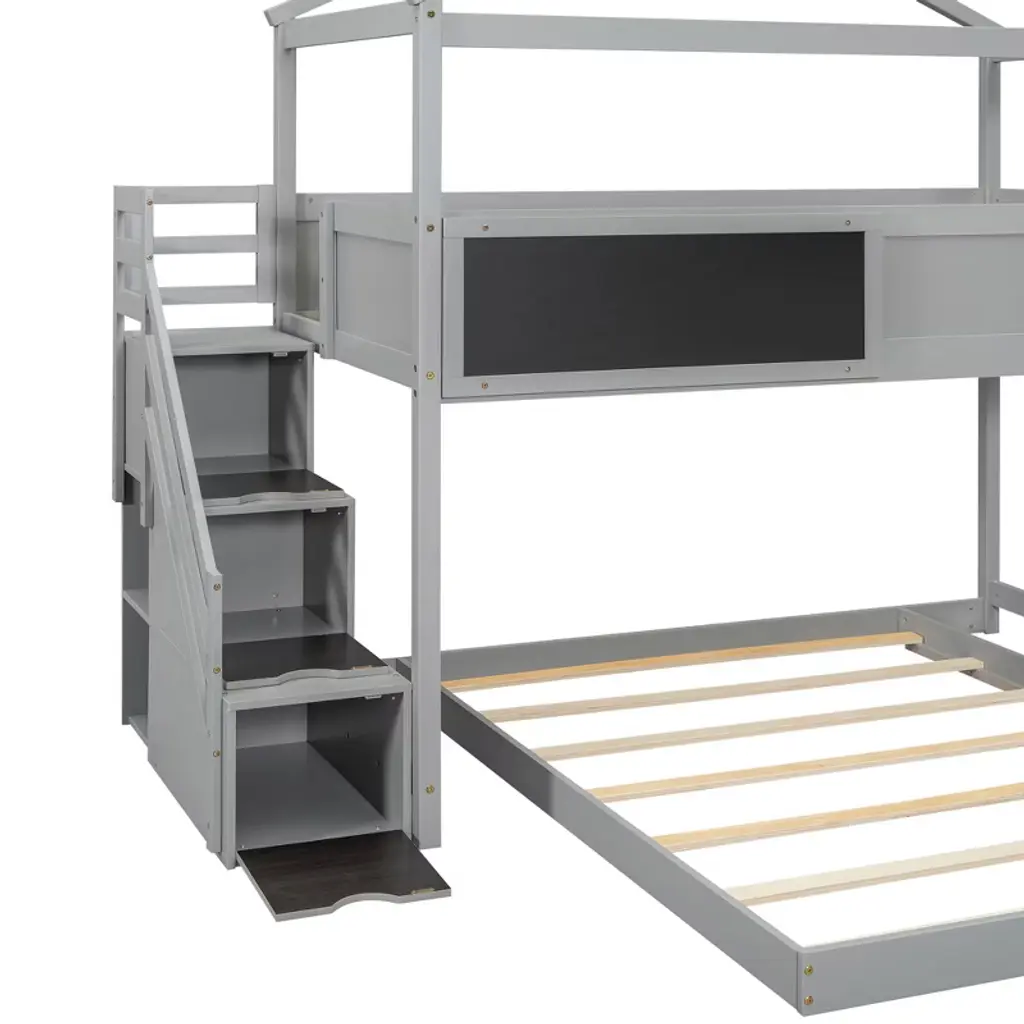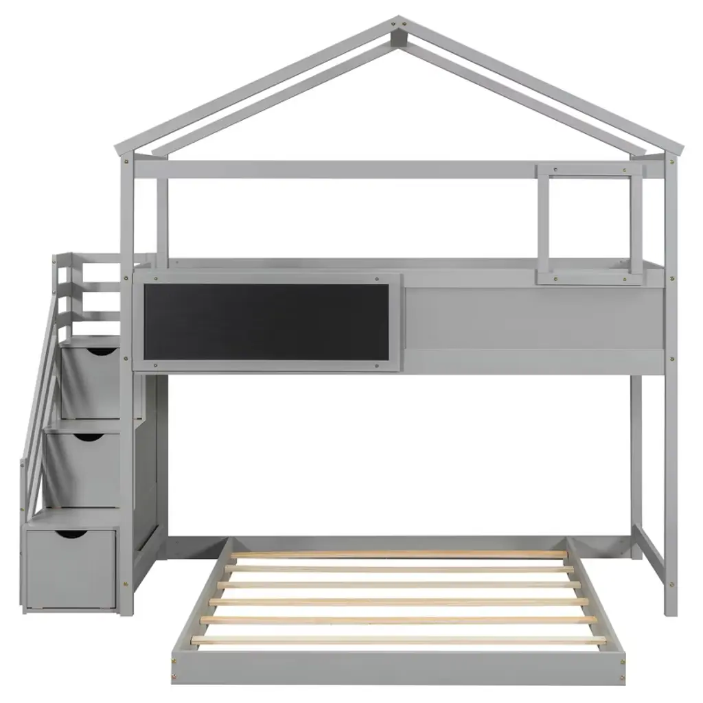 Twin Over Full House Bunk Bed With Storage Stairs And Blackboard, House-shaped Bunk Beds Frame With Roof And Window For Kids, Gray