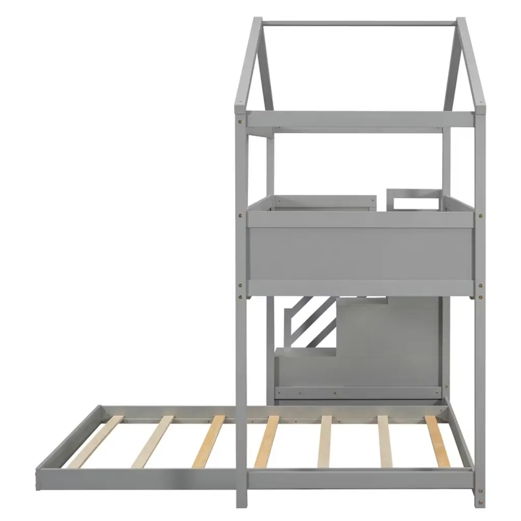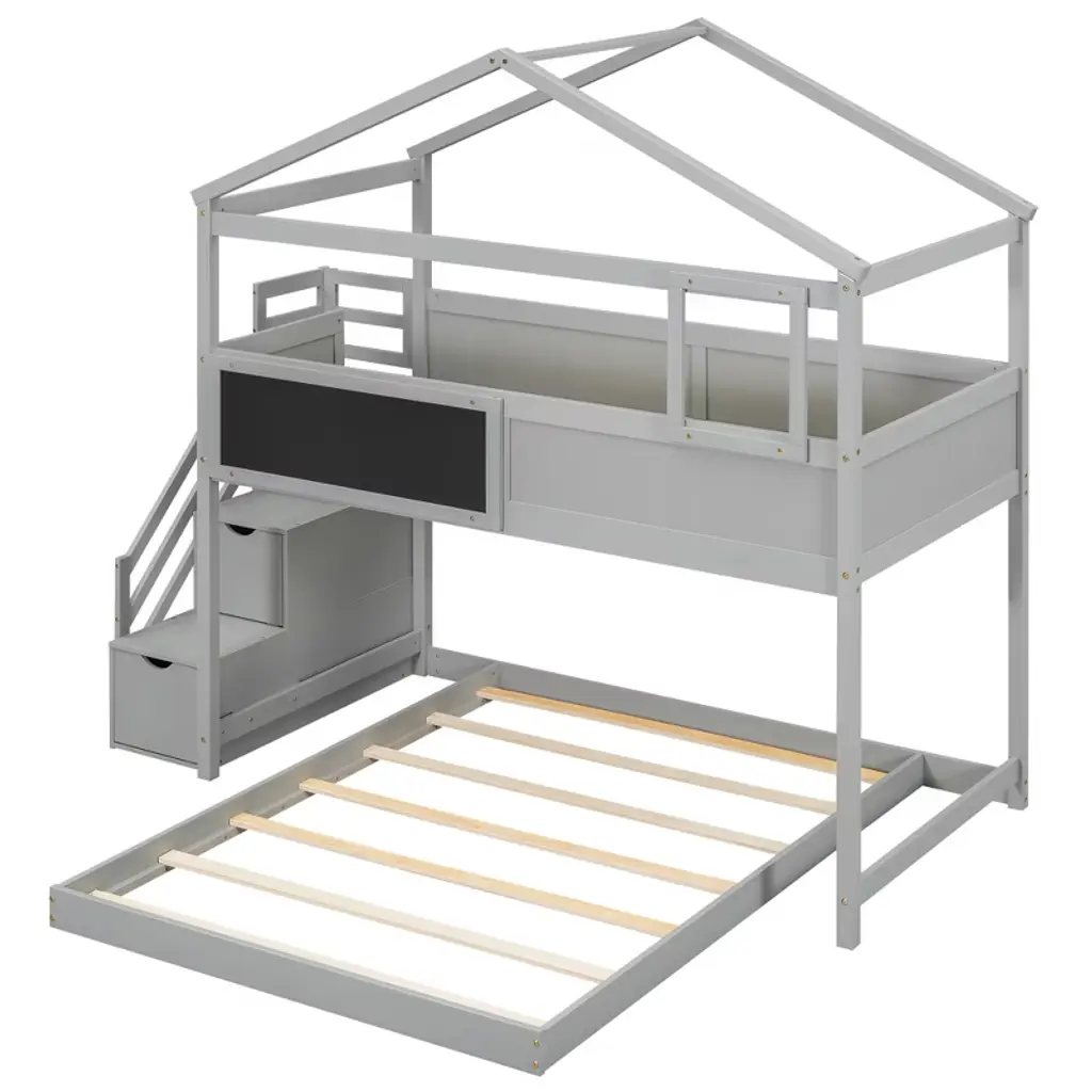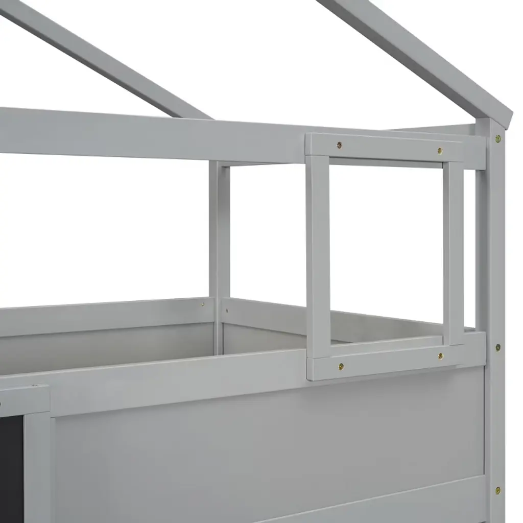 Twin Over Full House Bunk Bed With Storage Stairs And Blackboard, House-shaped Bunk Beds Frame With Roof And Window For Kids, Gray