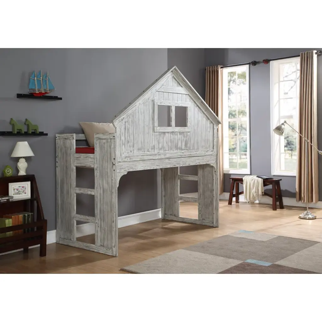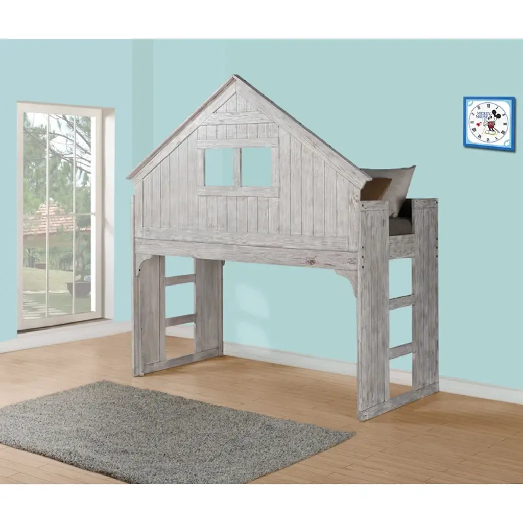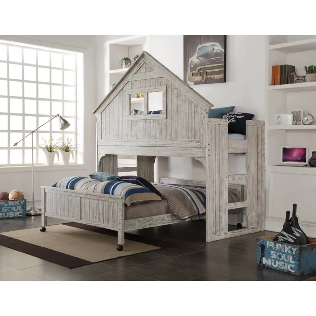 A home within a home, this distinctive bunk bed set brings chic barnyard style to your little one's bedroom. Constructed from pine with a driftwood finish, its upper twin bunk features a house facade, complete with a window cutout perfect for peering out of. Its coordinating full bed down below is equipped with casters for easy movement and can be used on its own as your child gets older, or moved from under the top bunk to reveal a lofted area perfect for staging as a play area.