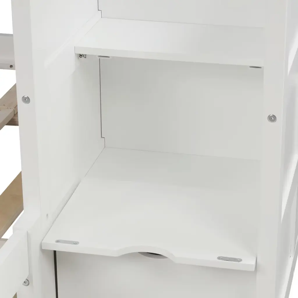 Product Features Space-saver: comes with drawers, staircase and inseparable under-bed drawers.Convenience: wheels attached to drawers makes it easy to pull in and pull out.Safety ensured: full-length guardrails and solid frame.3 Beds in 1: twin size upper bed and convertible twin/full size down bed.Assembly required Description With stairway attached to the bed, this kid-friendly bunk bed offers easy and safe access to the top bed. Full-length guardrails attached to the top bed ensure safety and a sturdy frame provides stability. The down bed can be converted from twin size to full size, allowing flexible use of it. The stairway comes with two drawers, along with the space-saving staircase and inseparable under-bed drawers with wheels that can store away other stuff. Truly an ideal space-saver, this bunk bed is a perfect choice for those in pursuit of being organized. Specification Material: Pine wood + MDFSize: Twin over twin/fullNumbers of package: 3Spring box: No needAssembly required: Yes Dimensions Overall Product Dimension: 94.4''L x 77.7''W x 63.6''HPackage Dimension: Please refer to the SpecificationTotal Height: 63.6''Overall Product Weight: 240 lbsUpper/Down Bed Weight Capacity: 400 lbsUpper Bed Mattress Thickness: 6''Down Bed Mattress Thickness: 8–10''